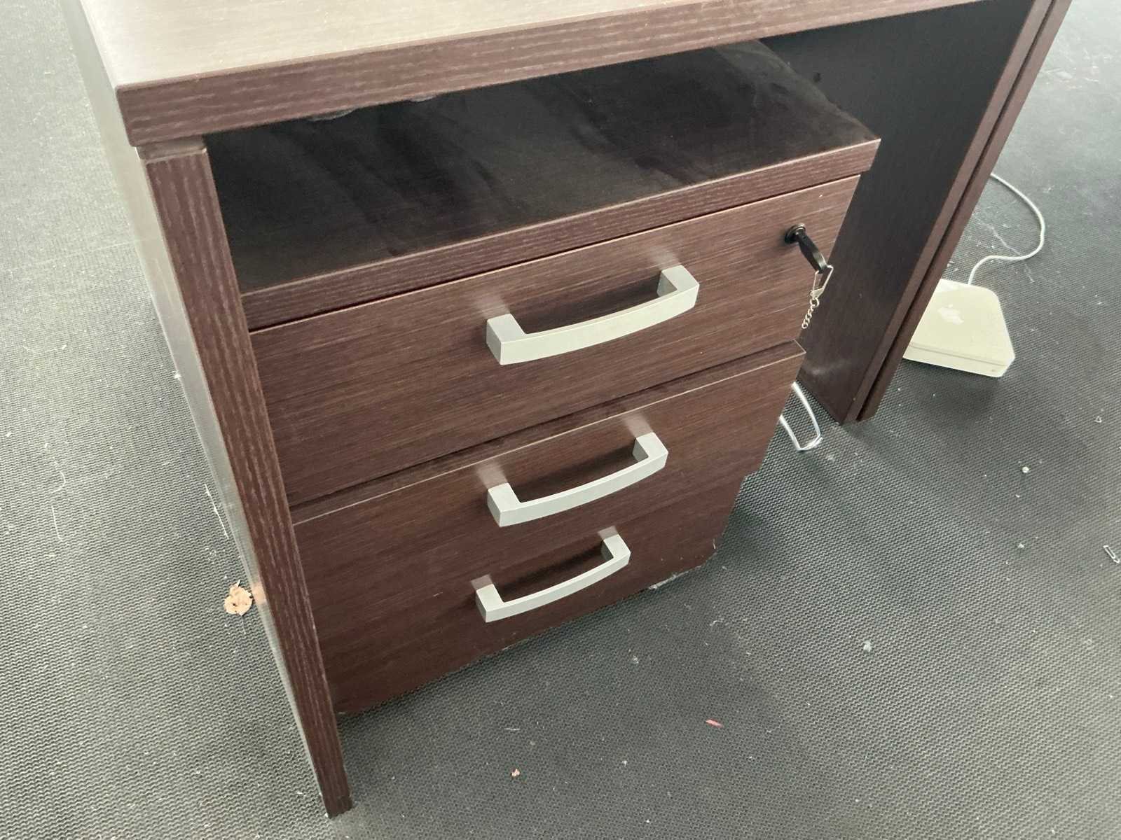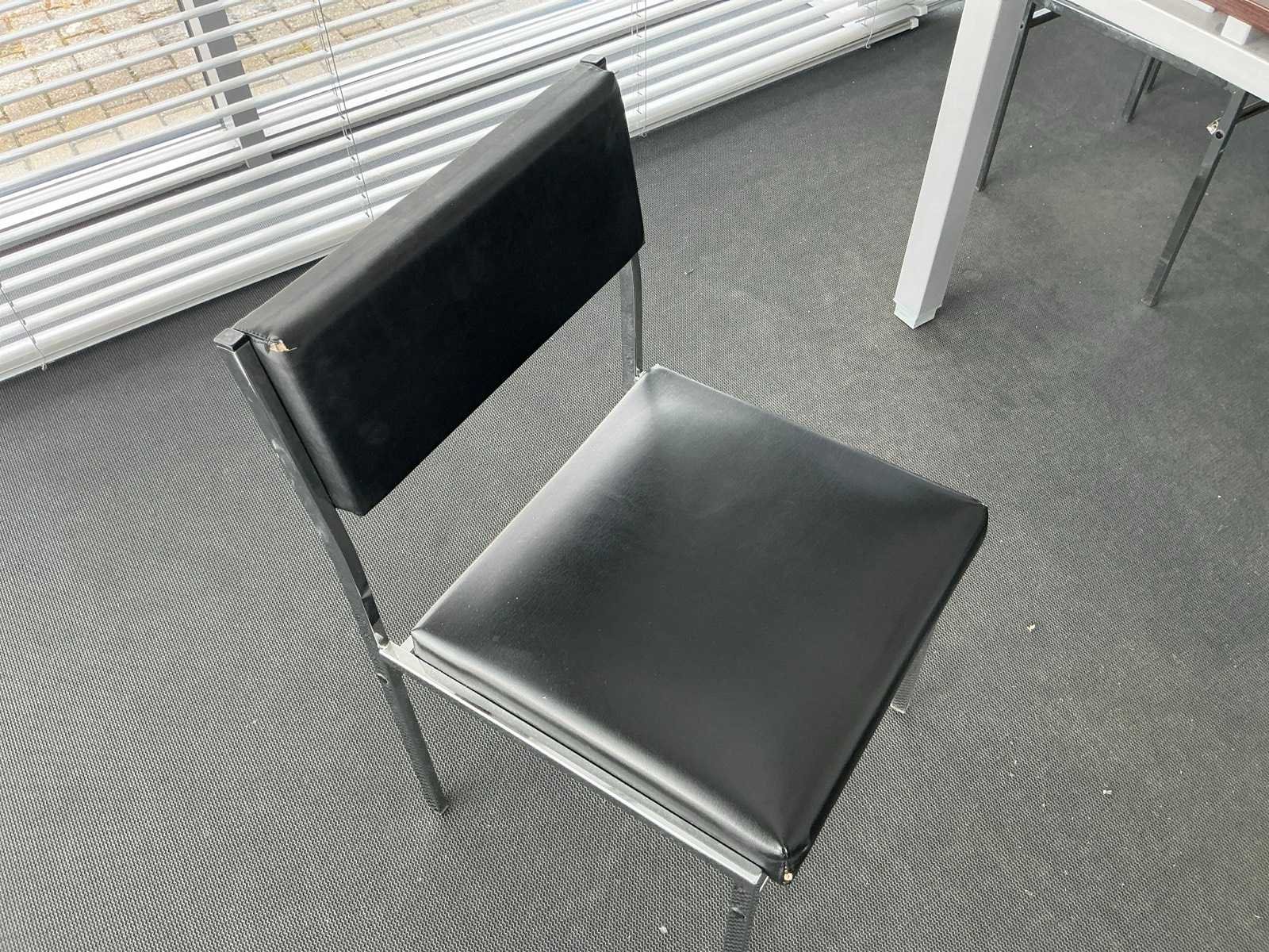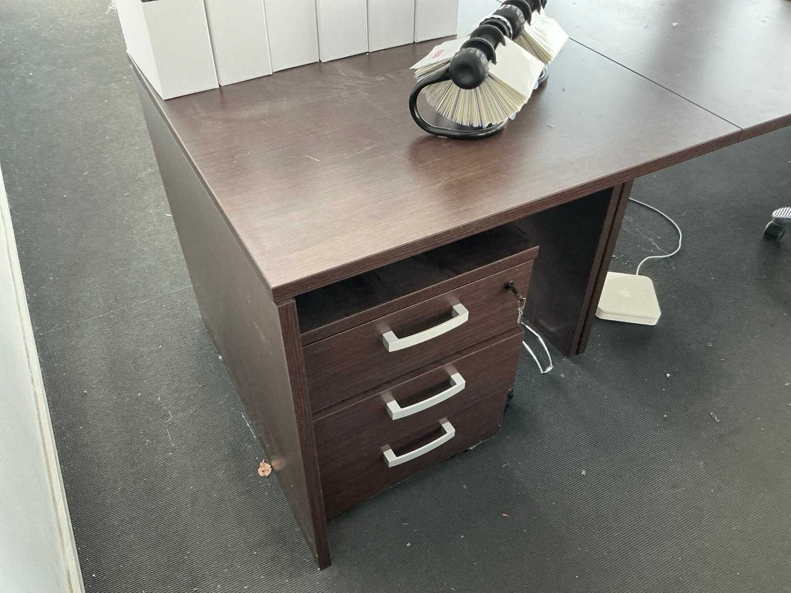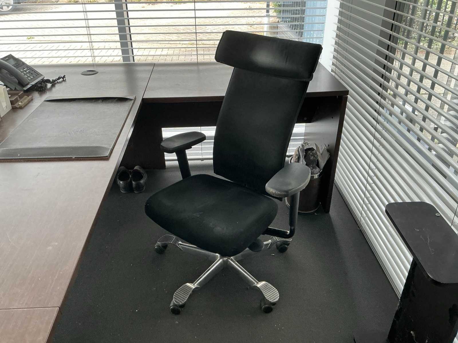 Bestaande uit: vergadertafel voorzien van metalen onderstel, afmeting: 150x120x74cm en L-vormige bureautafel 260x178x73cm met 3-schuifsladeblok, bureaustoel en 5x bijzetstoel voorzien van lederen bekleding Nee