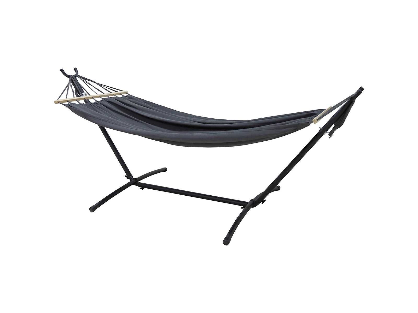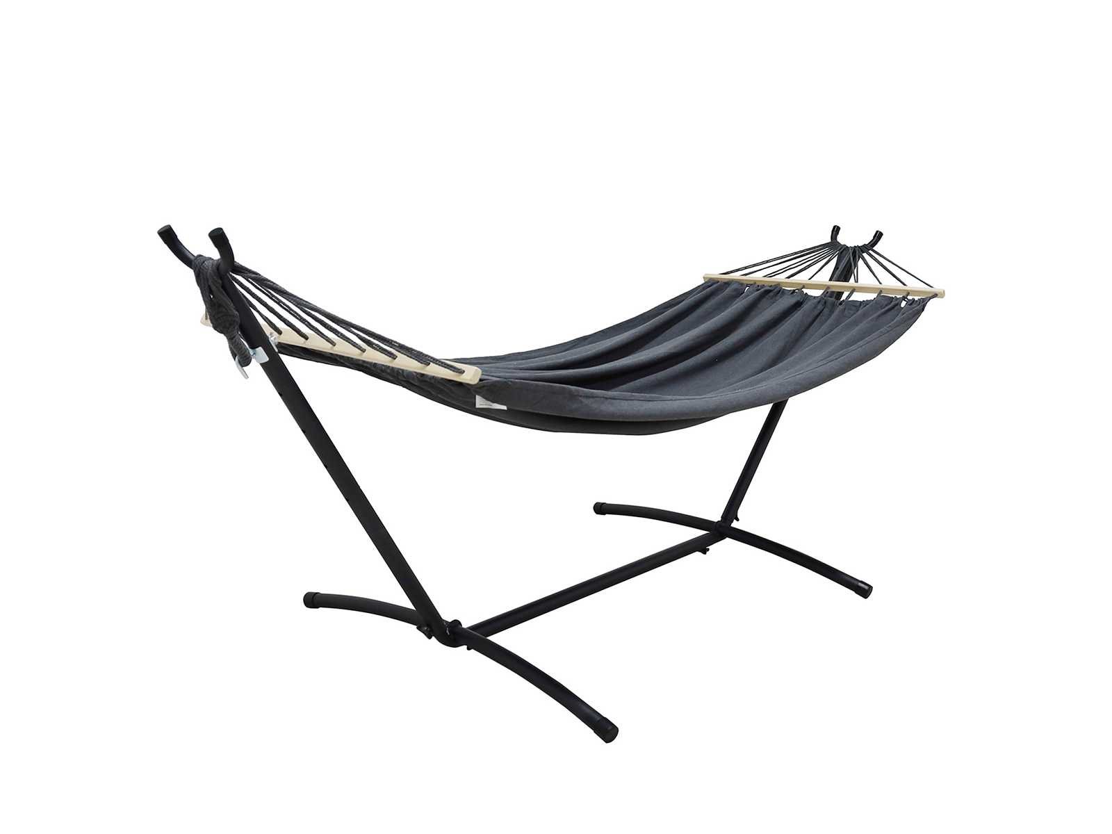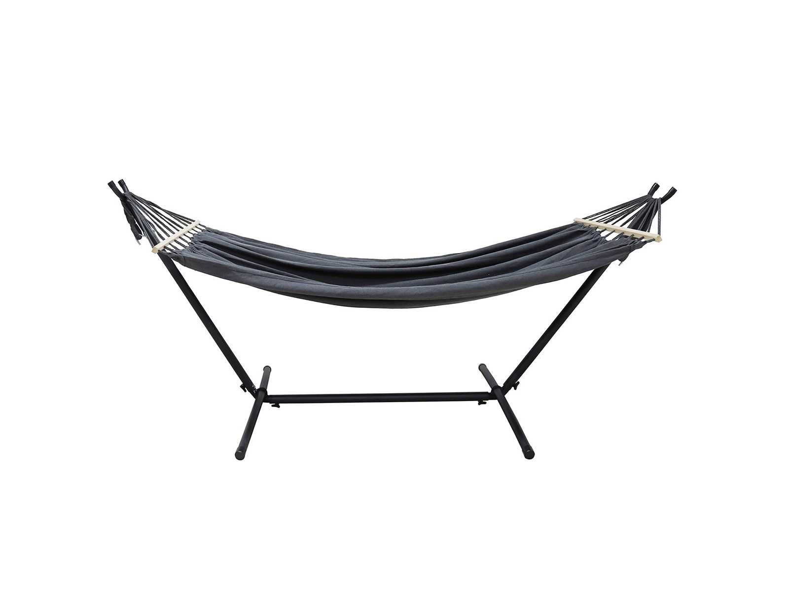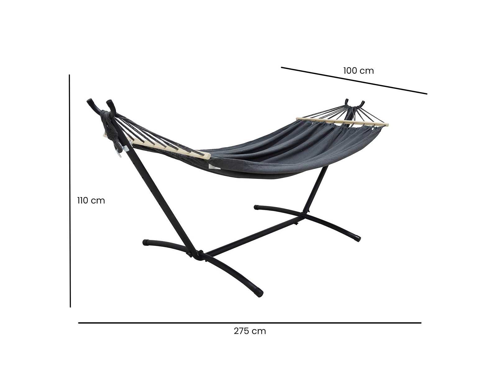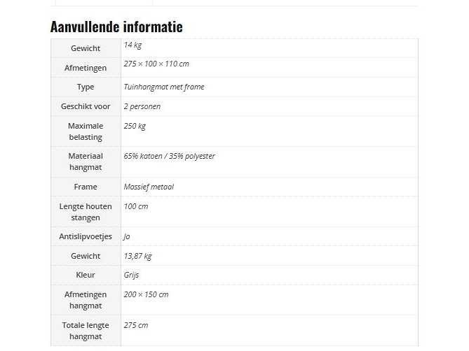 Gewicht 14 kg Afmetingen 275 × 100 × 110 cm Type Tuinhangmat met frame Geschikt voor 2 personen Maximale belasting 250 kg Materiaal hangmat 65% katoen / 35% polyester Frame Massief metaal Lengte houten stangen 100 cm Antislipvoetjes Ja Gewicht 13,87 kg Kleur Grijs Afmetingen hangmat 200 × 150 cm Totale lengte hangmat 275 cm No