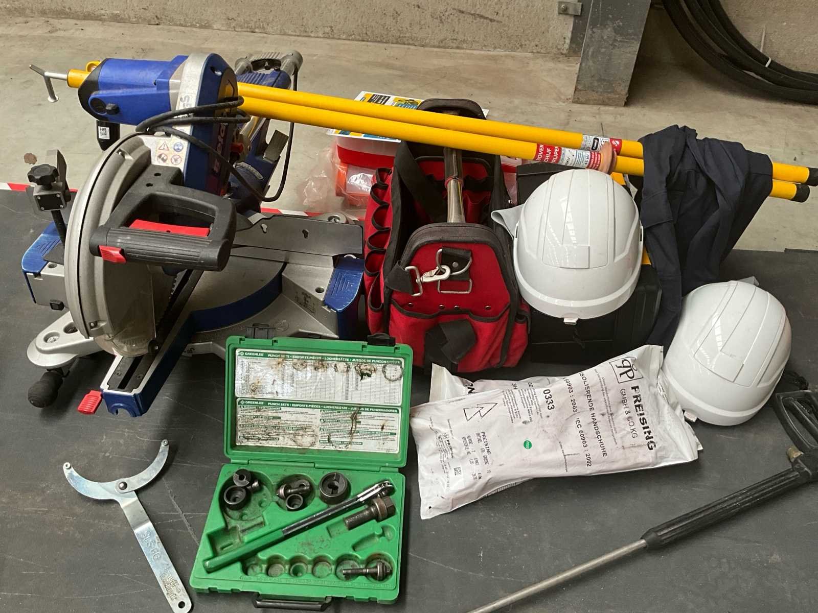 Partij divers werkplaatsgereedschap – afkortzaag en toebehoren