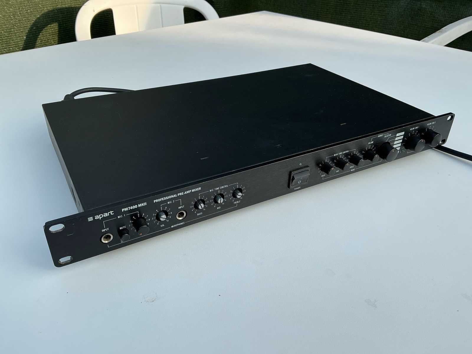 De APart MP7400MKII is een professionele 2‑zone voorversterker/mixer, ideaal voor horeca, winkels, kantoren, fitness, zalen en vaste geluidsinstallaties. Het toestel is gebruikt, maar volledig werkend en getest. Met 6 lijningangen, 2 microfooningangen, toonregeling, prioriteit en zone‑routing is dit een zeer veelzijdige en betrouwbare unit voor achtergrondmuziek en paging. Kenmerken - Professionele 2‑zone pre‑amp mixer - 6 lijningangen + 2 microfooningangen - VOX‑mute op microfoon 1 - 3‑band toonregeling - Prioriteit‑contact - 19” rackmount (1HE) - Staat: gebruikt maar werkend No Merk: Apart Model: MP7400MKII