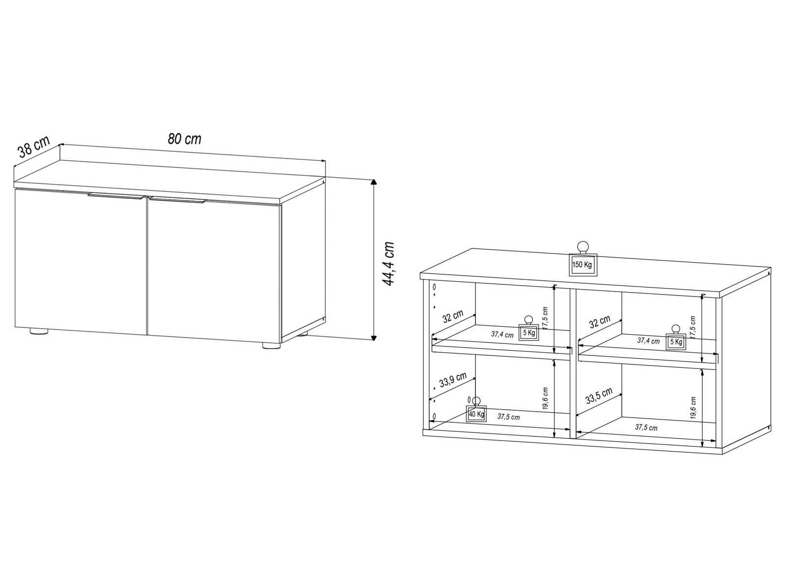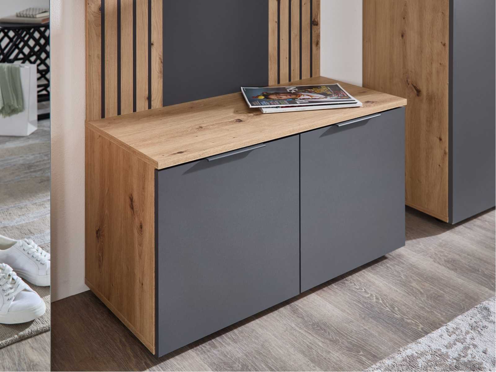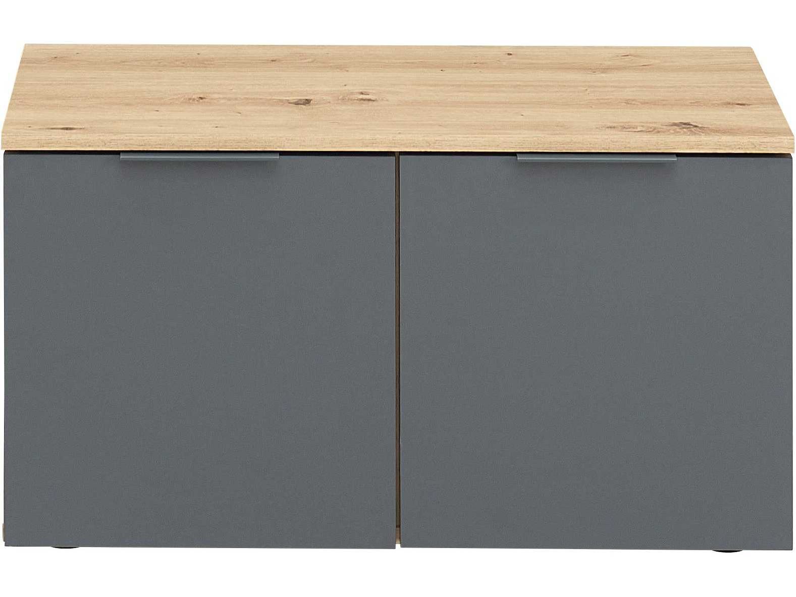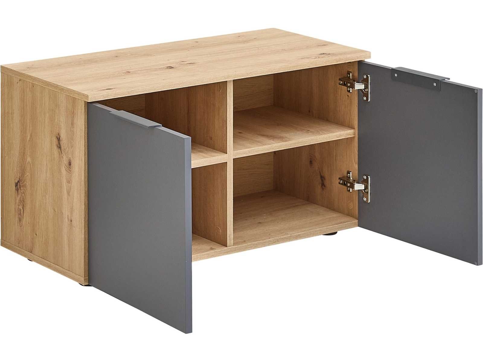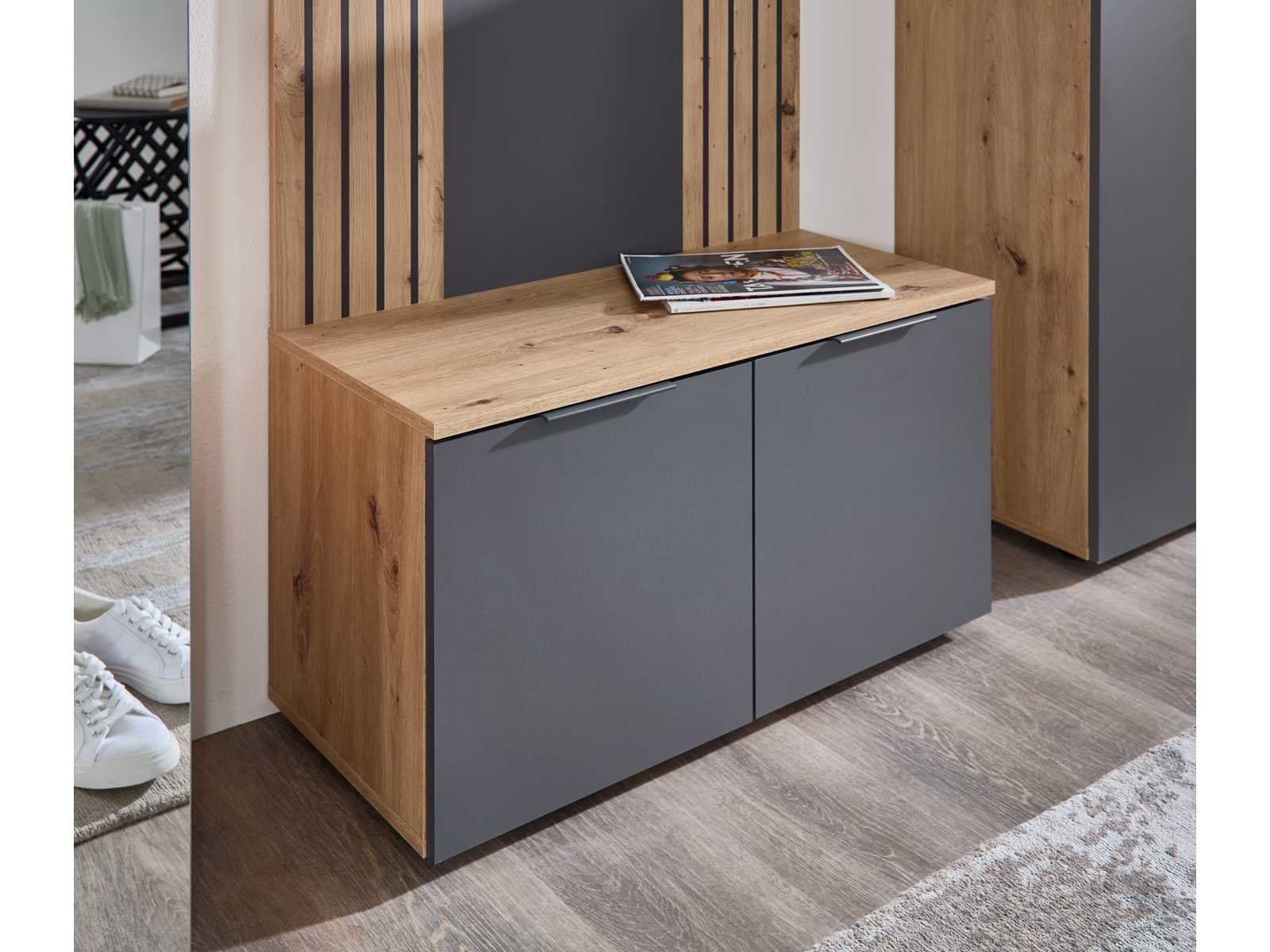 Gangbank met een smaakvolle kleurcombinatie Antraciet voorkant en versierde body in handgemaakt eikenhout Zwarte plastic handgrepen, 2 deuren en 2 planken Afmetingen (B x H x D): 80 x 44 x 38 cm, maximale toegestane belasting op de bovenste plank: 50 kg De kast is gemaakt van hout bedekt met melamine, een robuust en duurzaam materiaal dat de kwaliteit garandeert. Non
