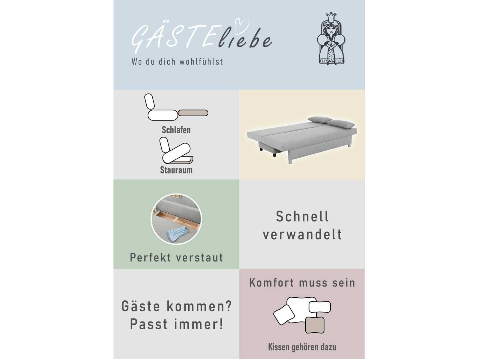 VEELZIJDIGE RUIMTEBESPARING – Deze slaapbank combineert een bank en een extra bed in een compacte ruimte – ideaal voor flexibele leefruimtes en het ontvangen van gasten. BANK VOOR DE BESTE PRIJS – Uitschuifbare bedfunctie en opbergkist voor dekens of kussens – allemaal geïntegreerd in één slim meubelstuk, zonder extra kosten voor aparte oplossingen. ORDE EN FUNCTIONALITEIT IN ÉÉN – De bedkast creëert een discreet opbergruimte en houdt je woonkamer netjes, zonder extra meubels. EENVOUDIGE EN COMFORTABELE VERZORGING – De easy-care stoffen hoes is zowel duurzaam als comfortabel – dagelijks gebruik tegen een lage prijs. FLEXIBEL IN DE KAMER – Achterin gestoffeerd, vrij te positioneren zonder visuele compromissen. Non
