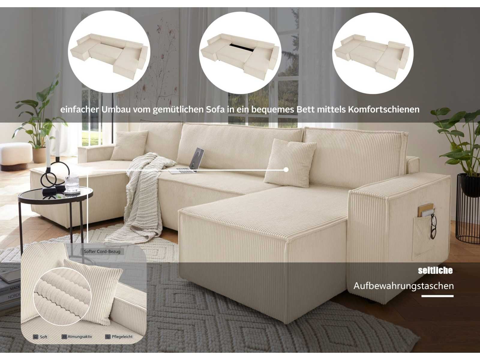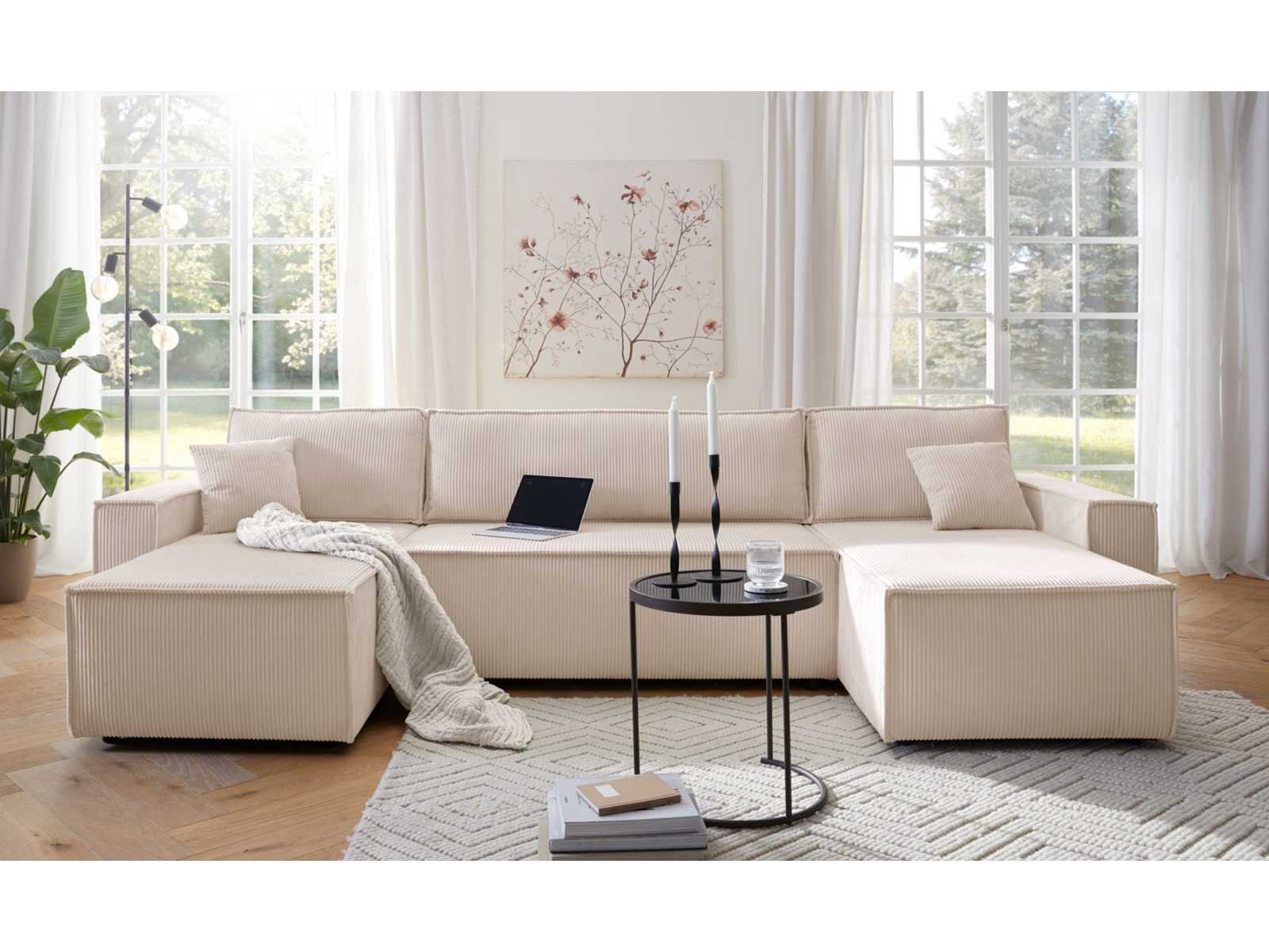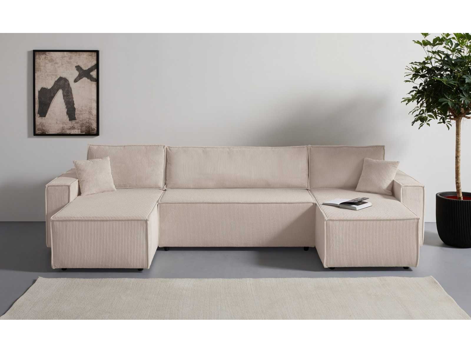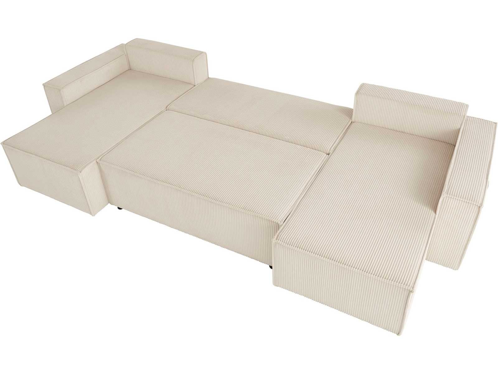 Sofa met pocketveerbekleding. Gelijkmatig gevoerde zitting en rugleuning. Comfort vergelijkbaar met dat van een matras. Slaapfunctie en opslagcompartiment inbegrepen. Dankzij de praktische metalen rails kan hij gemakkelijk ombouwen tot een comfortabele accentbank. Het beklede opbergvak biedt extra opbergruimte. Sofa bekleed met zacht corduroy, versierd met elegante biezen en met zijvakken voor gemakkelijke opslag. De U-vormige bank (breedte 311 cm) met een ruim slaapoppervlak (133/270 cm) is eenvoudig in elkaar te zetten en biedt genoeg ruimte voor elke gast – een ideale oplossing voor uw woonruimte. Twee gratis decoratieve kussens zijn inbegrepen; dit model is ook verkrijgbaar als een L-vormige gestoffeerde hoekbank. Non