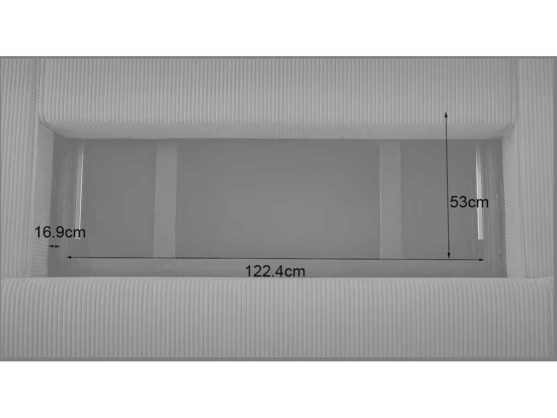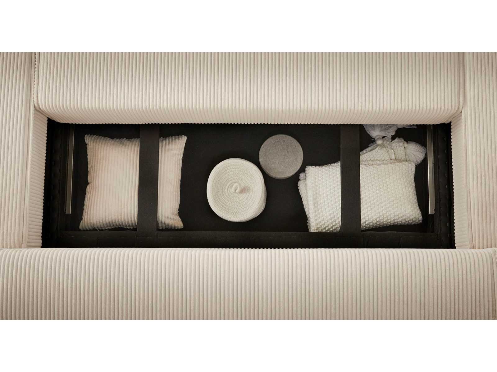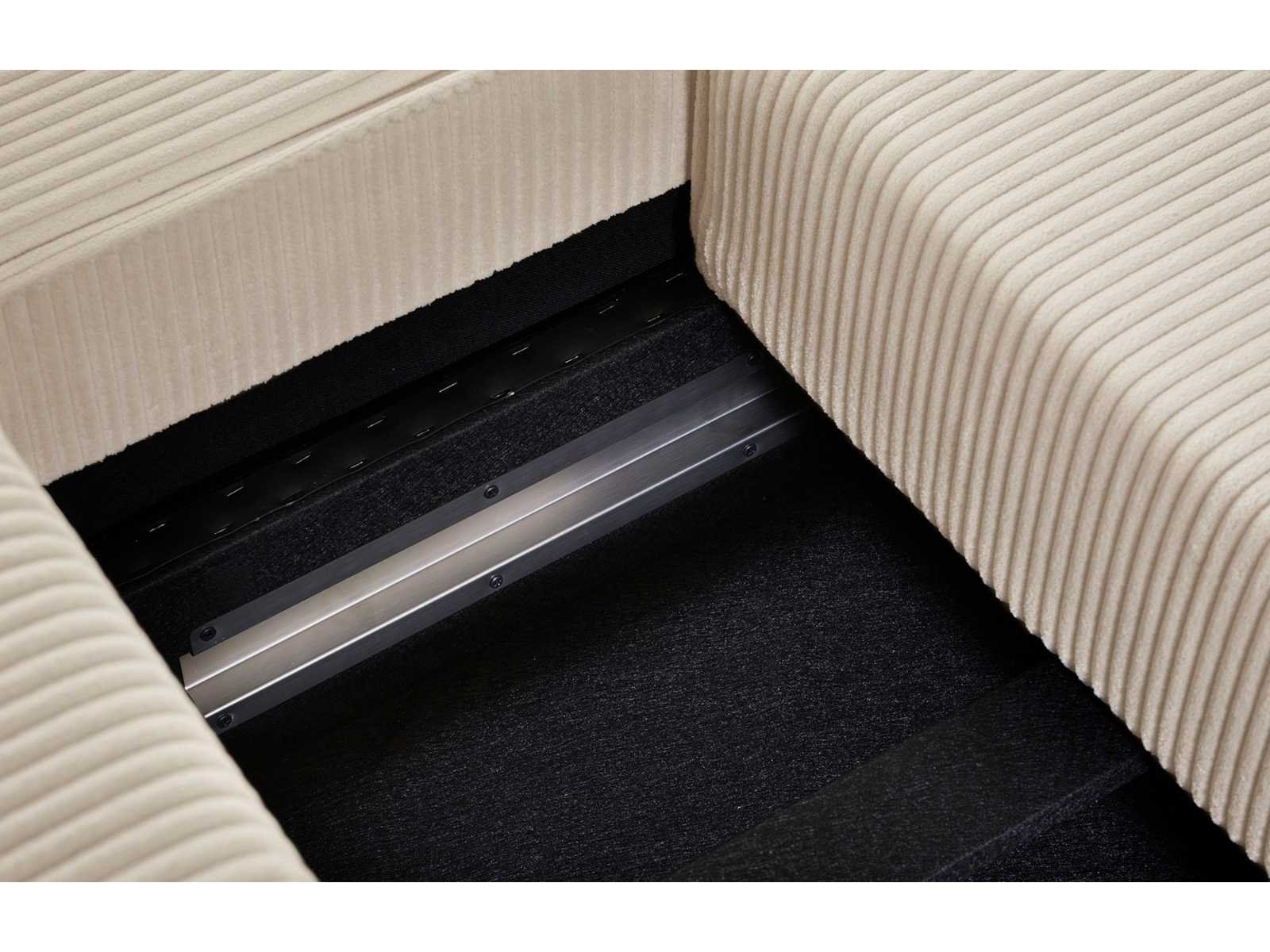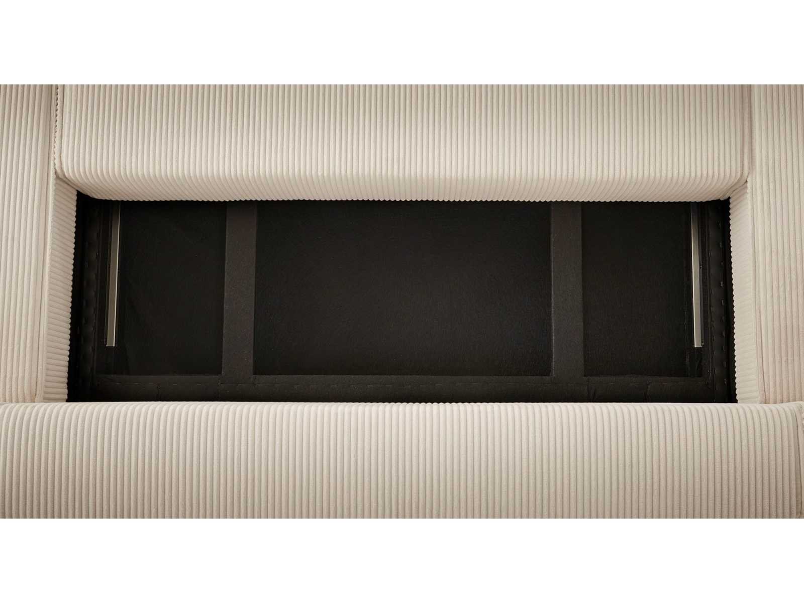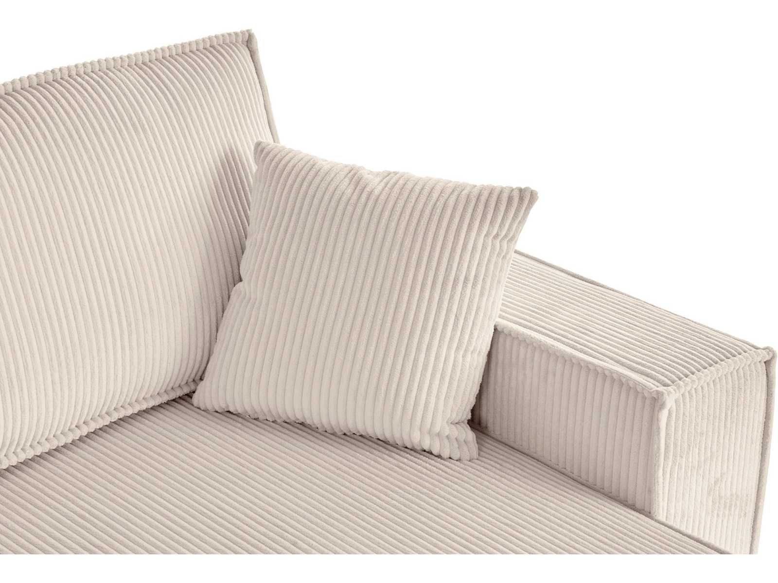 Sofa met pocketveerbekleding. Gelijkmatig gevoerde zitting en rugleuning. Comfort vergelijkbaar met dat van een matras. Slaapfunctie en opslagcompartiment inbegrepen. Dankzij de praktische metalen rails kan hij gemakkelijk ombouwen tot een comfortabele accentbank. Het beklede opbergvak biedt extra opbergruimte. Sofa bekleed met zacht corduroy, versierd met elegante biezen en met zijvakken voor gemakkelijke opslag. De U-vormige bank (breedte 311 cm) met een ruim slaapoppervlak (133/270 cm) is eenvoudig in elkaar te zetten en biedt genoeg ruimte voor elke gast – een ideale oplossing voor uw woonruimte. Twee gratis decoratieve kussens zijn inbegrepen; dit model is ook verkrijgbaar als een L-vormige gestoffeerde hoekbank. Non