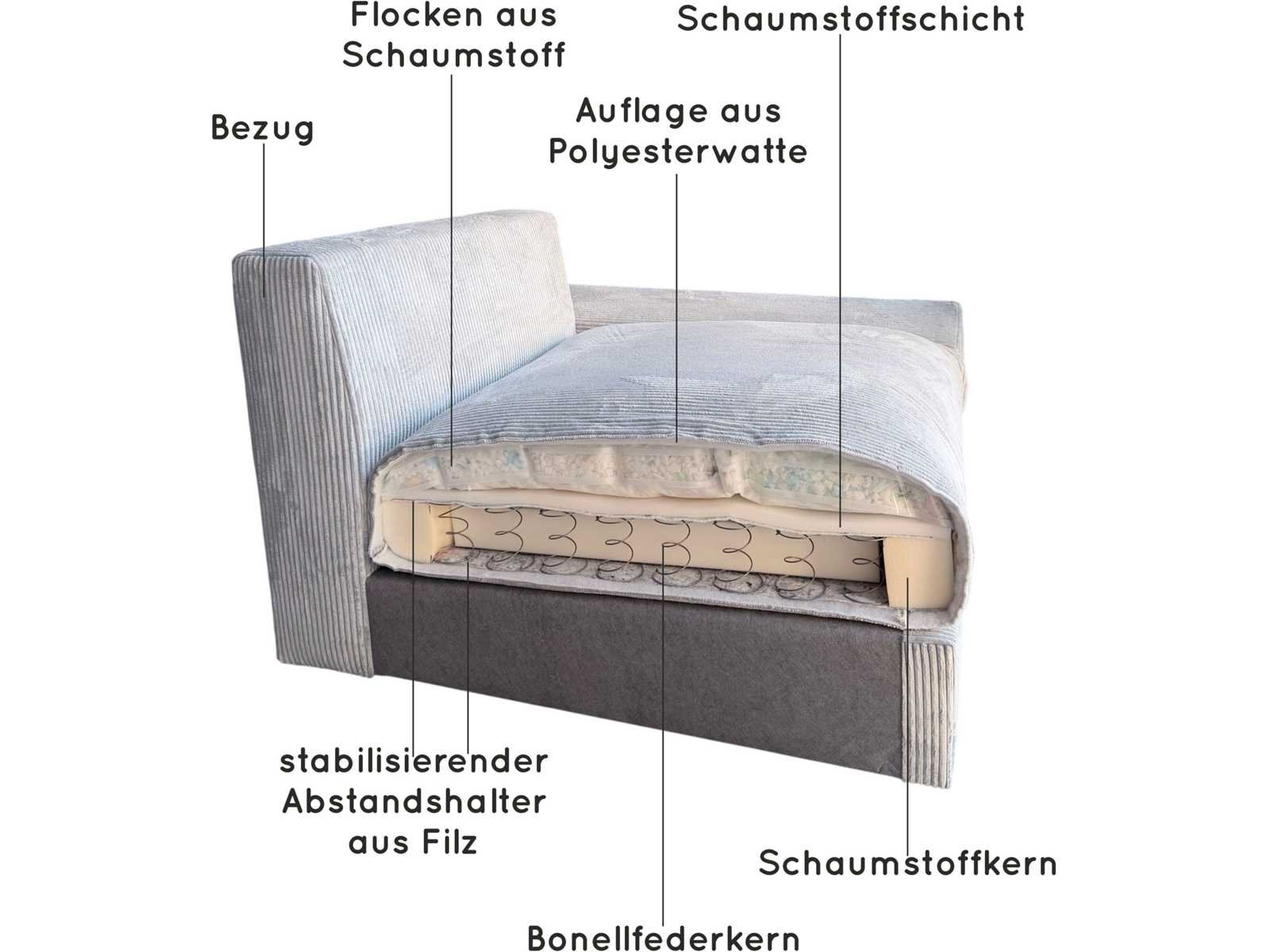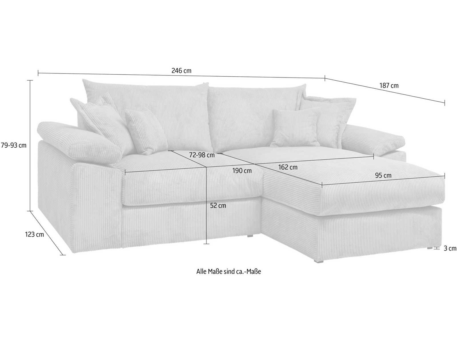 Kenmerken en functies Positioneringsoptie De loungestoel kan aan beide zijden worden gemonteerd Veerkerncoating-type Gestoffeerde meubelconstructie Veerkern , PUR-schuim, Paddering , schuimvlokken vullen Aantal zitkussens 2 Type zitkussen: Losjes Aantal rugkussens 2 stuks. Rugkussentype Losjes Aantal decoratieve kussens 4 Aantal armleuningskussens 2 Armleuningskussens van uitrusting, rugkussens, Decoratieve kussens Glider Art Feet Dichtheid 22 30 kg/m³ Aantal zitplaatsen, 3 kamers. Aantal armleuningen 2 Maatregelen Breedte 246 cm diepte 187 cm Zithoogte 52 cm Diepe zitplaats: 72 cm minimale zitdiepte 72 cm Maximale zitdiepte 98 cm Brede chaise longue aan de voorkant 95 cm Diepe ligstoel 187 cm Diepe stoel loungestoel 162 cm Groot uitgestrekt gebied 98 cm Lengte van het liggende oppervlak 190 cm Beenhoogte 3 cm Bodemvrijheid 3 cm Rugsteunhoogte 79 cm Hoofdelement met een diepte van 123 cm Maximale hoogte 93 cm minimale hoogte 79 cm Gewicht 160 kg Laadvermogen per zitplaats 100 kg Hoogte van het liggende oppervlak 52 cm Opmerking over afmetingen Alle metingen zijn benaderaard. Materiaal Touwrelatie Schuurvaste coating 5 (Zeer goed) Gebonden paalformatie naar 5 (zeer goed) Basismateriaal: Houtgebaseerd materiaal, Massief hout PVC-voeten Het FSC-label® certificeert dat u door deze producten aan te schaffen voorbeeldig bosbeheer ondersteunt – in overeenstemming met de strikte sociale en economische normen van de Forest Stewardship Council® – en bijdraagt aan het behoud van bosbronnen. (Achterkant: Kwaliteit van de originele hoes) Informatie over de samenstelling van het 100% polyester materiaal Schuurvaste coating 35.000 wascycli Kleur Crèmekleur Zwarte benen Non