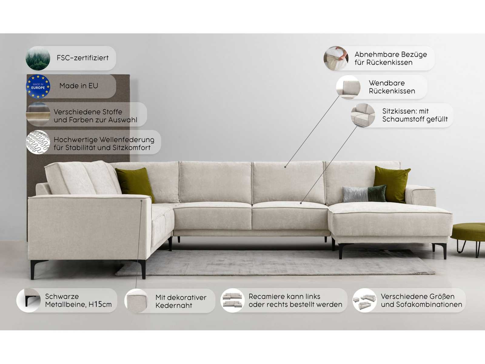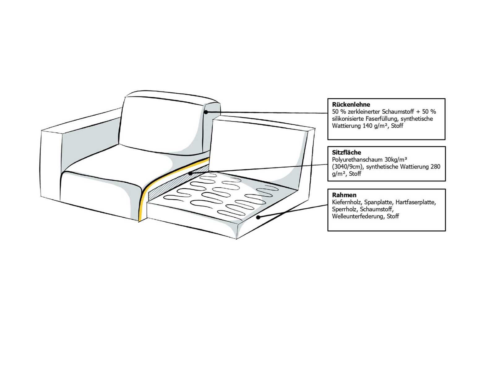 Kenmerken en functies Optie voor de positie van de rechter ligstoel Coatingtype Polyether schuimvulling met golvende basis Gestoffeerde meubelconstructie Wave spring suspension Aantal zitkussens 6 Zitkussentype stevig Aantal rugkussens 7 stuks. Rugkussentype Losjes Rugkussen van uitrusting Dichtheid 35 kg/m³ Aantal zitplaatsen: 6 kamers. Aantal armleuningen 2 Maatregelen Breedte: 342 cm diepte 260 cm Hoogte 85 cm Zithoogte 45 cm Diepe zitplaats 52 cm minimale zitdiepte 52 cm Maximale zitdiepte 67 cm Brede chaise longue aan de voorkant, 104 cm. Diepe ligstoel 152 cm Chaise longue met brede zitplaats 80 cm Chaise longue met diepe zitting 116 cm Breedte tussen de dijen: 151 cm Brede armleuningen 22 cm Diepe armleuningen 83 cm Armleuninghoogte 60 cm Beenhoogte 15 cm Bodemvrijheid 15 cm Rugkussenhoogte 40 cm Brede rugkussens 52 75 85 cm Diepe rugkussens 15 cm Opmerking over afmetingen Alle metingen zijn benaderaard. Materiaal Relatie met platte stof Paalvorming gerelateerd aan 4-5 (laag tot zeer laag) Carrosseriemateriaal Gedeeltelijk massief hout Basismateriaal: houtgebaseerd materiaal Voeten van metaalmateriaal Het FSC-label® certificeert dat u door deze producten aan te schaffen voorbeeldig bosbeheer ondersteunt – in overeenstemming met de strikte sociale en economische normen van de Forest Stewardship Council® – en bijdraagt aan het behoud van bosbronnen. (Achterkant: Originele referentiekwaliteit) Informatie over de samenstelling van het 100% polyester materiaal Schuurvaste coating 25.000 wascycli Kleur Balkkleur Houd er rekening mee dat de kleuren van de items die op de online afbeeldingen worden getoond, kunnen verschillen van de originele kleuren op uw scherm. Zwarte benen Non