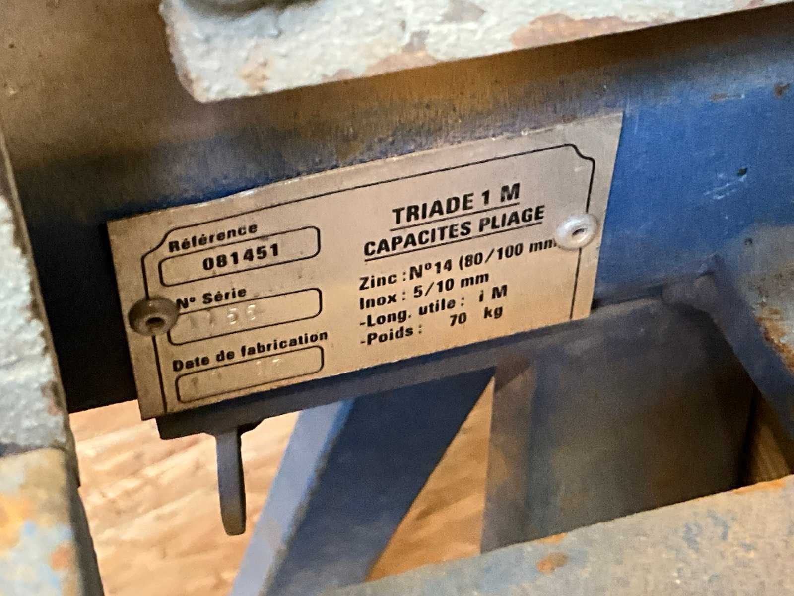 Werk Capaciteit 5-10 mm, werkbreedte maximaal 1 meter, + plaat snijtoestel Nee Merk: Triade Model: 1M Gewicht: 70kg Lengte: 60cm Breedte: 130cm Hoogte: 120cm