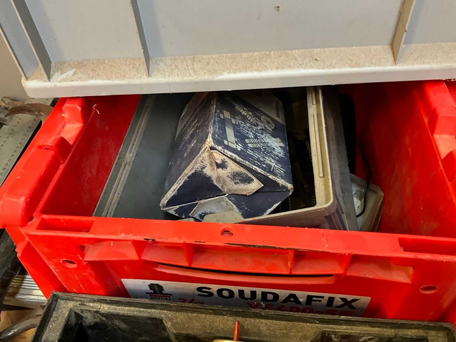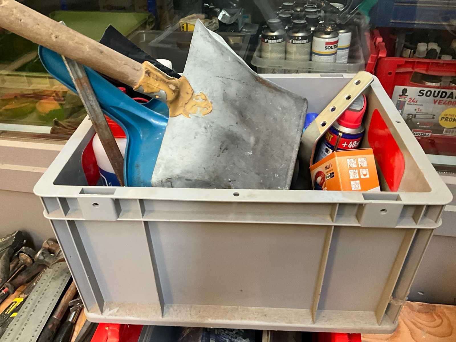 Bestaand uit 3x box met inhoud + los liggend waaronder winkelhaken, selicone pompen, Longo smittouw, hamers, houtbeitels Bahco enz.. Nee