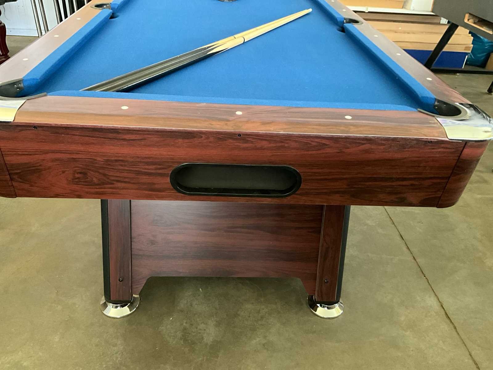 Metalen chrome regelpoten. deze zijn demonteerbaar. hoeken bovenaan afgewerkt met chroomaccenten. meubel is donkerbruin mahonie generfd met blauw laken. Ballencollector: ja, automatisch systeem. Nee Gewicht: 105