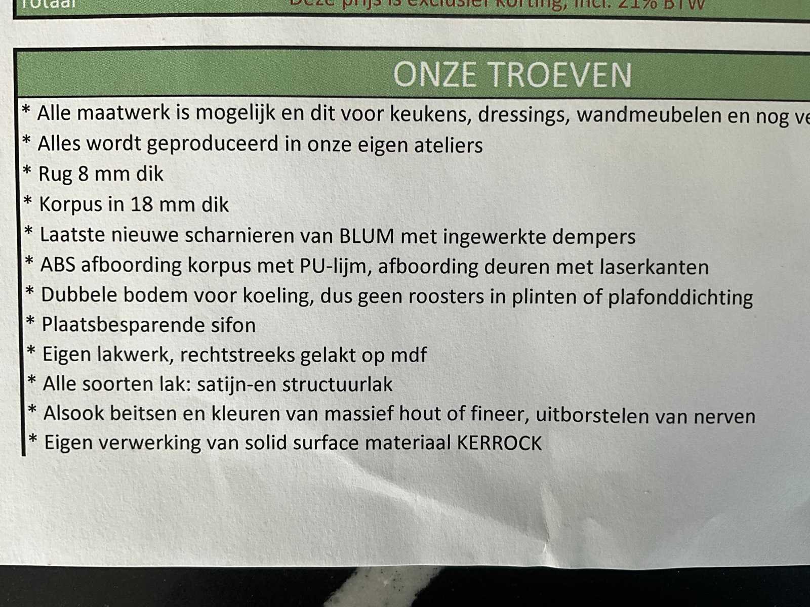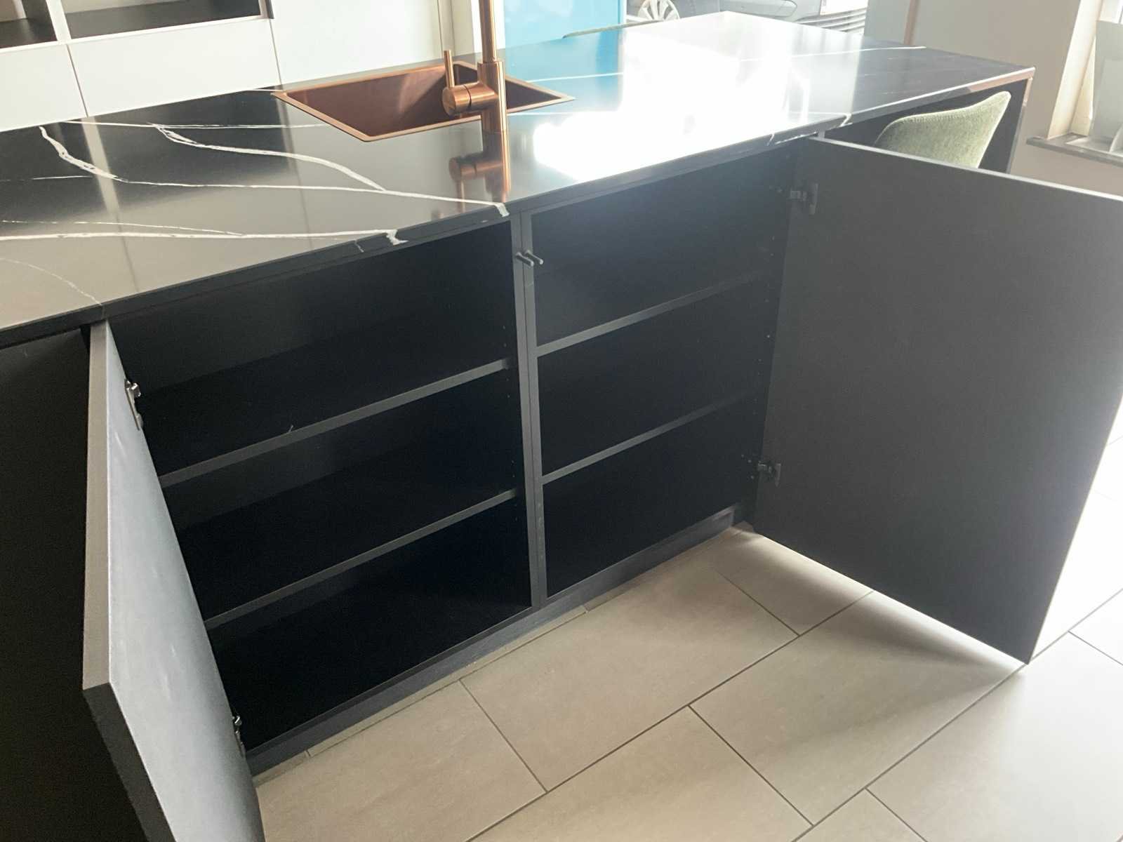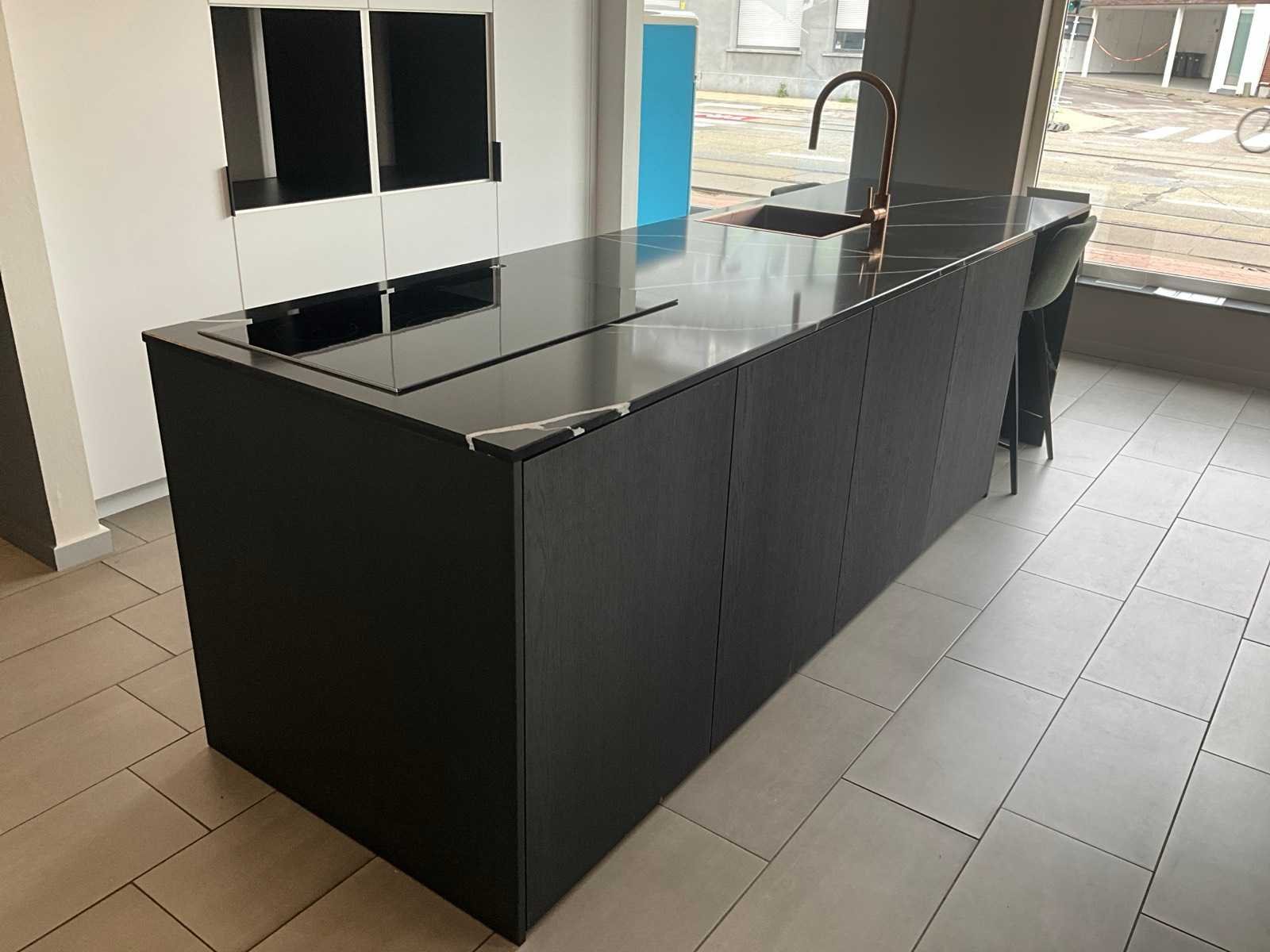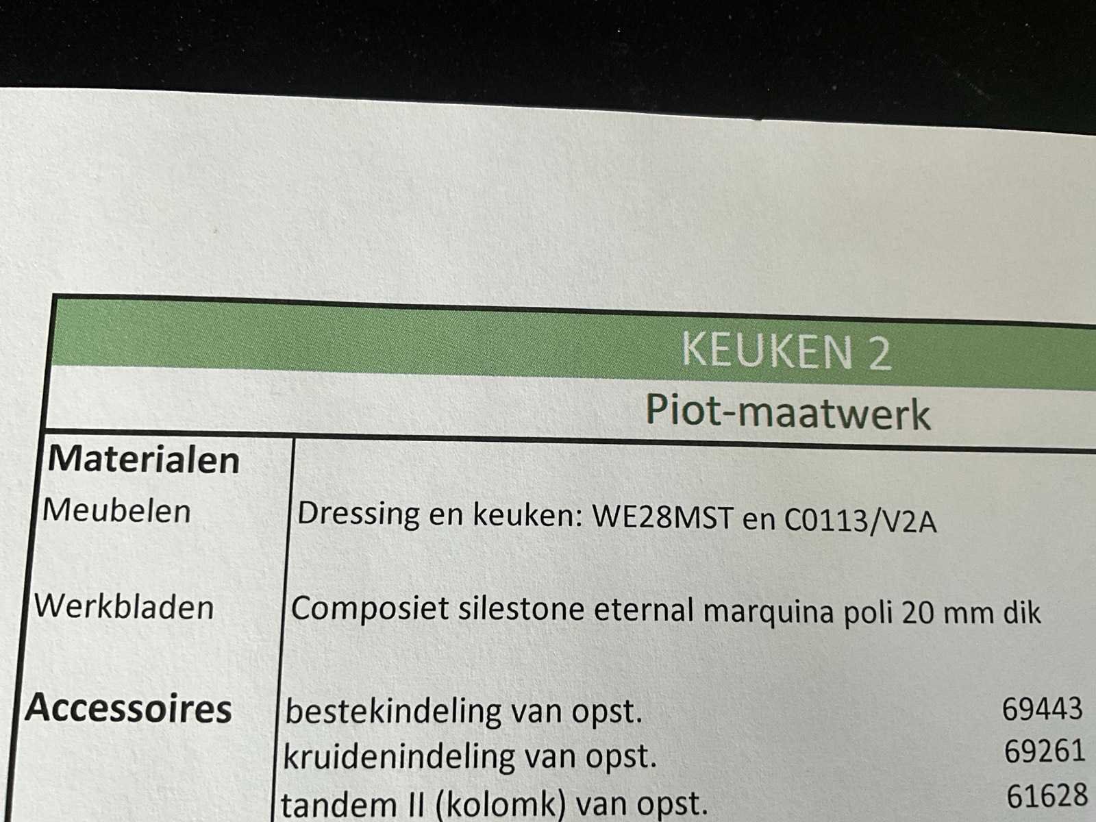 Meubelen : WE28MST en C0113/V2A Werkbladen Composiet silestone eternal Marquinhos poli 20 mm dik. Inclusief diverse toestellen waaronder spoelbak Lorreine SULOR40SPCOP, Kraan Franke 301953, Inductie kookplaat Siemens EX875LVC1E, inbouw koelkast Siemens Studio Line, inbouw vaatwasser Bosch SMV6ZB801E/17. Enkel bovenvermelde toestellen zijn inbegrepen in deze keukenopstelling. Wel compleet met 2 zitstoelen/krukken Danform en voorzien van diverse deurrekken en inhangbodems. Afmetingen eiland circa 305 x 90 x 93 cm hoog met 2 schuiven waaronder met 1 inbouwlade, 6 deuren; afmetingen extra kast circa 250 x 58 x 240 cm hoog met 6 deuren, 2 open inbouwvakken. ZIe ook grondplan op foto, enkel voor opstelling en afmetingen. Nee Type keukenopstelling: Keukeneiland en kast Kraan: Franke Gootsteen: Lorreine Fornuis: Siemens Koelkast: Siemens Softclose: true Vaatwasser: Bosch