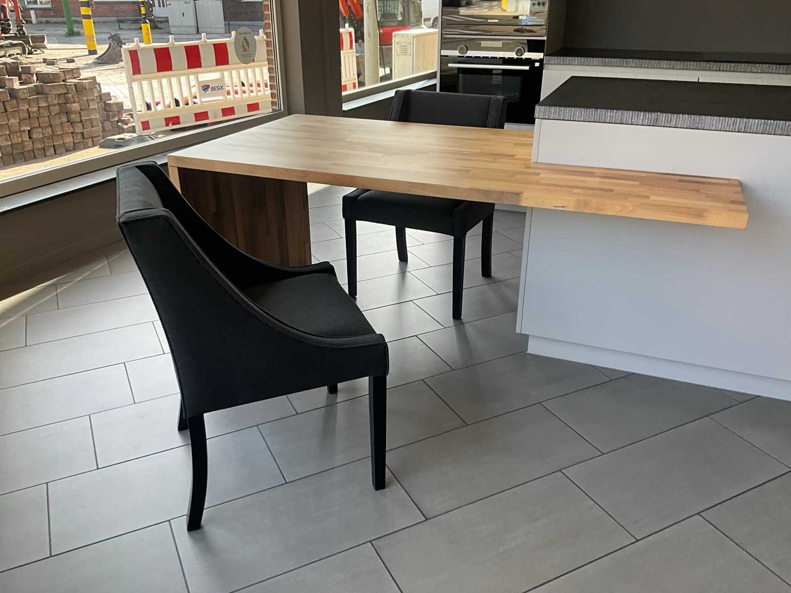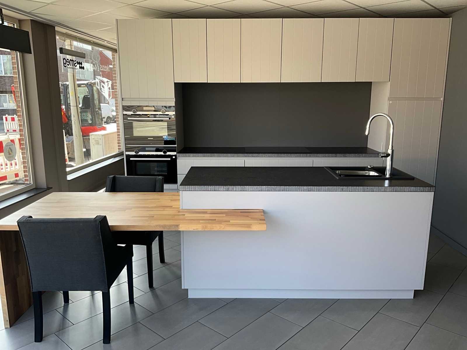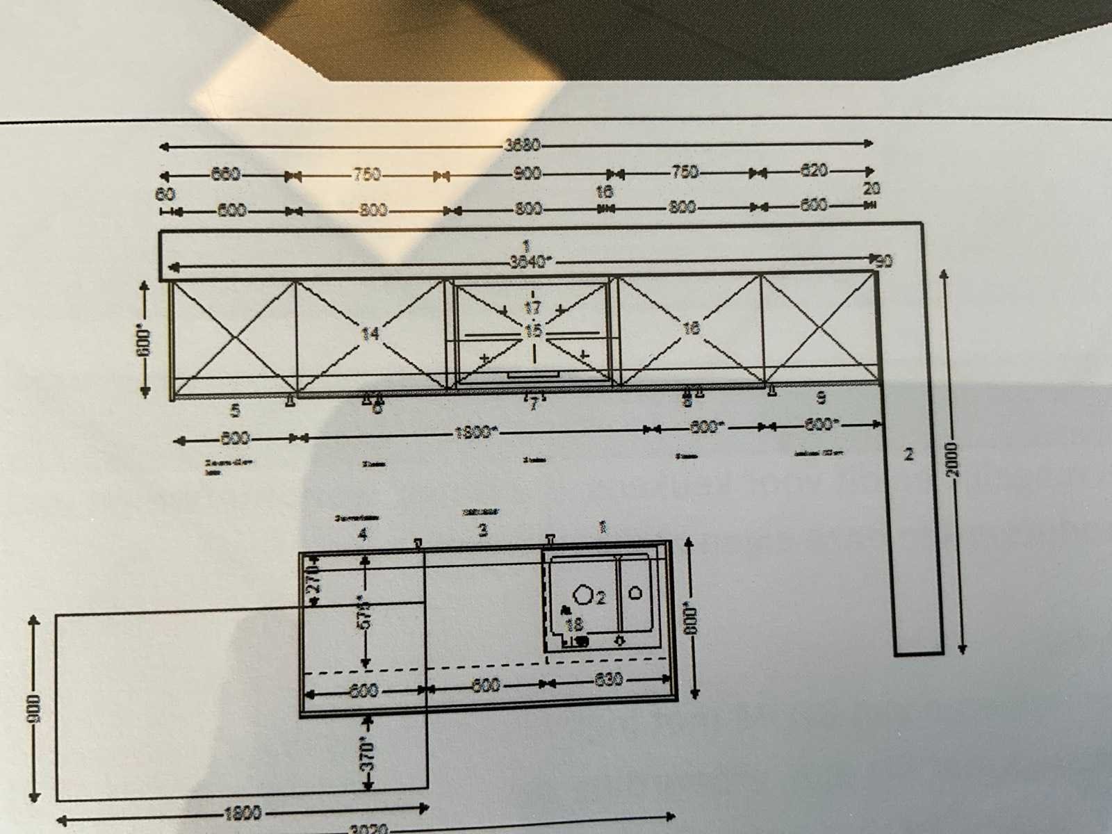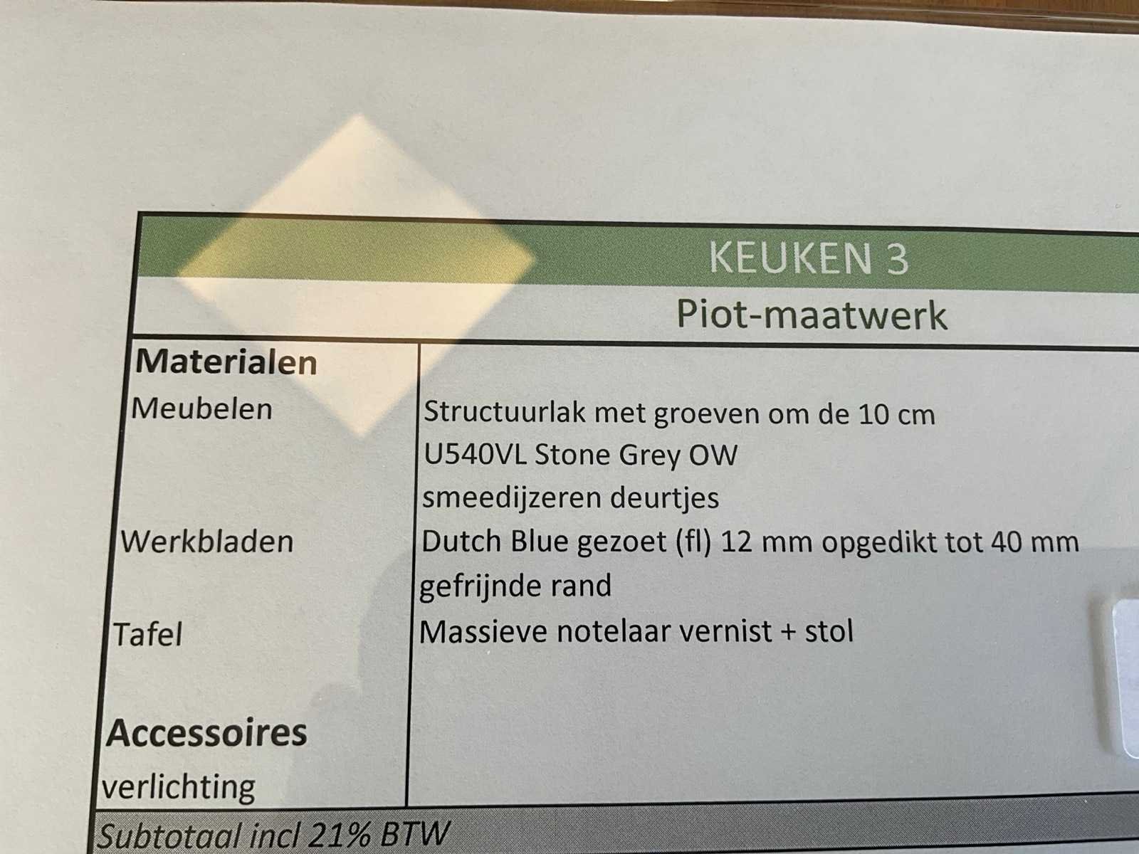 Meubelen : structuurlak met groeven om de 10 cm, U540VL Stone Grey OW, smeedijzeren deurtjes Werkbladen Dutch Blue gezoet (fl) 12 mm opgedikt tot 40 mm, gefijnde rand. Tafel massieve notelaar vernist + stol. Inclusief diverse toestellen waaronder spoelbak Aqua Linea SQC150-601, Kraan KVR X-Trend N 2451.21, Inductie kookplaat Novy 1726, inbouw koelkast Siemens KI41RAD30, inbouw vaatwasser Bosch SMD8TC800E/08, 2x Siemens waarvan 1 combi-micro CM585AMS0 en micro met stoom CO565AGS0 en inbouw dampkap Novy 6832. Enkel bovenvermelde toestellen zijn inbegrepen in deze keukenopstelling. Afmetingen eiland circa 305 x 118 x 93 cm hoog met 2 deuren waaronder met inbouwladen, 2 stoelen Westwing, afmetingen kast circa 362 x 60 x 240 cm hoog met 8 deuren en 10 schuiven, werkblad, afmetingen vitrinekast circa 124 x 40 x 240 cm hoog. ZIe ook grondplan op foto, enkel voor opstelling en afmetingen. Nee Type keukenopstelling: Keukeneiland en kast + vitrinekast Kraan: KVR Gootsteen: Aqua Linea Magnetron: Siemens 2x Fornuis: Novy Koelkast: Siemens Softclose: true Afzuigkap: Novy Vaatwasser: Bosch