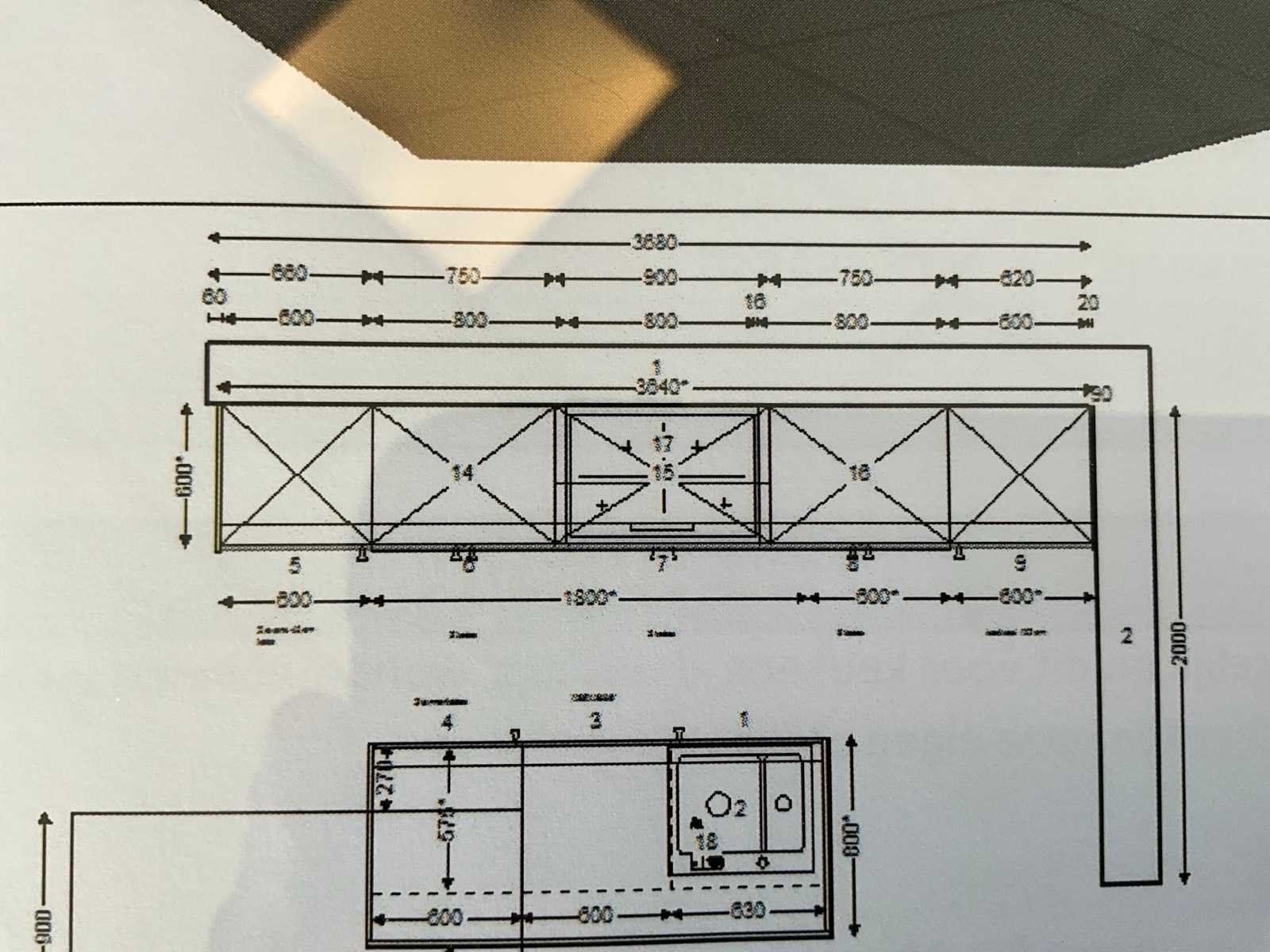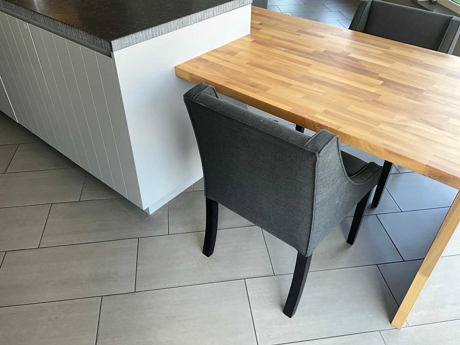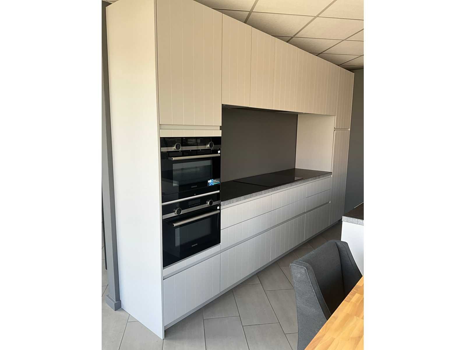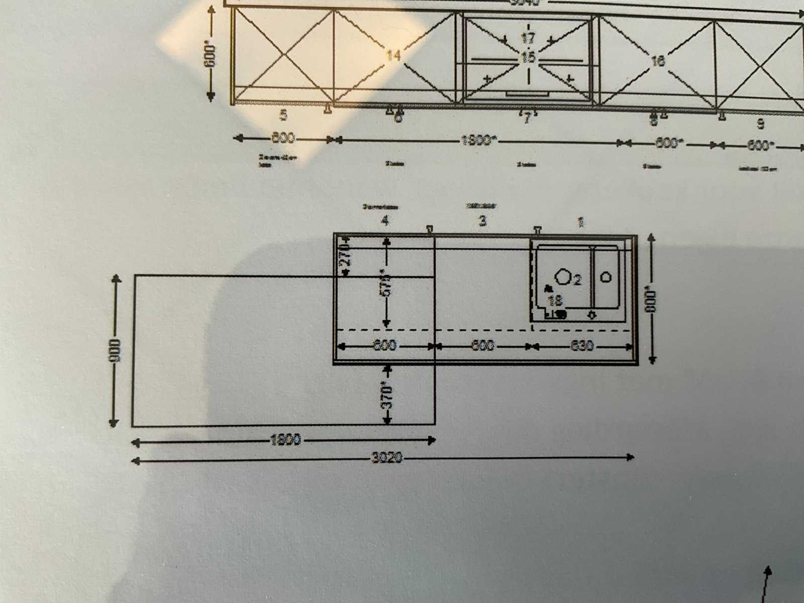 Meubelen : structuurlak met groeven om de 10 cm, U540VL Stone Grey OW, smeedijzeren deurtjes Werkbladen Dutch Blue gezoet (fl) 12 mm opgedikt tot 40 mm, gefijnde rand. Tafel massieve notelaar vernist + stol. Inclusief diverse toestellen waaronder spoelbak Aqua Linea SQC150-601, Kraan KVR X-Trend N 2451.21, Inductie kookplaat Novy 1726, inbouw koelkast Siemens KI41RAD30, inbouw vaatwasser Bosch SMD8TC800E/08, 2x Siemens waarvan 1 combi-micro CM585AMS0 en micro met stoom CO565AGS0 en inbouw dampkap Novy 6832. Enkel bovenvermelde toestellen zijn inbegrepen in deze keukenopstelling. Afmetingen eiland circa 305 x 118 x 93 cm hoog met 2 deuren waaronder met inbouwladen, 2 stoelen Westwing, afmetingen kast circa 362 x 60 x 240 cm hoog met 8 deuren en 10 schuiven, werkblad, afmetingen vitrinekast circa 124 x 40 x 240 cm hoog. ZIe ook grondplan op foto, enkel voor opstelling en afmetingen. Nee Type keukenopstelling: Keukeneiland en kast + vitrinekast Kraan: KVR Gootsteen: Aqua Linea Magnetron: Siemens 2x Fornuis: Novy Koelkast: Siemens Softclose: true Afzuigkap: Novy Vaatwasser: Bosch