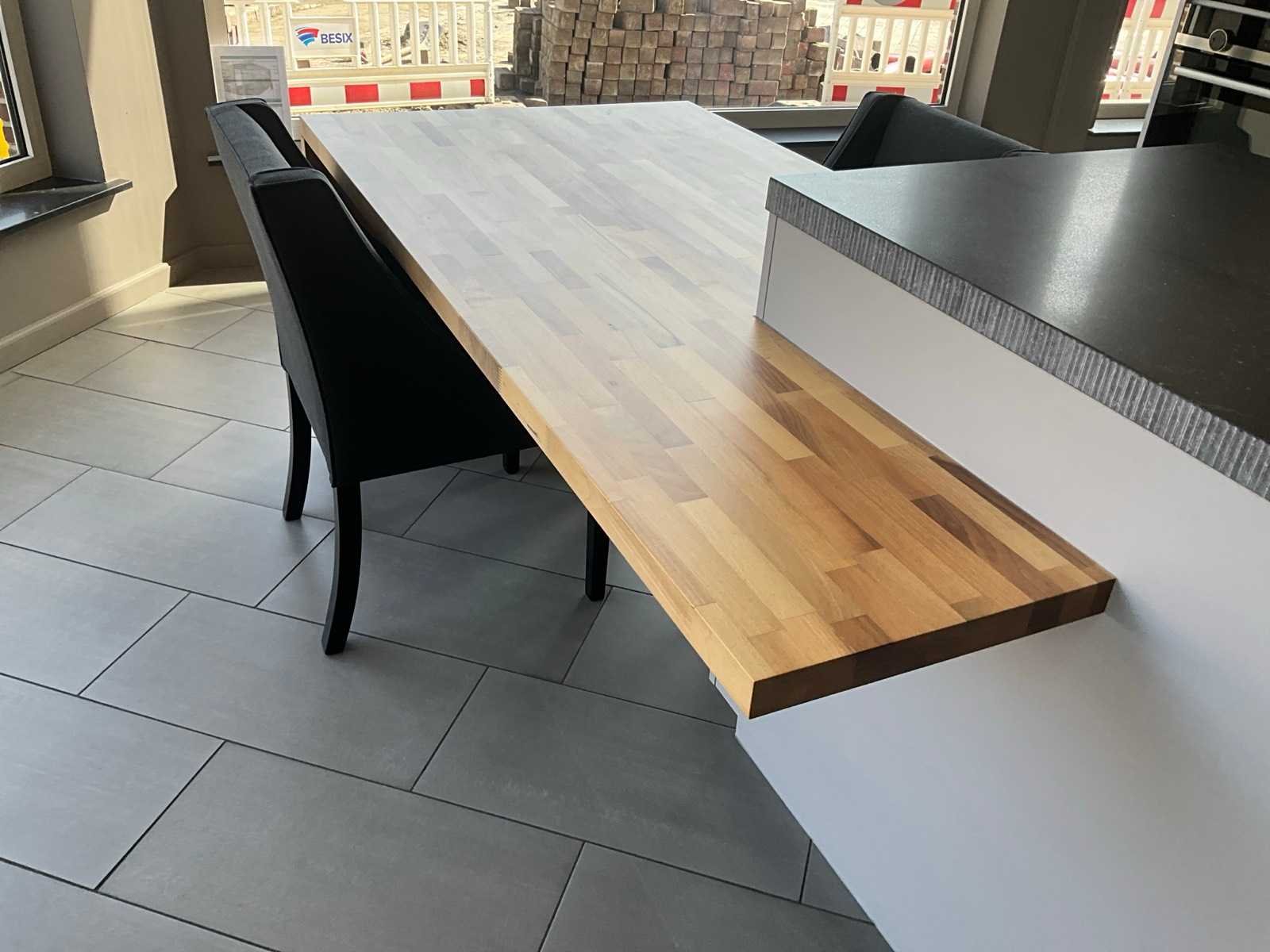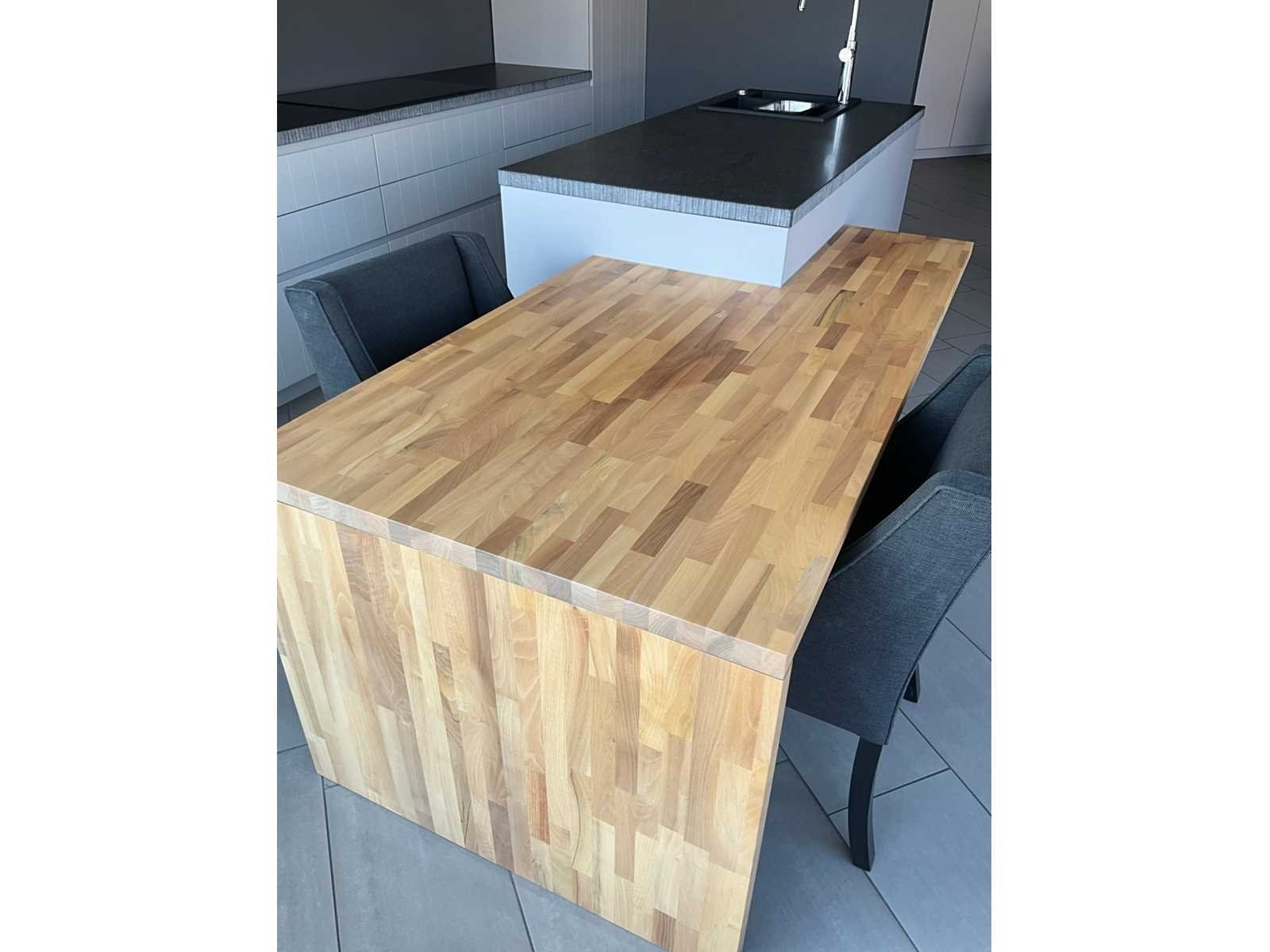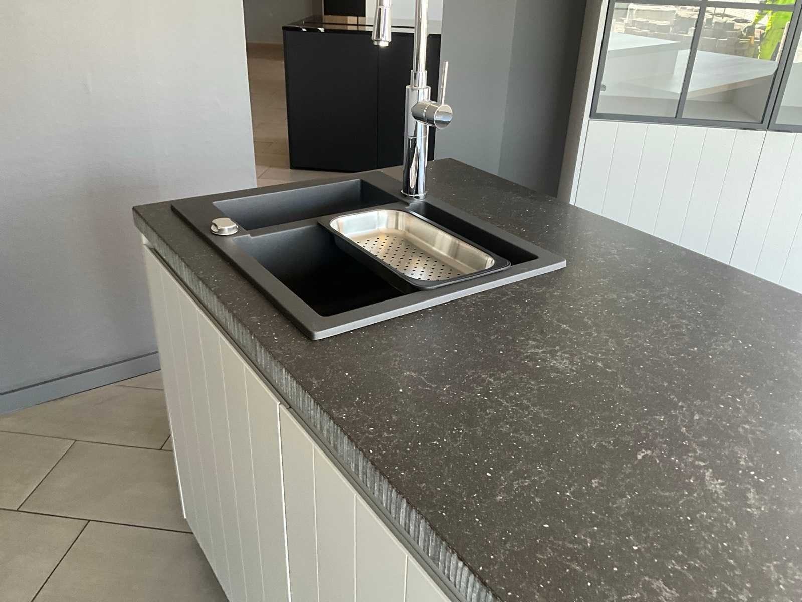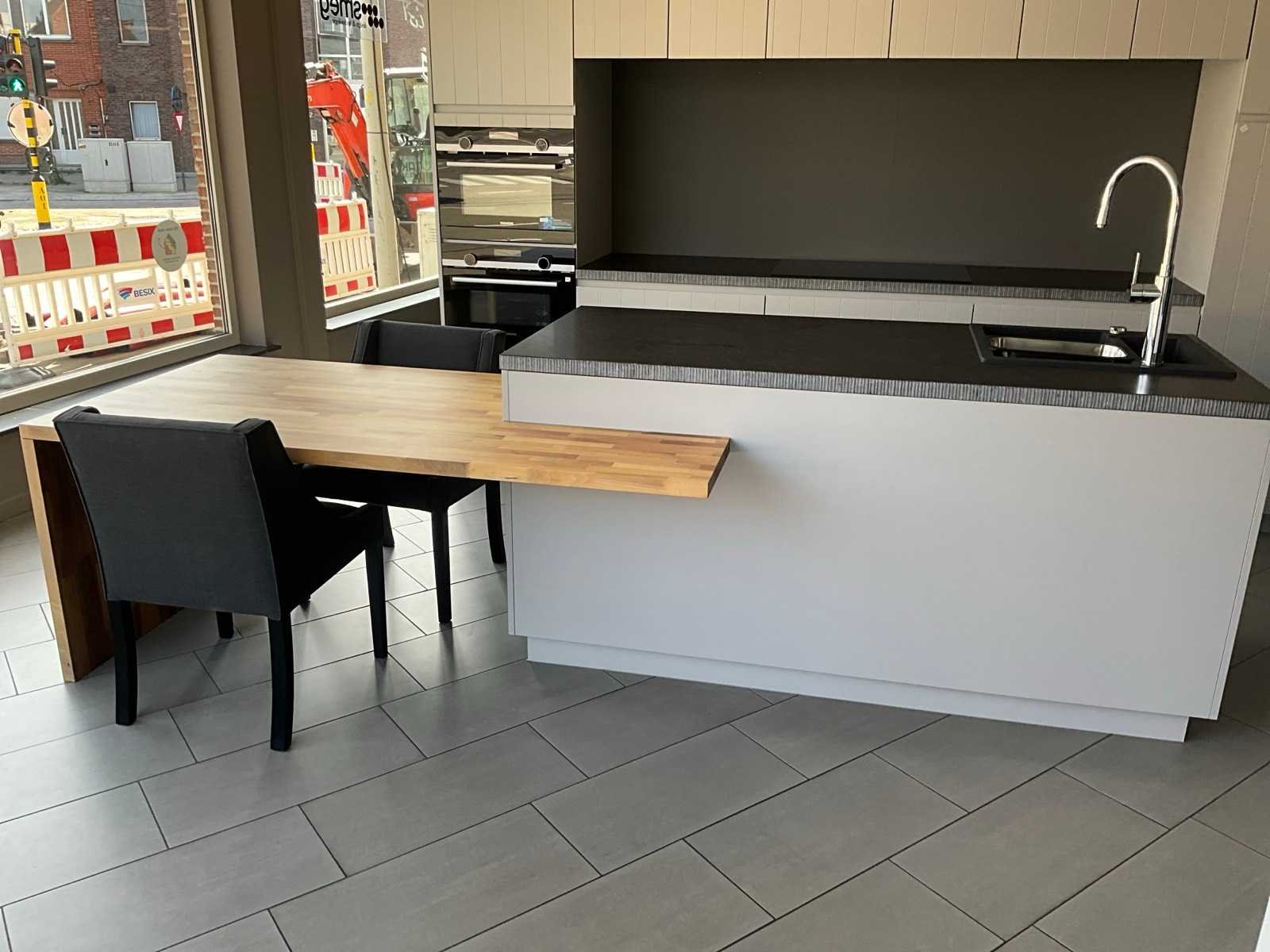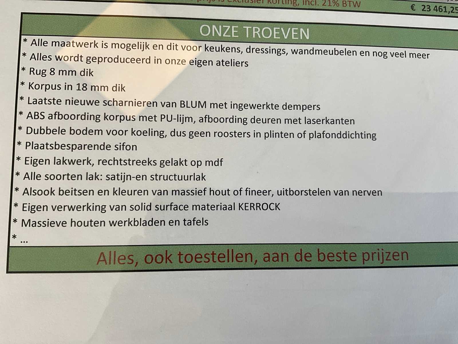 Meubelen : structuurlak met groeven om de 10 cm, U540VL Stone Grey OW, smeedijzeren deurtjes Werkbladen Dutch Blue gezoet (fl) 12 mm opgedikt tot 40 mm, gefijnde rand. Tafel massieve notelaar vernist + stol. Inclusief diverse toestellen waaronder spoelbak Aqua Linea SQC150-601, Kraan KVR X-Trend N 2451.21, Inductie kookplaat Novy 1726, inbouw koelkast Siemens KI41RAD30, inbouw vaatwasser Bosch SMD8TC800E/08, 2x Siemens waarvan 1 combi-micro CM585AMS0 en micro met stoom CO565AGS0 en inbouw dampkap Novy 6832. Enkel bovenvermelde toestellen zijn inbegrepen in deze keukenopstelling. Afmetingen eiland circa 305 x 118 x 93 cm hoog met 2 deuren waaronder met inbouwladen, 2 stoelen Westwing, afmetingen kast circa 362 x 60 x 240 cm hoog met 8 deuren en 10 schuiven, werkblad, afmetingen vitrinekast circa 124 x 40 x 240 cm hoog. ZIe ook grondplan op foto, enkel voor opstelling en afmetingen. Nee Type keukenopstelling: Keukeneiland en kast + vitrinekast Kraan: KVR Gootsteen: Aqua Linea Magnetron: Siemens 2x Fornuis: Novy Koelkast: Siemens Softclose: true Afzuigkap: Novy Vaatwasser: Bosch