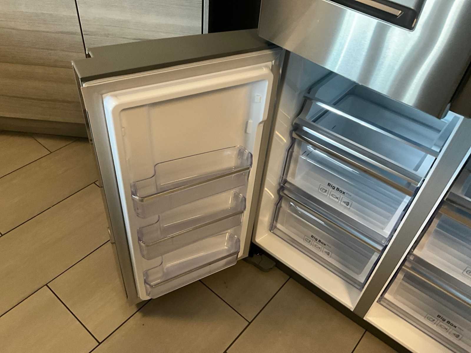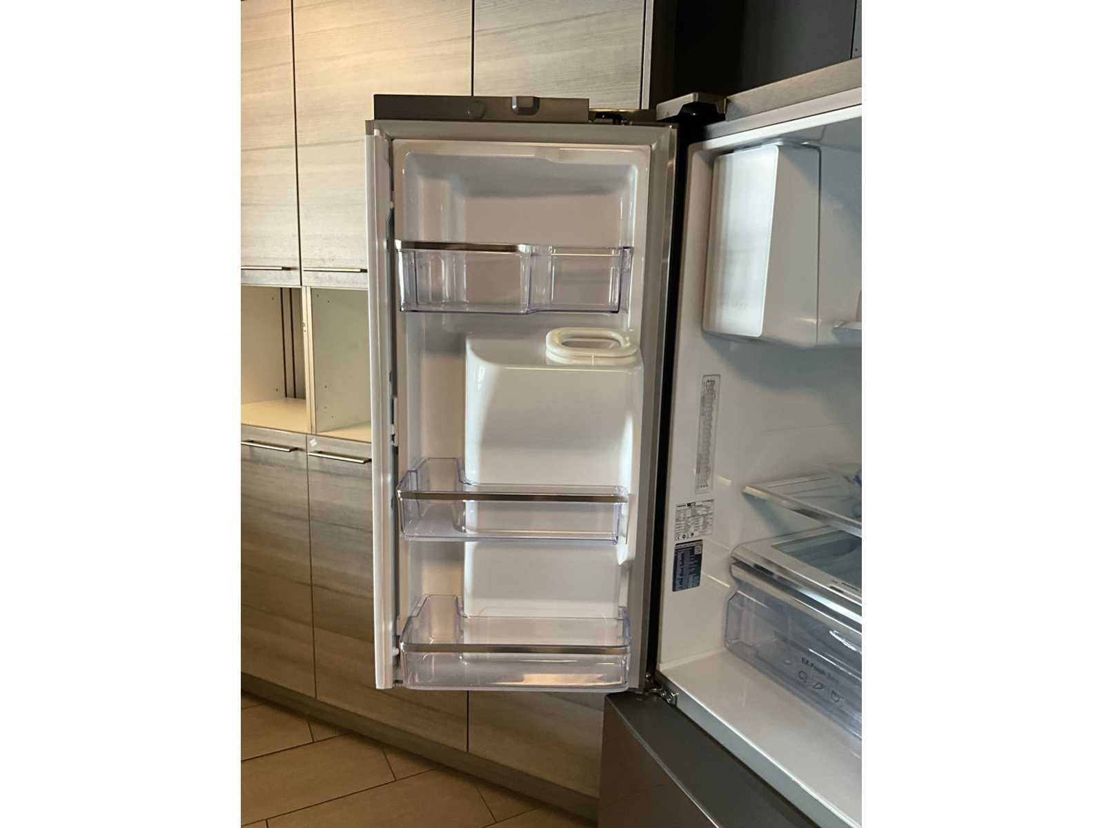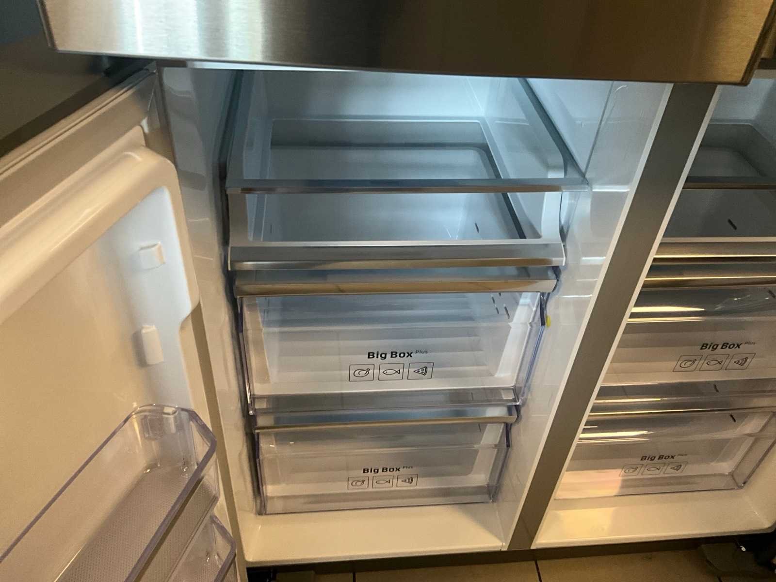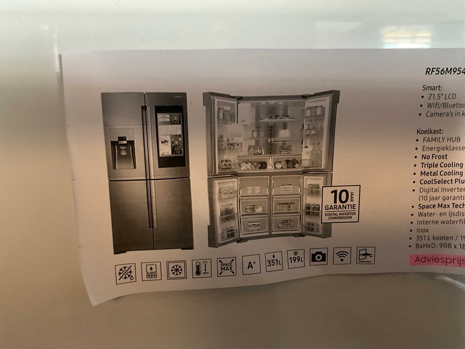Toonzaalmodel. Voorzien van water- en ijsdispenser. Met 4 deuren. Nee Merk: Samsung Model: RF56M9540SR Product type: Family Hub Netto inhoud koelvakken: 351l Netto inhoud Vriesvak: 199l Energielabel: A+ Lengte: 74cm Breedte: 91cm Hoogte: 183cm