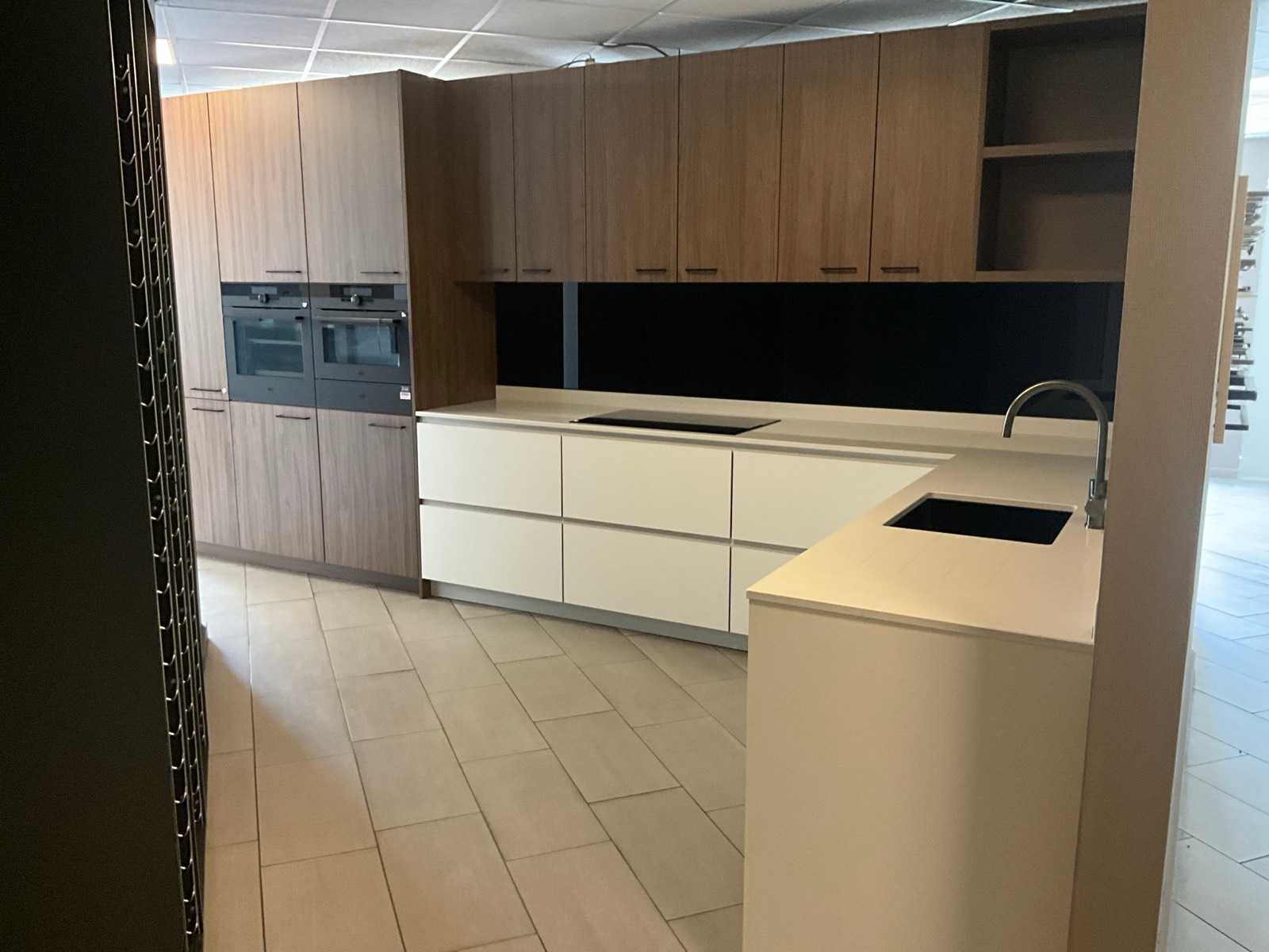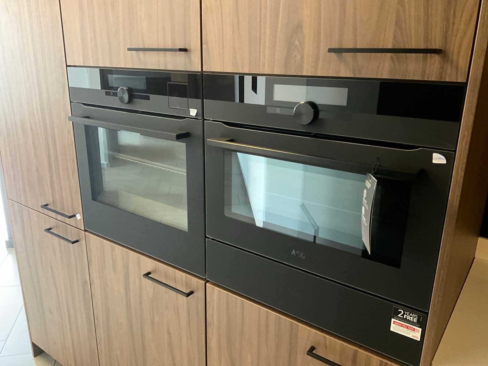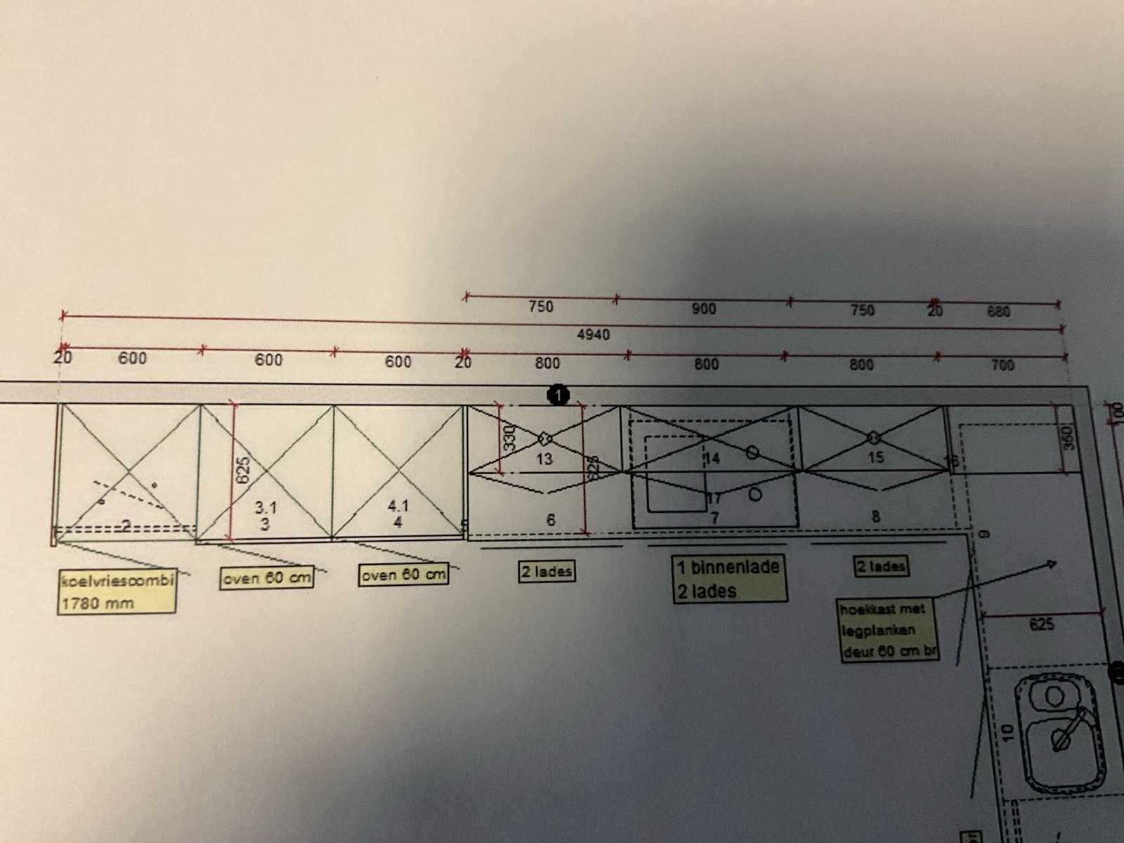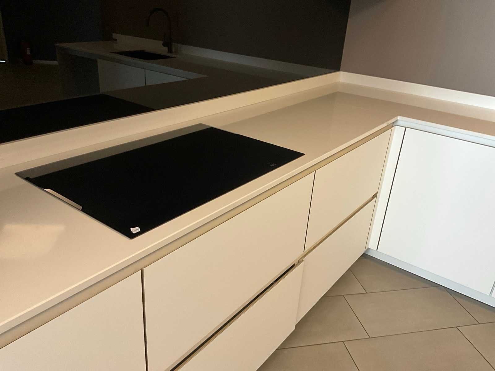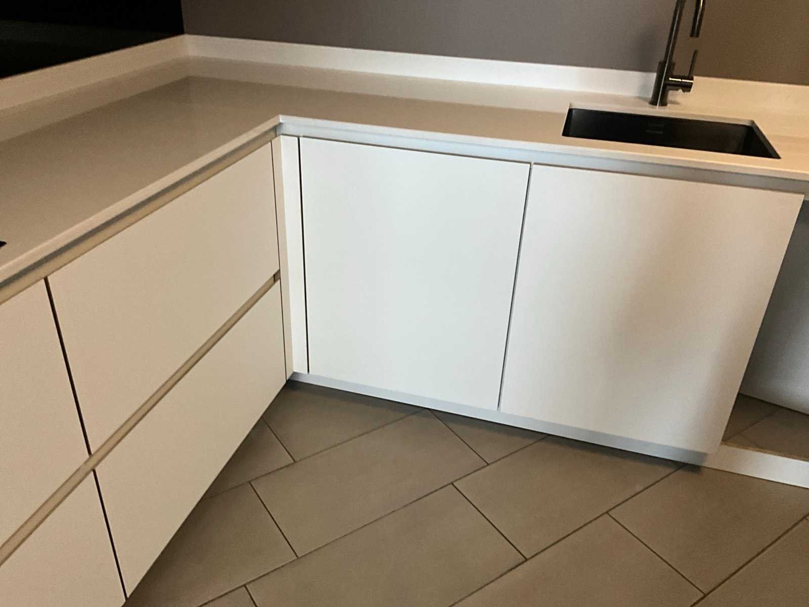 Meubelen : Kunststof notelaar B H3710ST12 Fenix 0032 wit op berkenmultiplex Werkbladen Composiet dd eternal statuario poli 20 mm Achterwand Gelakt glas: black classic 9005 - 6 mm. Inclusief diverse toestellen waaronder spoelbak Reginox SUMIA50GUN, Kraan Reginox MKCANGUN, inductie kookplaat AEG IPE84571FB, inbouw combi-micro oven AEG KMK968000T en sous vide oven AEG BSK999330T en inbouw koelkast Siemens KI86VVF30. Enkel bovenvermelde toestellen zijn inbegrepen in deze keukenopstelling. Afmetingen hoekopstelling circa 490 x 255 x 240 cm hoog met 6 schuiven, 13 deuren, 2 open opbergvakken, en voorzien van led verlichting. Diepte 65 cm. Zie ook grondplan op foto, enkel voor opstelling en afmetingen. Nee Type keukenopstelling: Hoekopstelling Kraan: Reginox Gootsteen: Reginox Magnetron: AEG 2x Fornuis: AEG Koelkast: Siemens Softclose: true