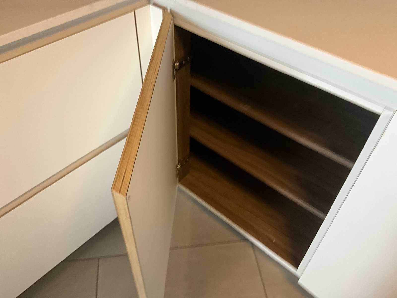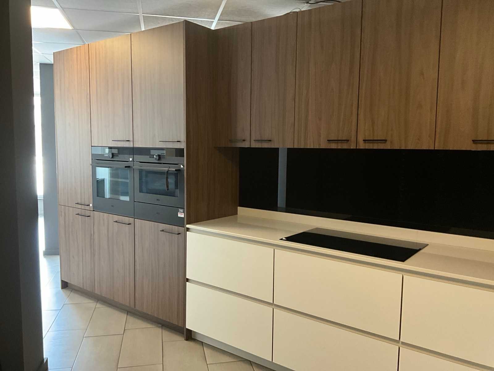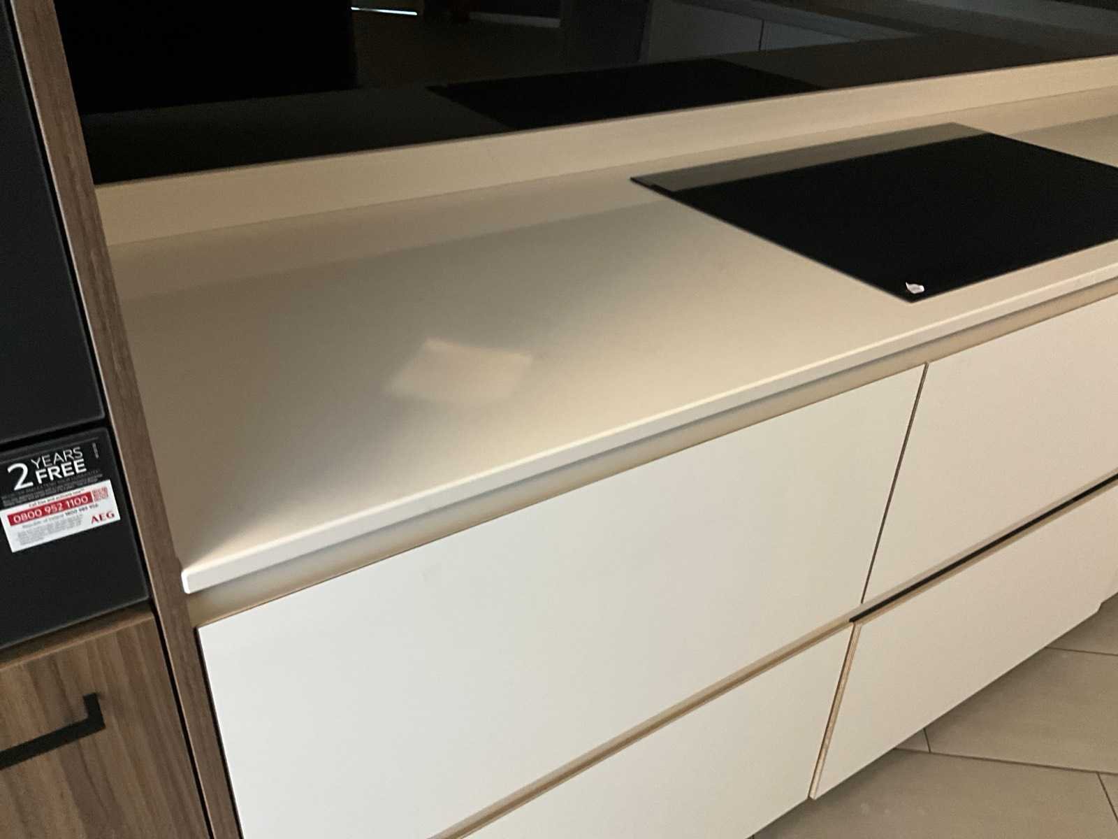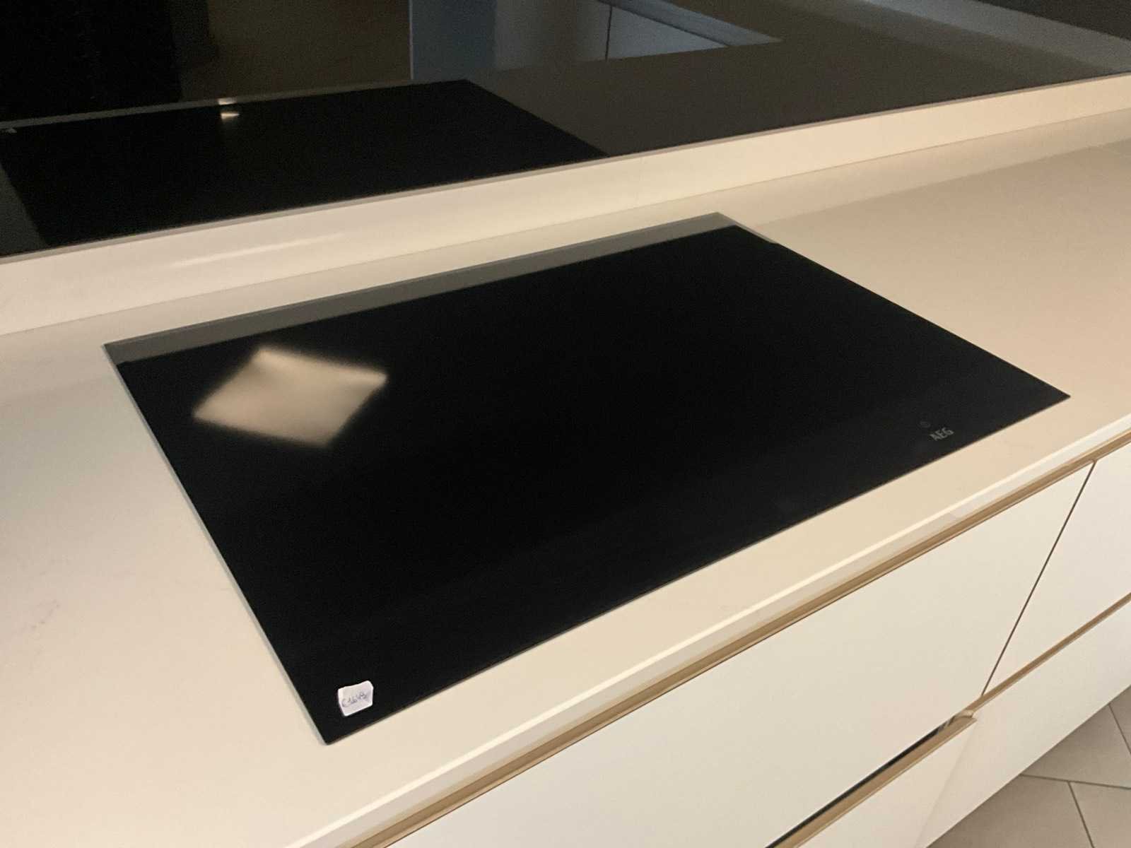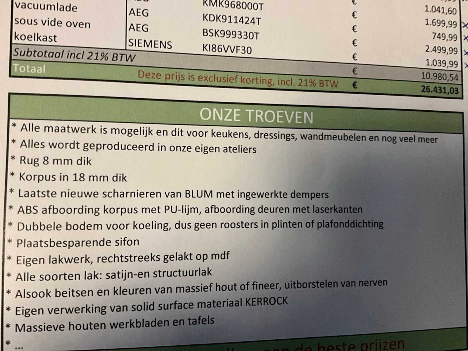 Meubelen : Kunststof notelaar B H3710ST12 Fenix 0032 wit op berkenmultiplex Werkbladen Composiet dd eternal statuario poli 20 mm Achterwand Gelakt glas: black classic 9005 - 6 mm. Inclusief diverse toestellen waaronder spoelbak Reginox SUMIA50GUN, Kraan Reginox MKCANGUN, inductie kookplaat AEG IPE84571FB, inbouw combi-micro oven AEG KMK968000T en sous vide oven AEG BSK999330T en inbouw koelkast Siemens KI86VVF30. Enkel bovenvermelde toestellen zijn inbegrepen in deze keukenopstelling. Afmetingen hoekopstelling circa 490 x 255 x 240 cm hoog met 6 schuiven, 13 deuren, 2 open opbergvakken, en voorzien van led verlichting. Diepte 65 cm. Zie ook grondplan op foto, enkel voor opstelling en afmetingen. Nee Type keukenopstelling: Hoekopstelling Kraan: Reginox Gootsteen: Reginox Magnetron: AEG 2x Fornuis: AEG Koelkast: Siemens Softclose: true