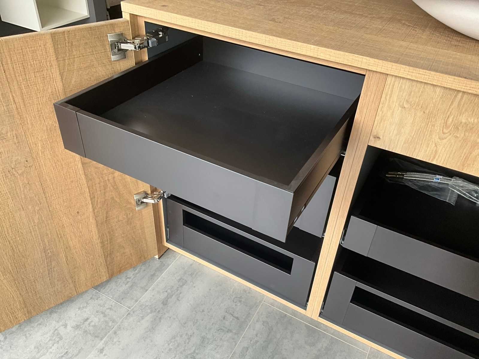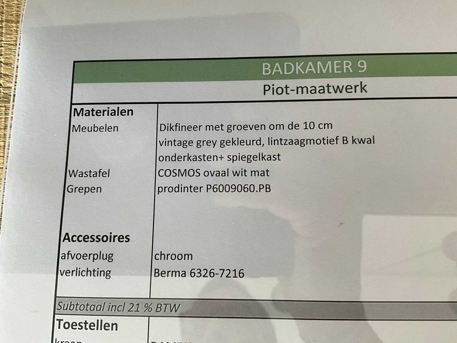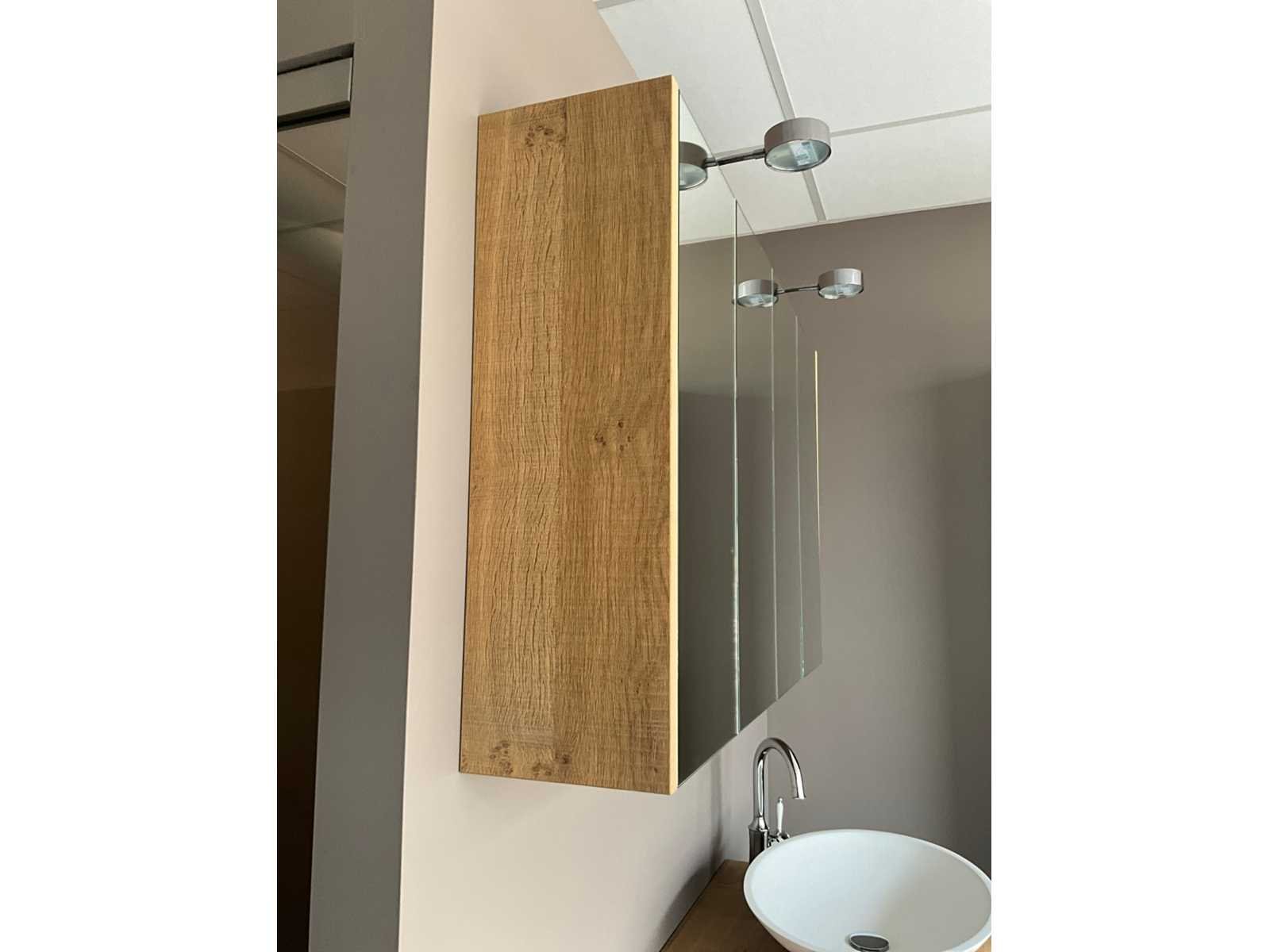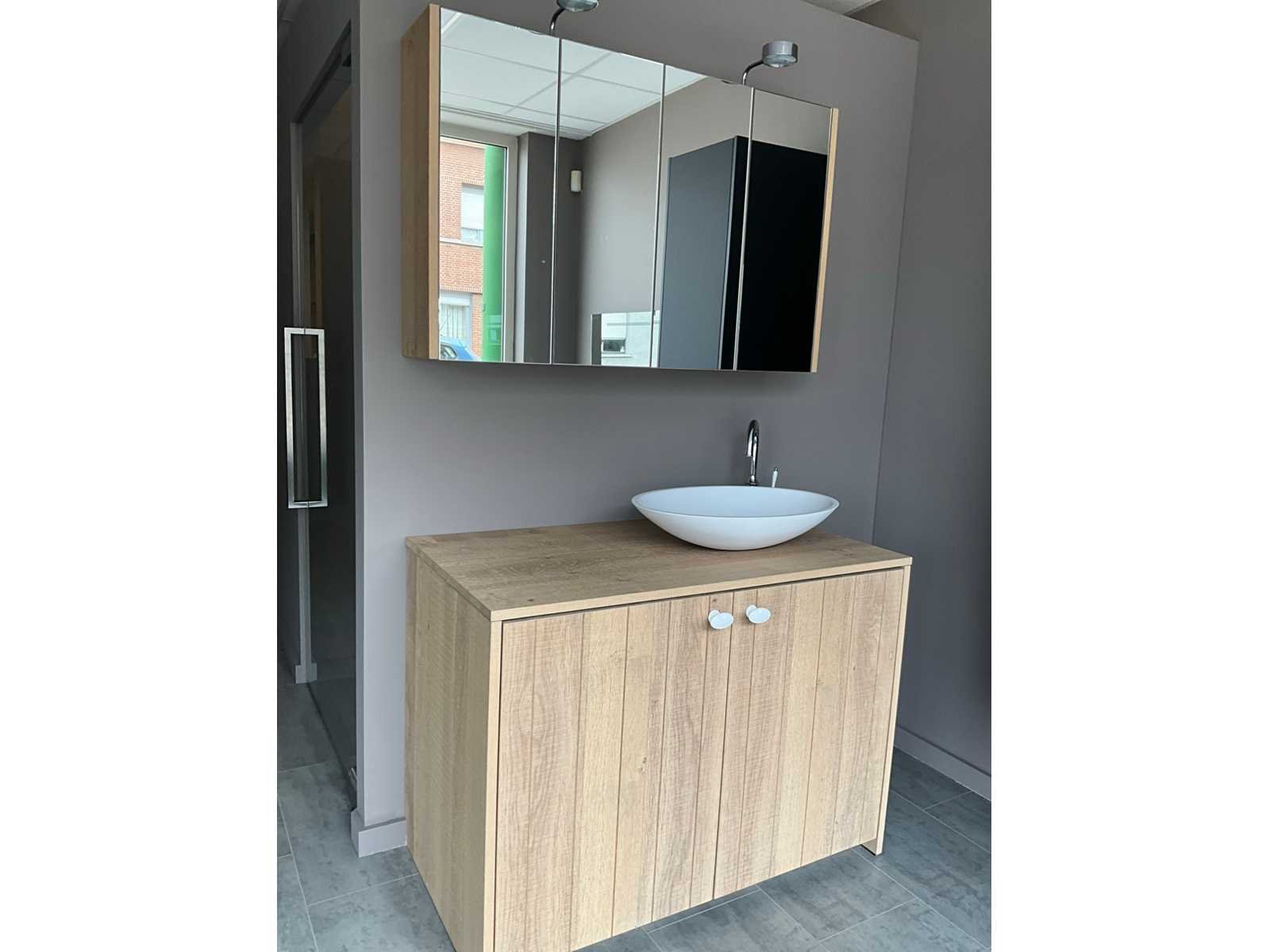 In dikfineer met groeven om de 10 cm, vintage grey gekleurd, lintzaagmotief B kwal, met onderkast (2 deuren voorzien van inbouwladen) en hangkast/apotheekkast in spiegeluitvoering met verlichting Berma. Wastafel Cosmos ovaal wit mat en voorzien van kraan Damian 37621.00. Nee Lengte: 180cm Breedte: 56cm Hoogte: 185cm