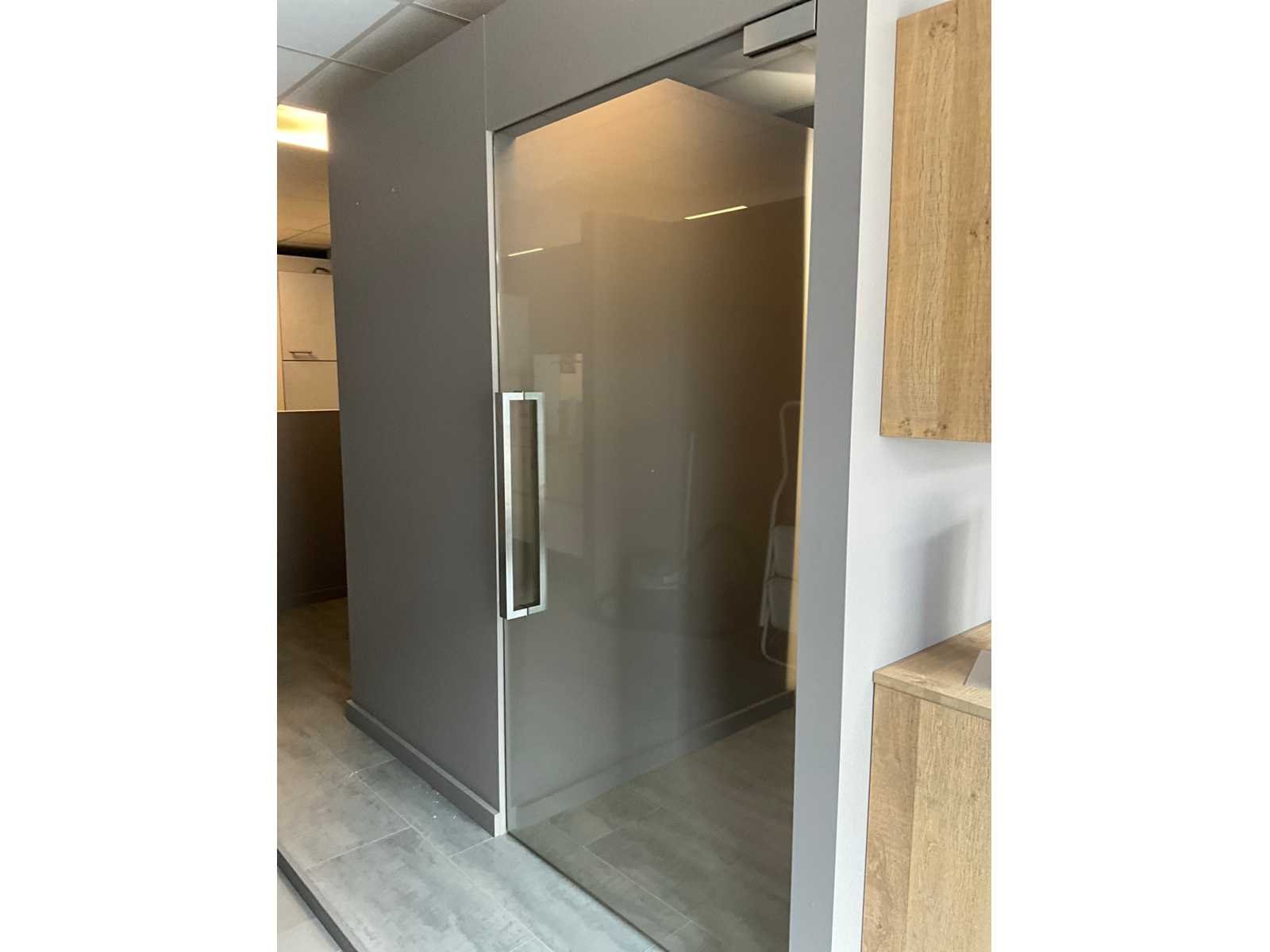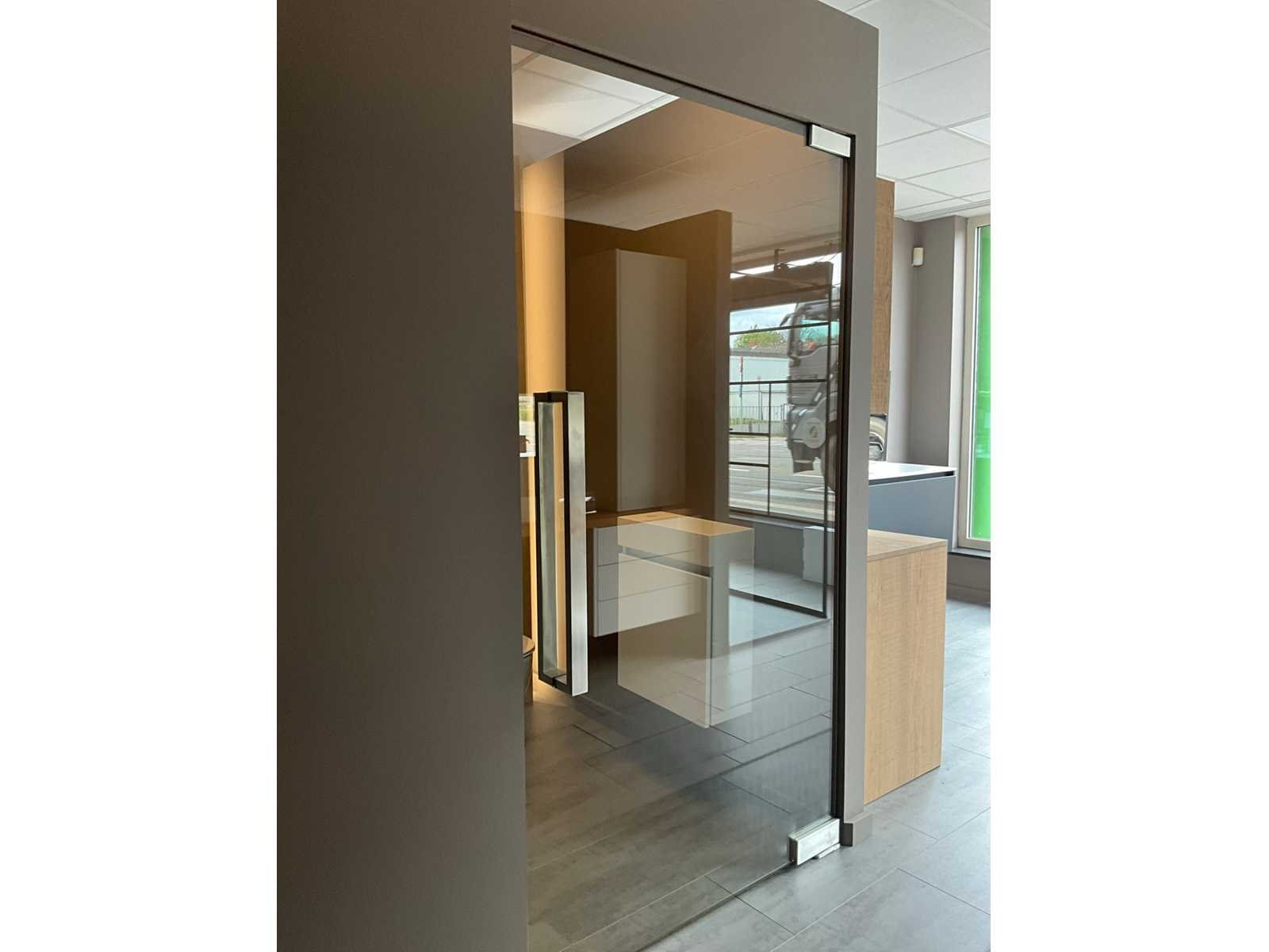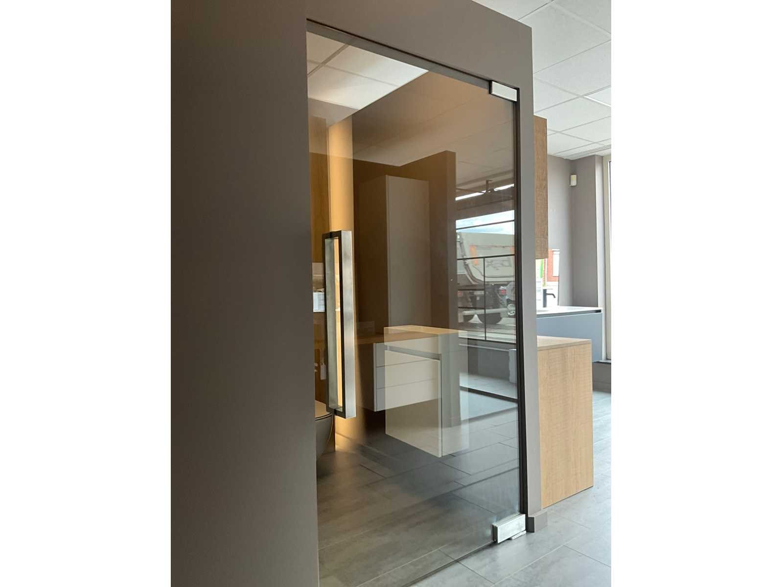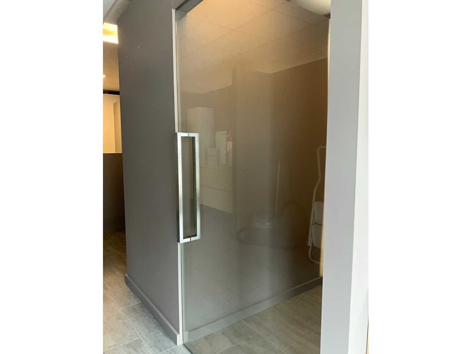 Voorzien van hydraulische scharnieren FS880 (CDA), kan 180 ° open, Te positioneren 90°, voorzien van top scharnier en greep. Gehard helder glas 10 mm dik. Toonzaalmodel. Nee