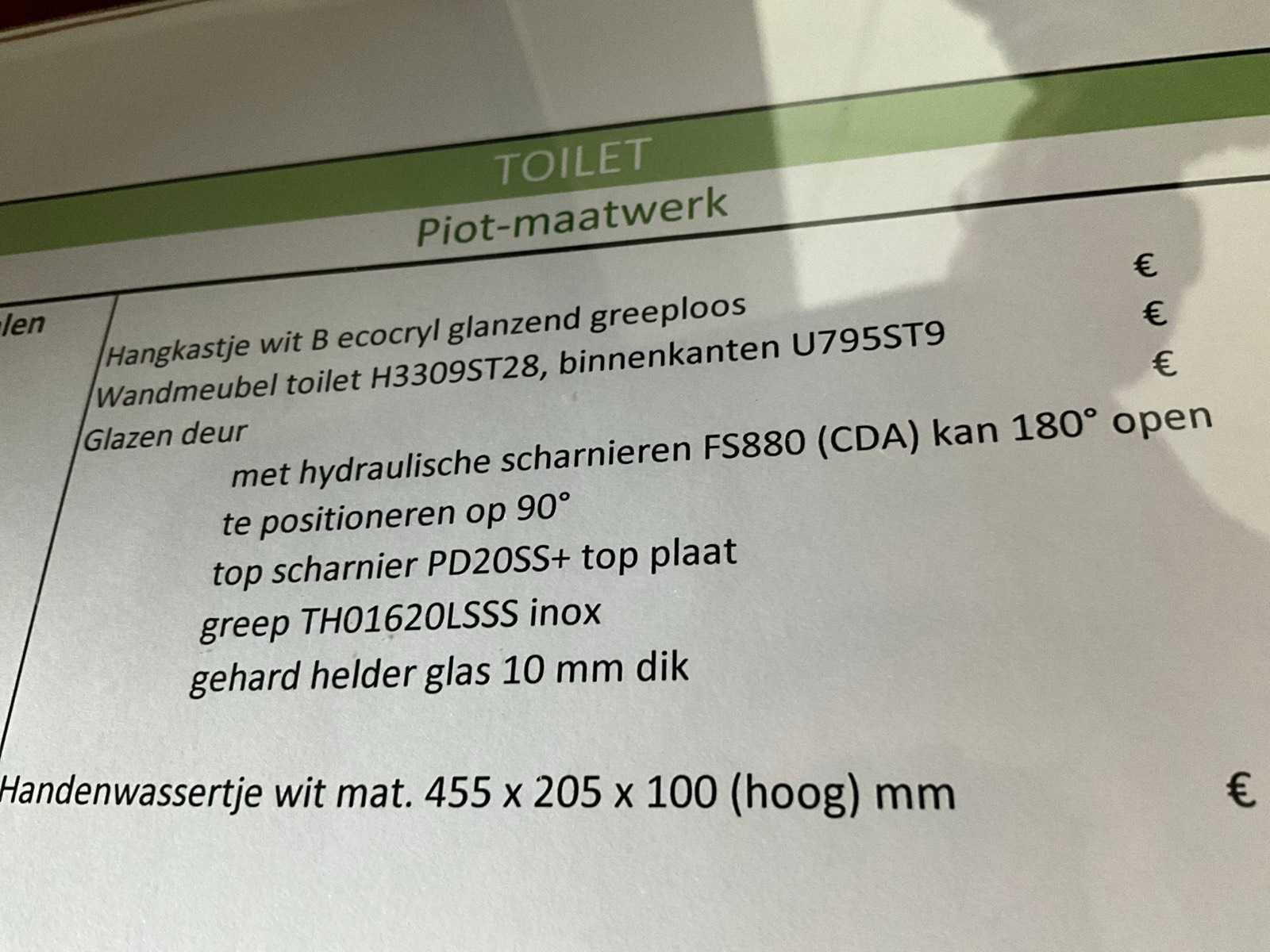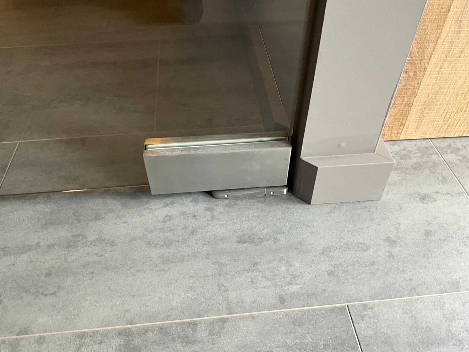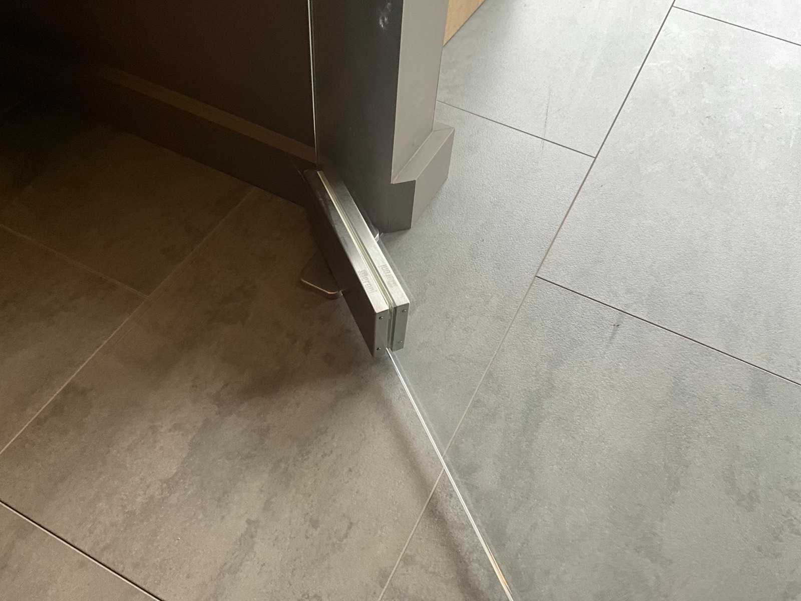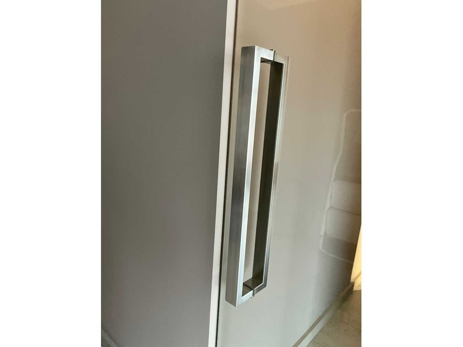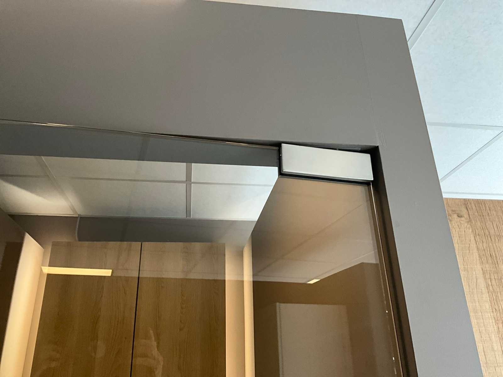 Voorzien van hydraulische scharnieren FS880 (CDA), kan 180 ° open, Te positioneren 90°, voorzien van top scharnier en greep. Gehard helder glas 10 mm dik. Toonzaalmodel. Nee