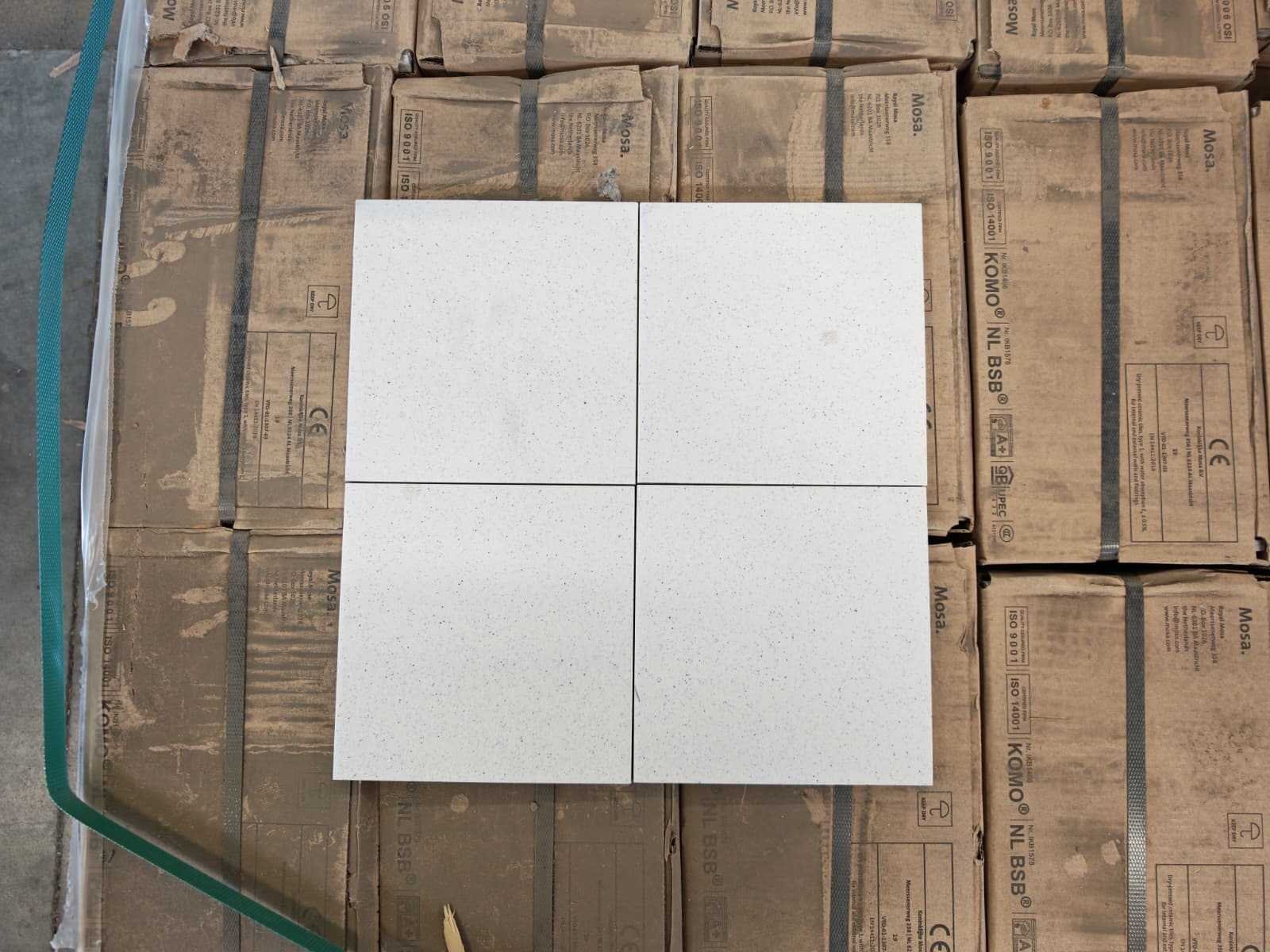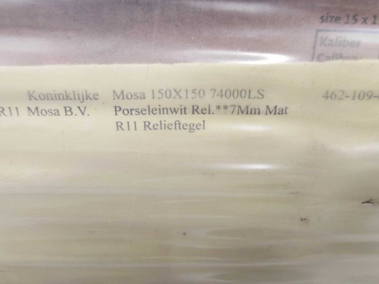 Nee Merk: Mosa Kleur: Porselein wit Afwerking: Mat R11 Lengte: 150mm Breedte: 150mm Dikte: 7mm Materiaal: Keramiek Type: Vloertegel met Reliëf Model: 74000LS Aantal m² per verpakking: 0.75m² Aantal pakken: 84 Totaal oppervlakte: 63m² Totaal gewicht: 1260kg