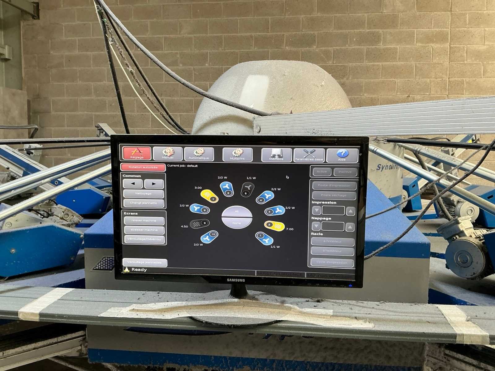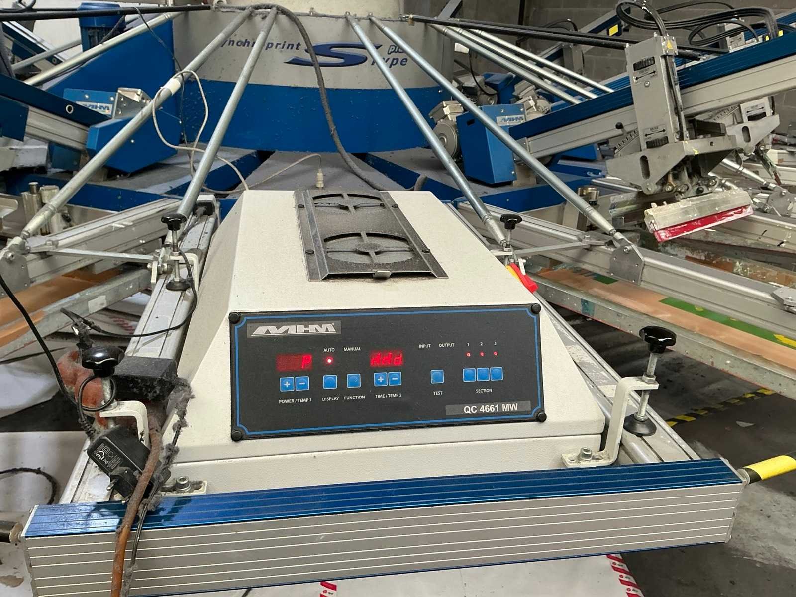 12 drukstations en 8 draaistations/ uitgerust met 2 zeefdrukflashunits, zijnde 1 x Calmat type SE06CMW en 1 x MHM type QC4661MW Nee Merk: MHM Type: Synchroprint SPS 12Z08 Bouwjaar: 2012 Serienummer: 17640 Max. print formaat l: 450mm Max. print formaat b: 550mm Aansluiting: 230V Totale afmeting L: 5000mm Totale afmeting Breedte: 5000mm Totale afmeting Hoogte: 2100mm
