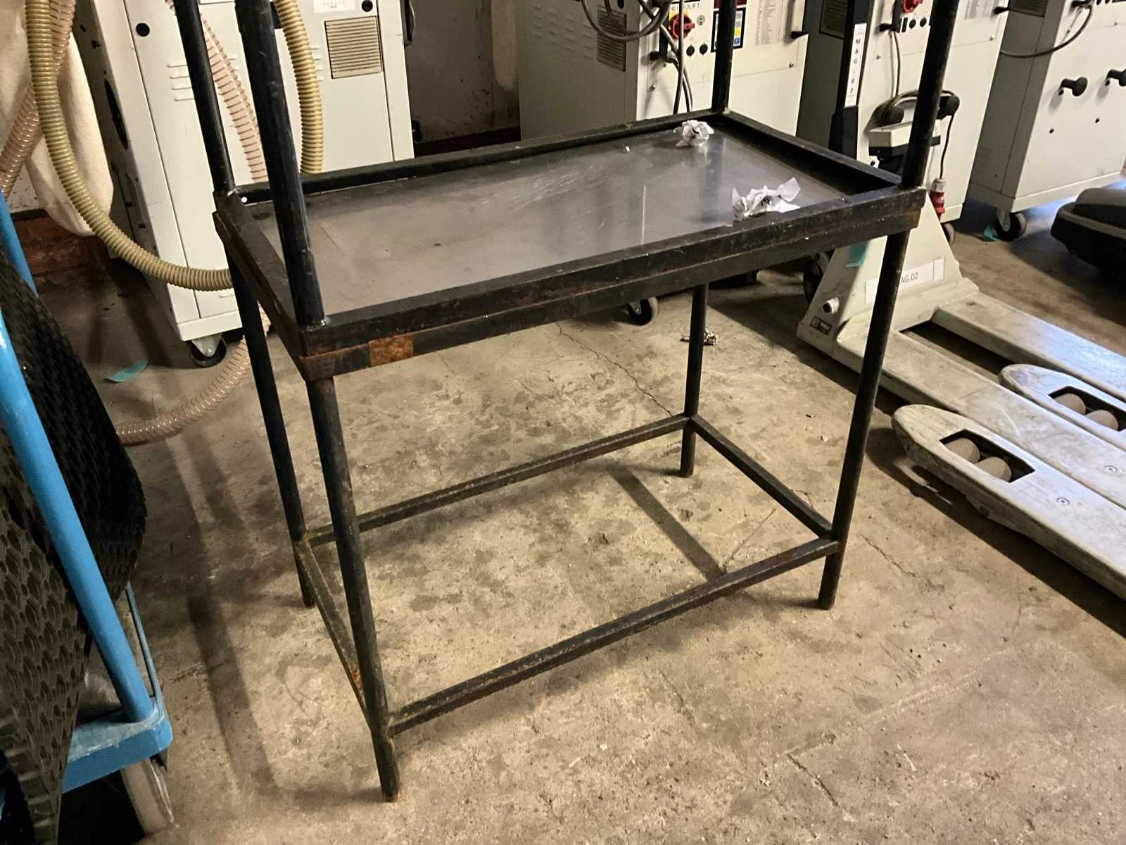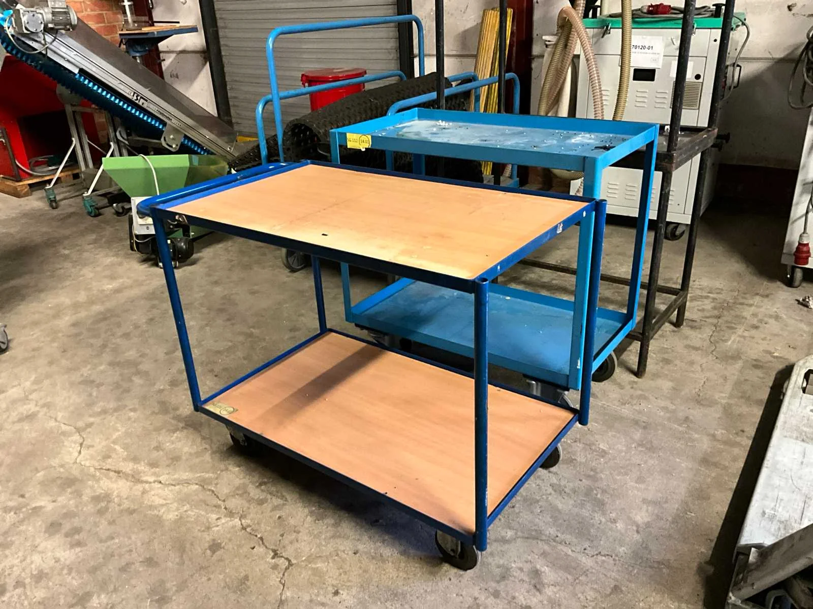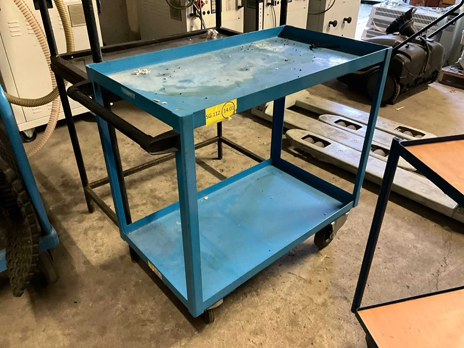 3 diverse metalen werkkarren wo EUROKRAFT waaronder afm ca. 100x60x80cm, 90x50x100cm en 120x80x120cm, compleet met 2 metalen tafels waaronder 1 voorzien van rvs bovenblad, afm ca. 100x45x90cm Nee