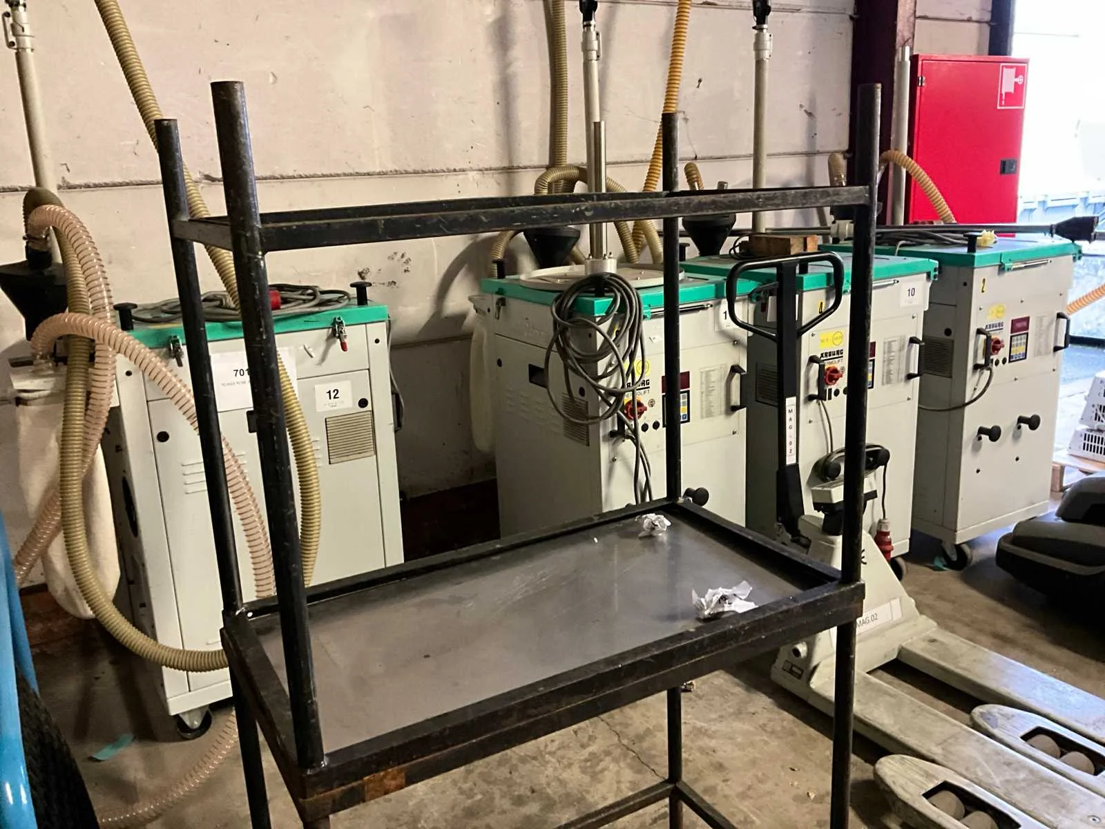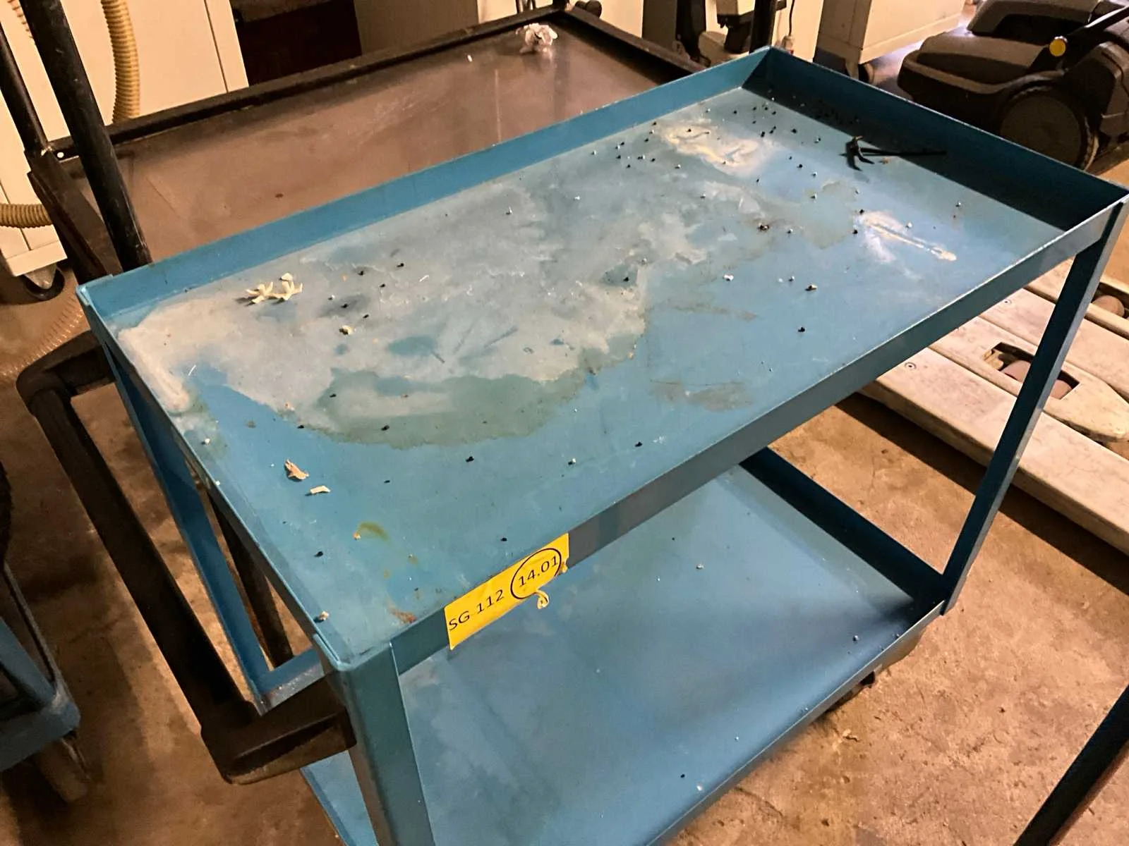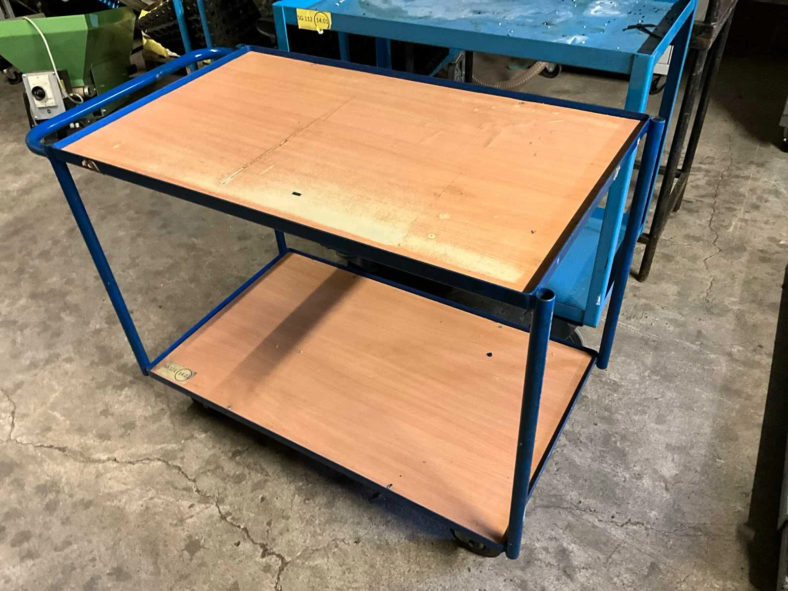 3 diverse metalen werkkarren wo EUROKRAFT waaronder afm ca. 100x60x80cm, 90x50x100cm en 120x80x120cm, compleet met 2 metalen tafels waaronder 1 voorzien van rvs bovenblad, afm ca. 100x45x90cm Nee