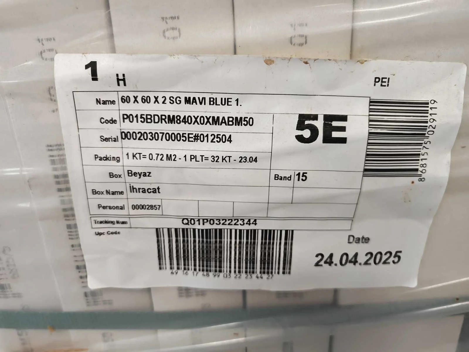 No Merk: Qua Granite Kleur: Blauw Afwerking: Mat R11 Lengte: 600mm Breedte: 600mm Dikte: 20mm Materiaal: Keramiek Type: Vloertegel Model: Outdoor Aantal m² per verpakking: 0,72m² Aantal pakken: 64 Totaal oppervlakte: 46,08m² Totaal gewicht: 2100kg