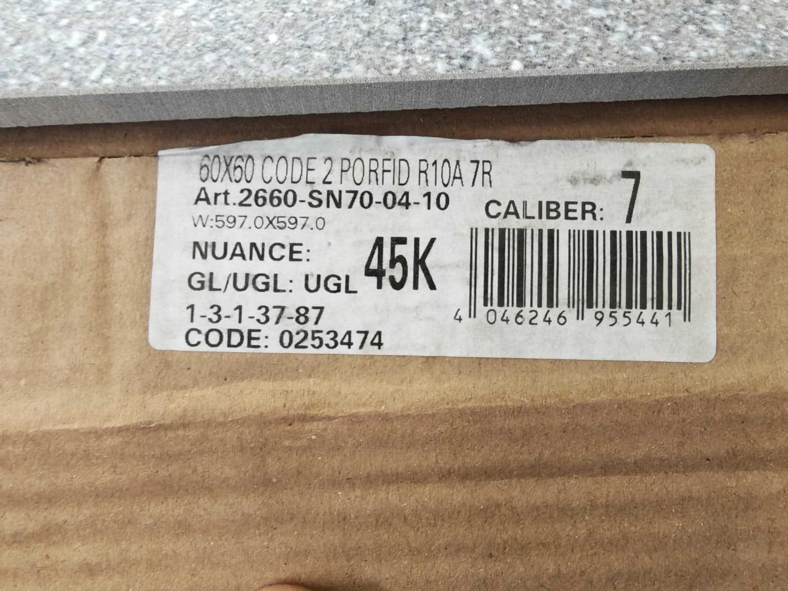 No Merk: Villeroy&Boch Kleur: Porfid Afwerking: Mat R10 Lengte: 600mm Breedte: 600mm Dikte: 9mm Materiaal: Keramiek Type: Vloertegel Model: Code 2 2660 SN70 Aantal m² per verpakking: 1,44m² Aantal pakken: 7 Totaal oppervlakte: 10,08m² Totaal gewicht: 210kg