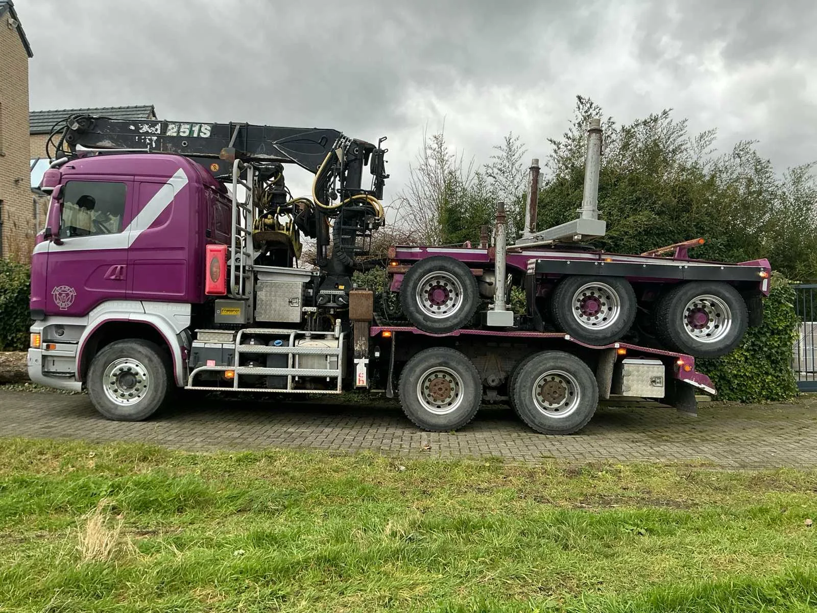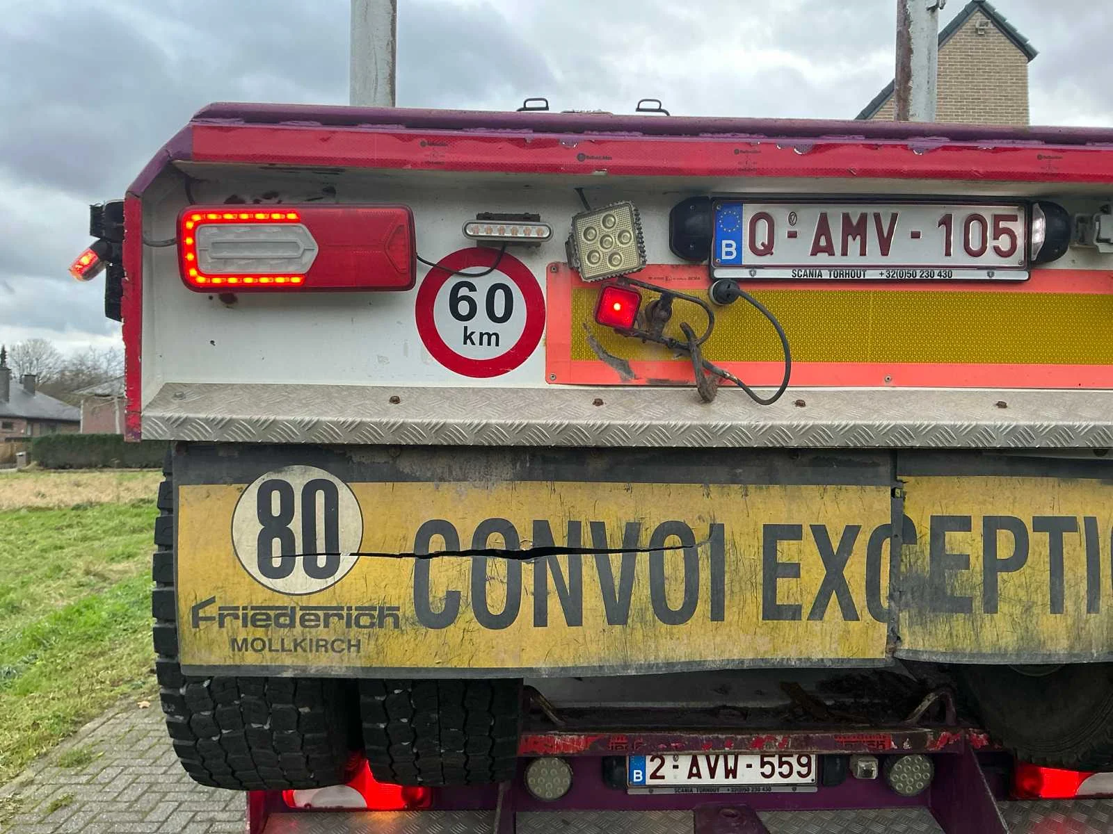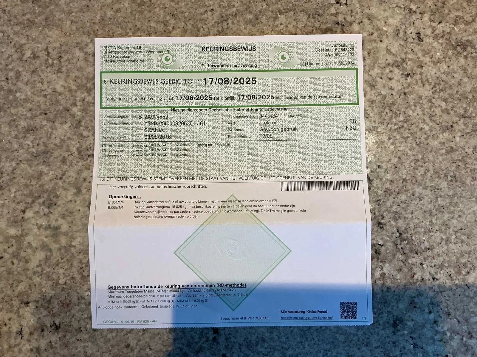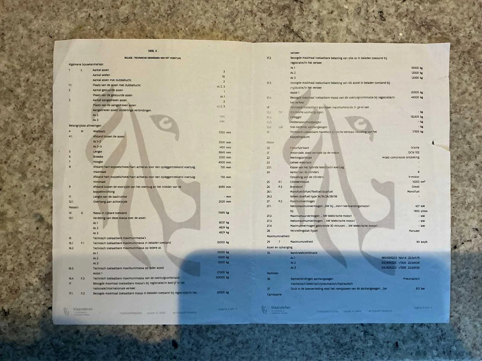 2016 Scania Vrachtwagen R580 V8: - Volledige remsests vernieuwt. - Nieuwe aluminium velgen. - Vrachtwagen werd voorzien van nieuwe batterijen. - Recente banden met diepe groeven, ideaal voor op onverhard ondergrond. - Technische Aslast 13,500kg/as, uitzonderlijk voor België. - Meerdere handige materiaalkoffers - Custom Interieur in onberispelijke staat. - extra verlichting verwerkt in grill en dak. - Loglift opbouwkraan type 251S, met een hefvermogen van 25,1T. - Reserve leidingen van Parker 2015 Friederich Dolly: Chassisnummer: VF9A3212P15176103 Type: AR312PBS Datum eerste inschrijving: 09/03/2015 Massa in rijklare toestand: 5280kg - Volledige remsets vernieuwt - 3 assen - Nieuwe aluminium velgen. - Mee bestuurbaar door middel van een joystick in de cabine(zie foto’s). - Recente banden met diepe groeven, ideaal voor op onverhard ondergrond. - Leidingen voor het koppelen met de vrachtwagen in perfecte staat. Een absolute krachtpatser in zijn vak en in topstaat gezien zijn leeftijd en kilometers. Technisch perfect werkend en meteen inzetbaar voor het zware werk. No Merk: Scania Type: R580 V8 CA6X4EHZ Bouwjaar: 2016 Chassisnummer VIN: YS2R6X40009205351 Cilinderinhoud: 16353cc APK vervaldatum: 17/08/2025 Datum eerste toelating: 03/08/2016 Aantal assen: 3 Asconfiguratie: 6x4 Laadvermogen: 26000kg Aantal sleutels: 2 Slaapcabine: true Laadkraan: true Navigatie: true Eigen gewicht: 18150kg Afgelezen kilometerstand: 344497km Nationaliteit documenten: BE Kentekenpapieren compleet?: true Aantal zitplaatsen: 2 Handgeschakelde versnellingsbak: true Diesel: true