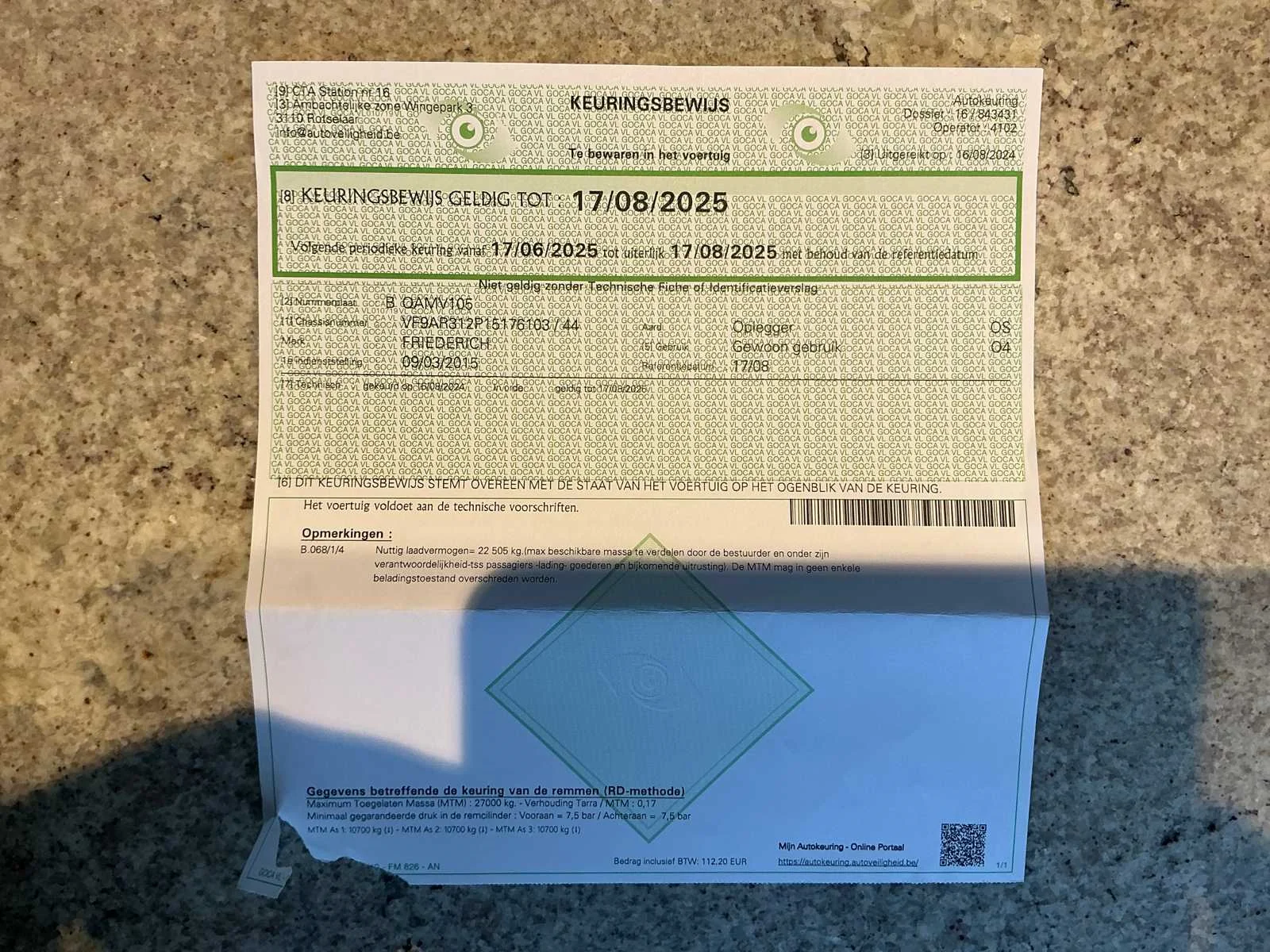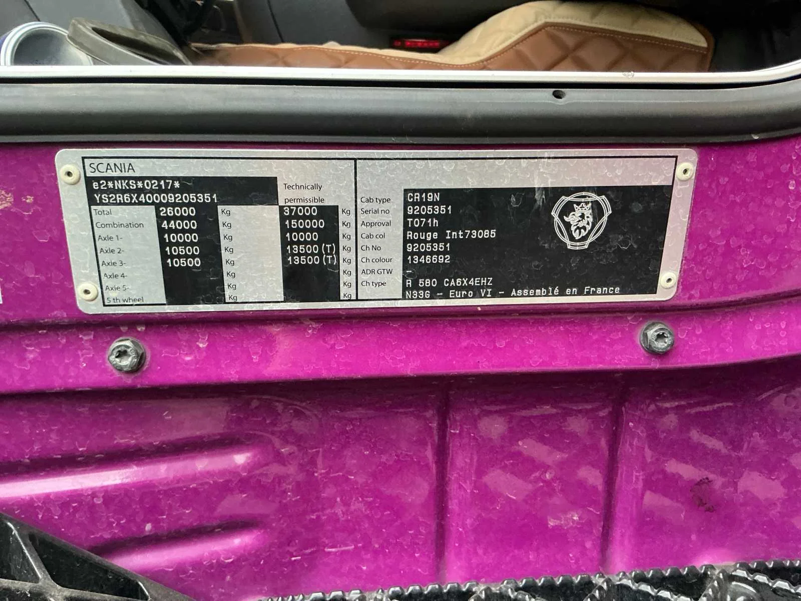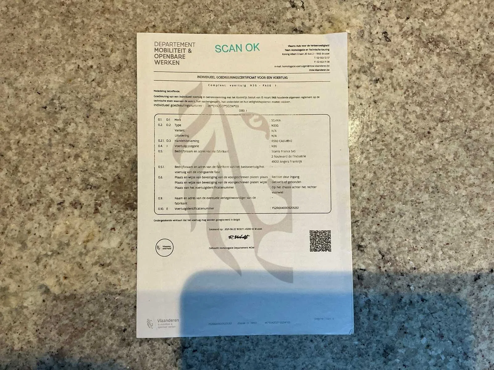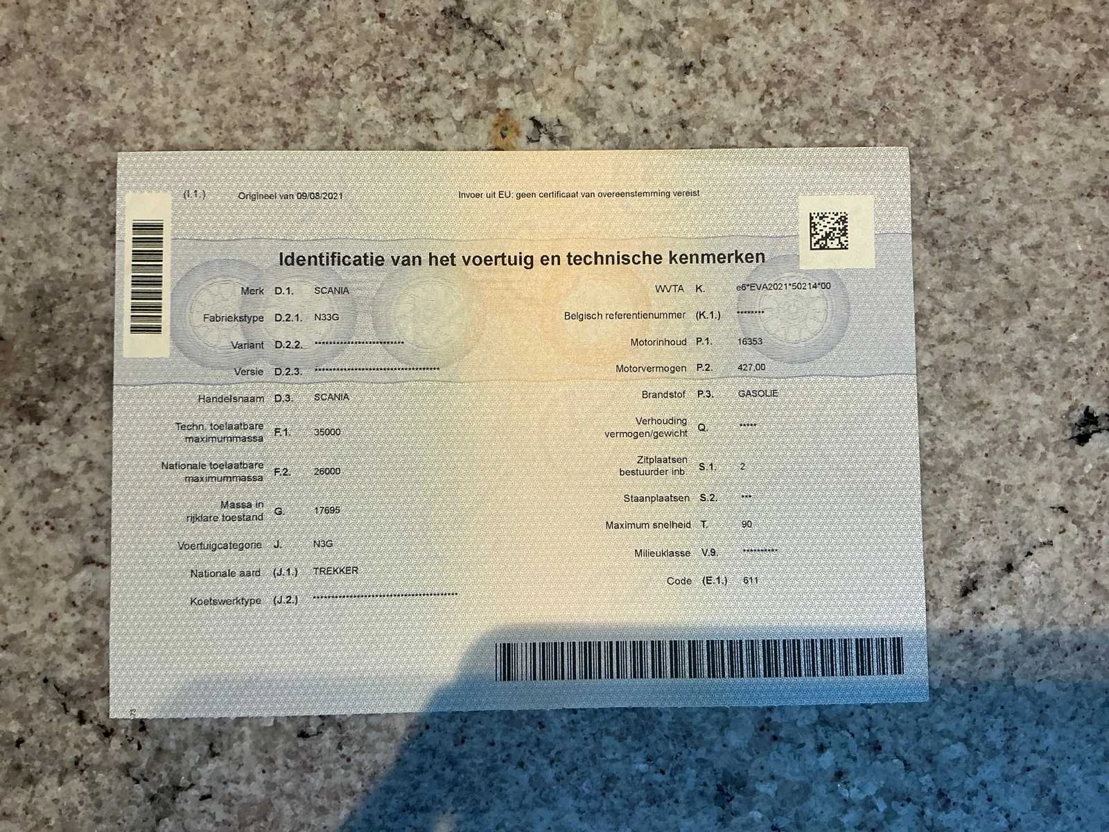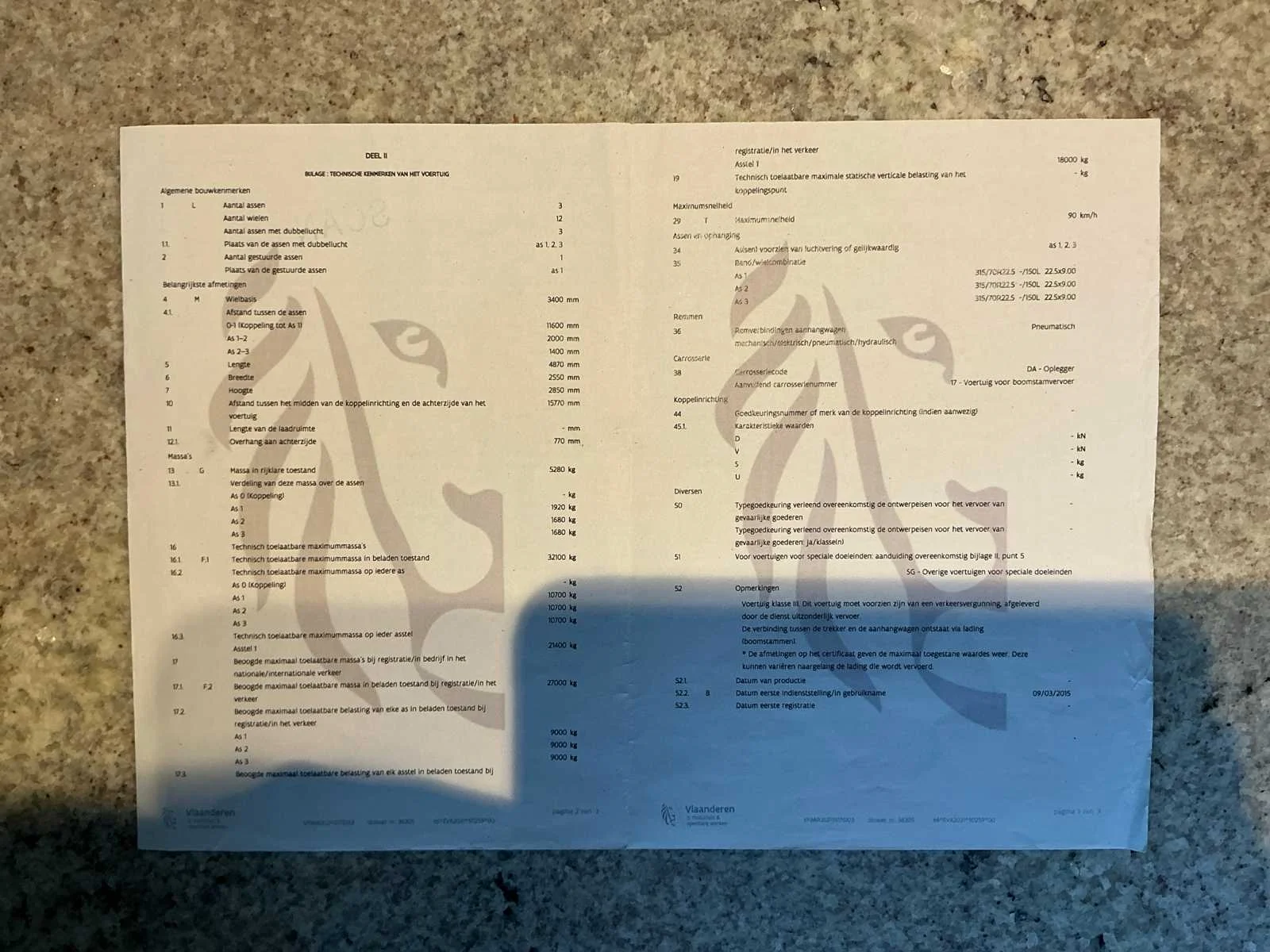 2016 Scania Vrachtwagen R580 V8: - Volledige remsests vernieuwt. - Nieuwe aluminium velgen. - Vrachtwagen werd voorzien van nieuwe batterijen. - Recente banden met diepe groeven, ideaal voor op onverhard ondergrond. - Technische Aslast 13,500kg/as, uitzonderlijk voor België. - Meerdere handige materiaalkoffers - Custom Interieur in onberispelijke staat. - extra verlichting verwerkt in grill en dak. - Loglift opbouwkraan type 251S, met een hefvermogen van 25,1T. - Reserve leidingen van Parker 2015 Friederich Dolly: Chassisnummer: VF9A3212P15176103 Type: AR312PBS Datum eerste inschrijving: 09/03/2015 Massa in rijklare toestand: 5280kg - Volledige remsets vernieuwt - 3 assen - Nieuwe aluminium velgen. - Mee bestuurbaar door middel van een joystick in de cabine(zie foto’s). - Recente banden met diepe groeven, ideaal voor op onverhard ondergrond. - Leidingen voor het koppelen met de vrachtwagen in perfecte staat. Een absolute krachtpatser in zijn vak en in topstaat gezien zijn leeftijd en kilometers. Technisch perfect werkend en meteen inzetbaar voor het zware werk. No Merk: Scania Type: R580 V8 CA6X4EHZ Bouwjaar: 2016 Chassisnummer VIN: YS2R6X40009205351 Cilinderinhoud: 16353cc APK vervaldatum: 17/08/2025 Datum eerste toelating: 03/08/2016 Aantal assen: 3 Asconfiguratie: 6x4 Laadvermogen: 26000kg Aantal sleutels: 2 Slaapcabine: true Laadkraan: true Navigatie: true Eigen gewicht: 18150kg Afgelezen kilometerstand: 344497km Nationaliteit documenten: BE Kentekenpapieren compleet?: true Aantal zitplaatsen: 2 Handgeschakelde versnellingsbak: true Diesel: true
