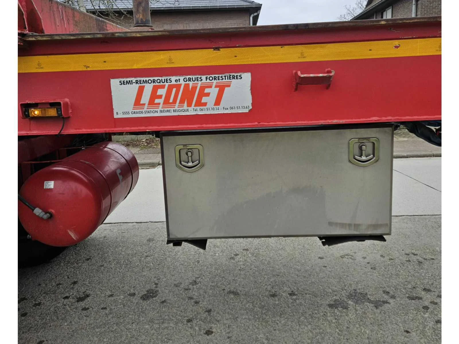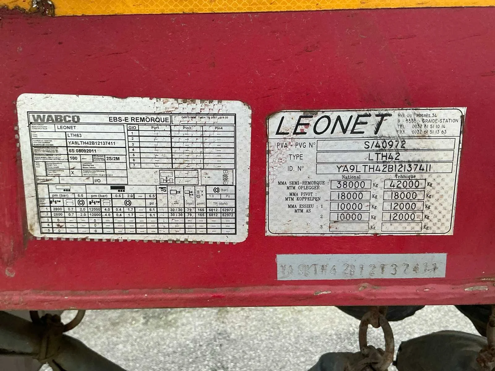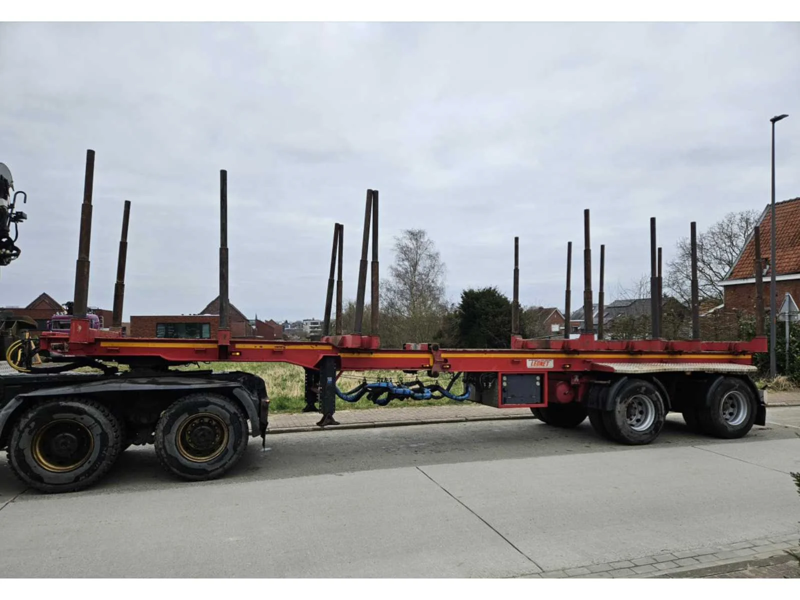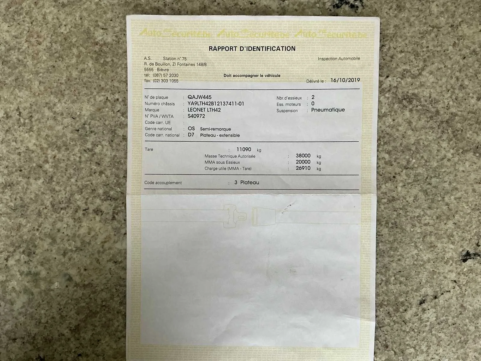 2013 Leonet LTH42 Oplegger - 2 hydraulische meesturende assen. - Boompalen In perfecte en recht staat. - telescopisch uitschuifbaar van 11,7M tot 17,2. - Technische aslast tot 12T. - Pneumatische ophanging - Beschikt over meerdere handige materiaalkoffers Deze praktische oplegger voor bomentransport is in uitstekende en perfect werkende staat, meteen inzetbaar voor het zware werk. Aangekoppelde vrachtwagen niet inbegrepen in dit lot. No Merk: Leonet Type: LTH42 Bouwjaar: 2013 Chassisnummer VIN: YA9LTH42B12137411 APK vervaldatum: 16/10/2025 Aantal assen: 2 Laadvermogen: 26910kg Eigen gewicht: 11090kg Totale afmeting L: 17200mm