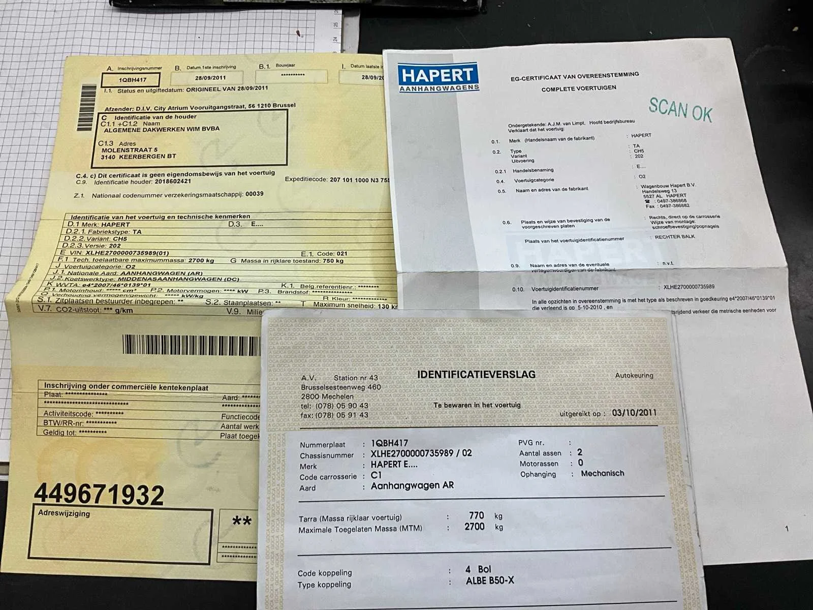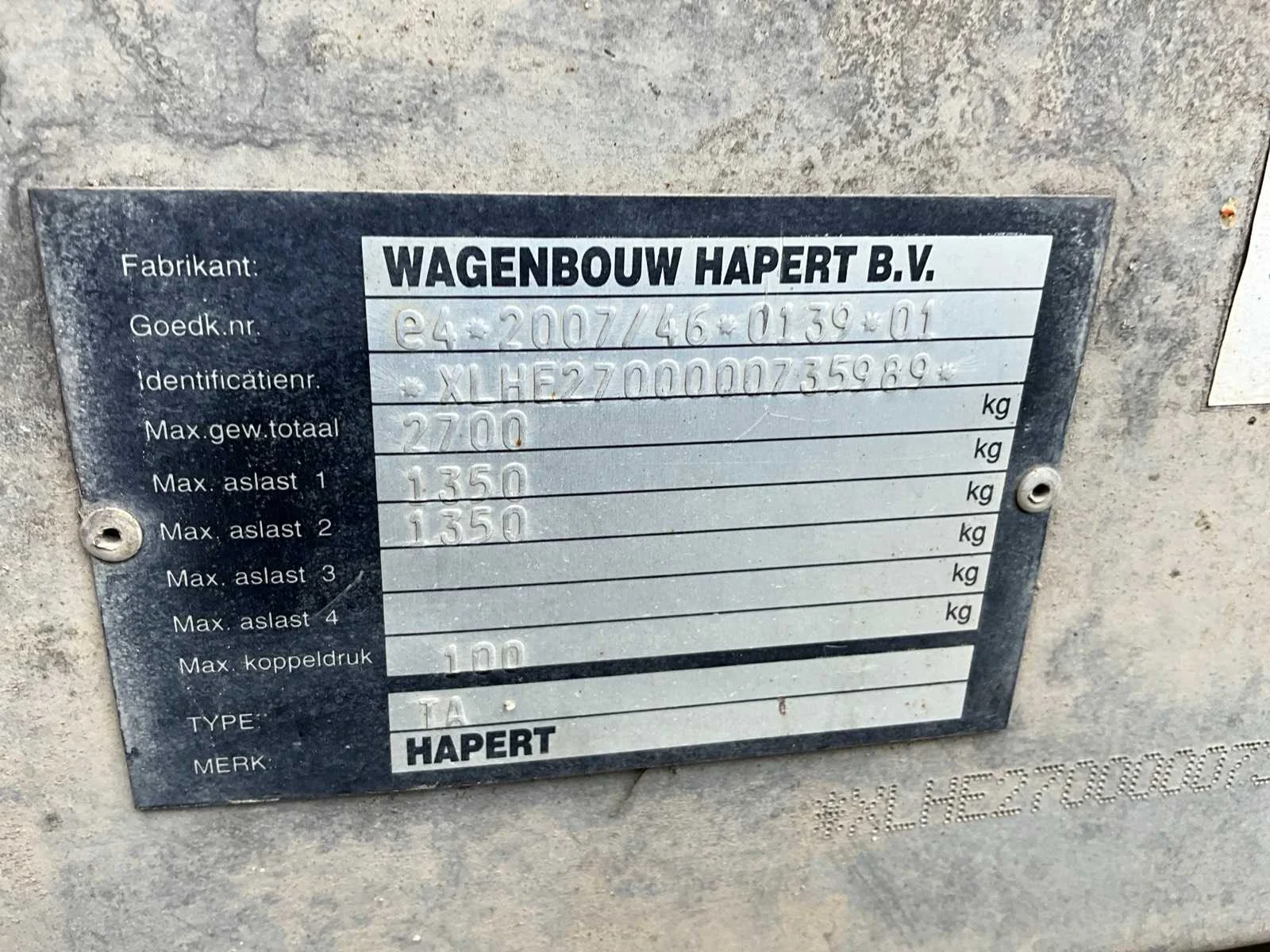 Belgische boorddocumenten enkel keuring ontbreekt, rest compleet, voorzien van aluminium zijborden, 3-zijdig kippen, electro hydraulische pomp met stroomstekker voor trekkend voertuig, steunwiel, gladde vloerplaat Nee Merk: Hapert Type: TA2700 Model: Kipper Bouwjaar: 2011 Chassisnummer: XLH52700000755969 Aantal assen: 2 Laadbak afmeting l: 305cm Laadbak afmeting b: 181cm Ledig gewicht: 770kg Laadvermogen: 2700kg Datum eerste toelating: 28-09-2011 Hoogte: 174cm Lengte: 430cm Breedte: 200cm Nationaliteit documenten: Belgische