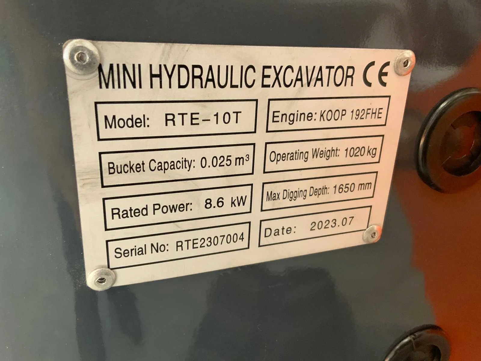 Maximale graafdiepte 1650mm; graafbak capaciteit 0,025 m³; Hoogte bulldozerplaat 345mm; 360 graden roteren; lamp op de arm; 5789 Nee Merk: RTE Type: CRE102 Bouwjaar: 2025 Merk motor: Koop 192FHE Motorvermogen (kW): 8.60kW Aantal cilinders: 1 Brandstof: diesel Rups breedte: 180mm Afgelezen urenstand: 1 Eigen gewicht: 1020kg Totale afmeting L: 2770mm Totale afmeting Breedte: 940mm Totale afmeting Hoogte: 1480mm