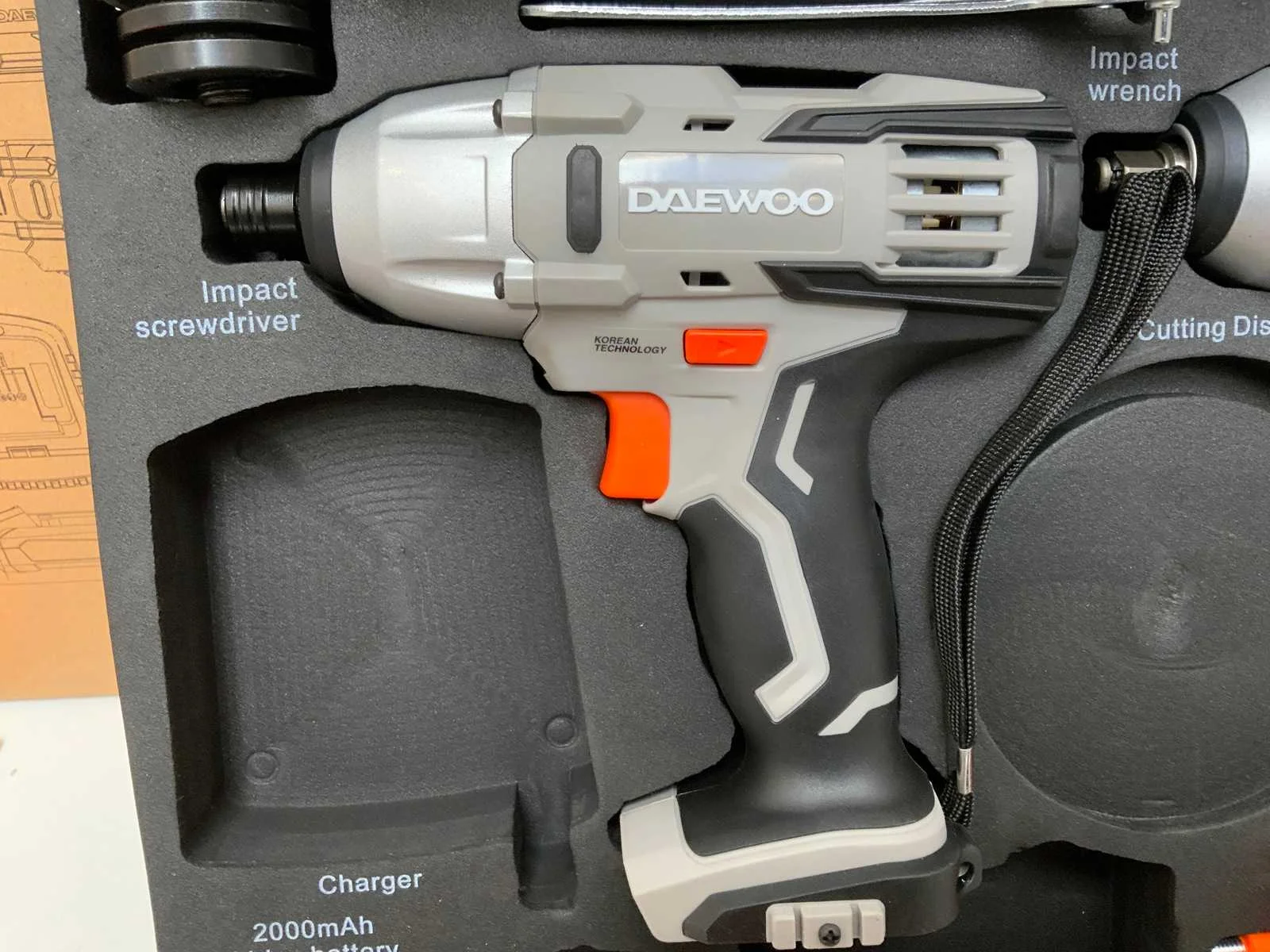 2x accu 20V; 9 delige boorset; schroef-boormachine; haakse slijper; slagmoermachine; moerklopper; met inlay; 4 slijpschijven; in orginele verpakking; 5596 Nee Merk: Daewoo Type: U force 4 in 1 Accu lader: true