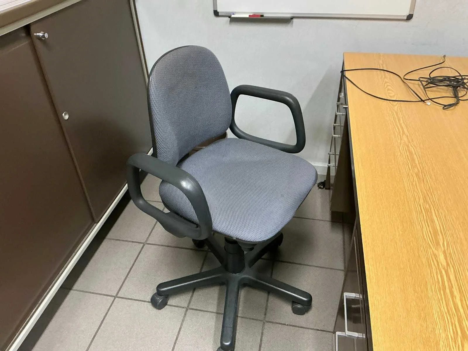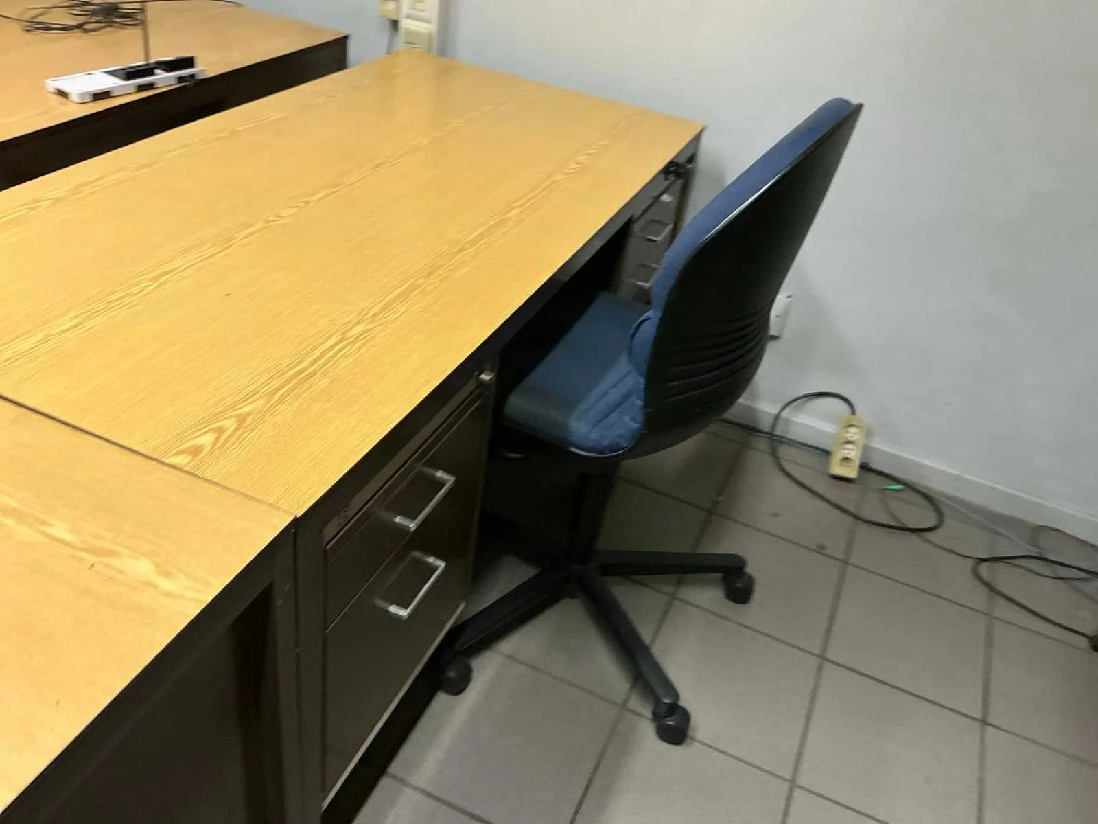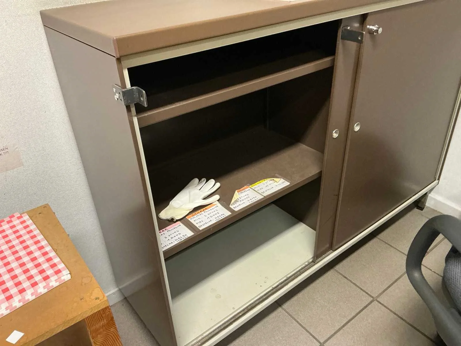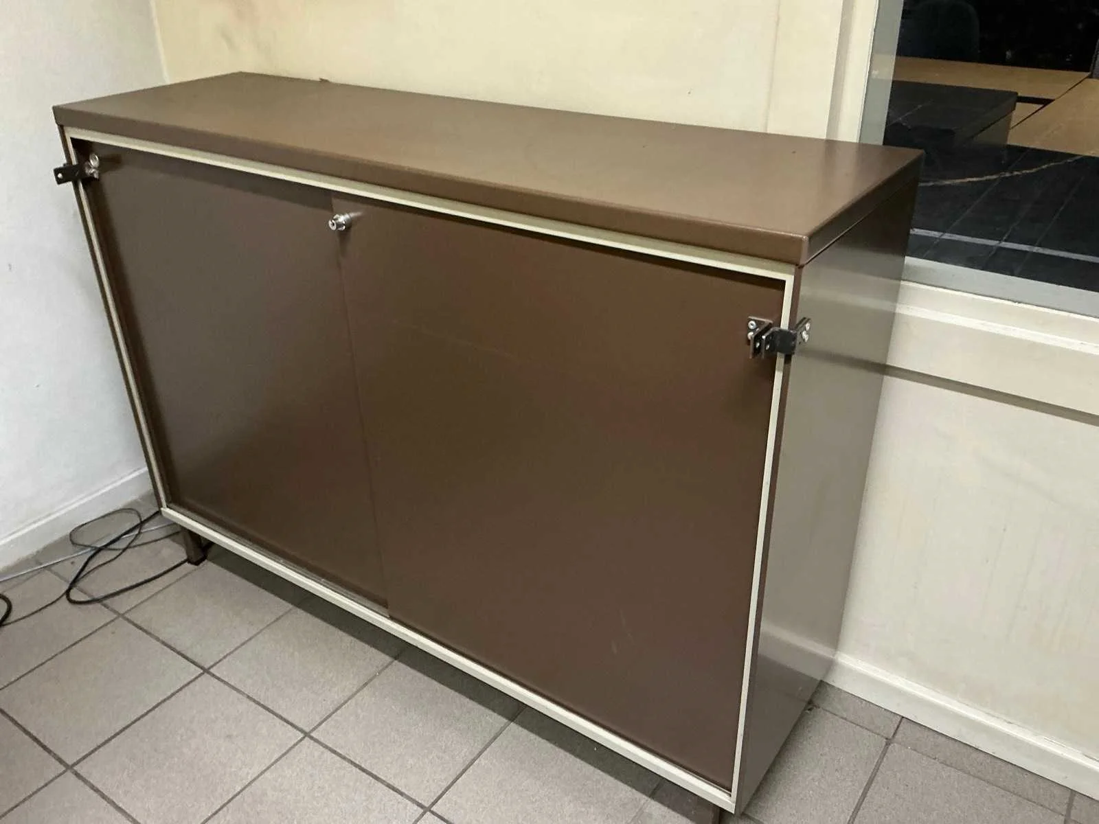 Bestaande uit 3 vintage bureaus 75x150xH75cm, kapstok, 2 schuifdeurkasten 45x150xH107cm, 3 bureaustoelen en vuilnisemmer, zijnde inhoud lokaal, koper dient alles mee te nemen Nee