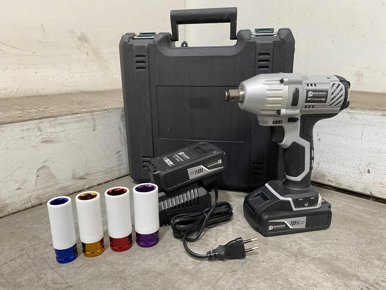 <li><b>Accu slagmoersleutel</b></li> <li><b>Koppel:</b> 330 Nm</li> <li><b>Voltage:</b> 18 volt</li> <li><b>Accu:</b> 2.0 Ah accu</li> <li><b>Toeren per minuut:</b> 3000 RPM</li> <li><b>Aantal accu’s:</b> 2 accu’s</li> <li><b>Acculader:</b> Acculader inbegrepen</li> <li><b>Inbegrepen:</b> 4 slagmoer doppen (maten: 17-19-21-22 mm)</li> <li><b>Voorzien van:</b> Werklamp en batterij indicator</li> <li><b>Staat:</b> Ongebruikt, in de originele verpakking</li> Nee Merk: Stahlgruppe