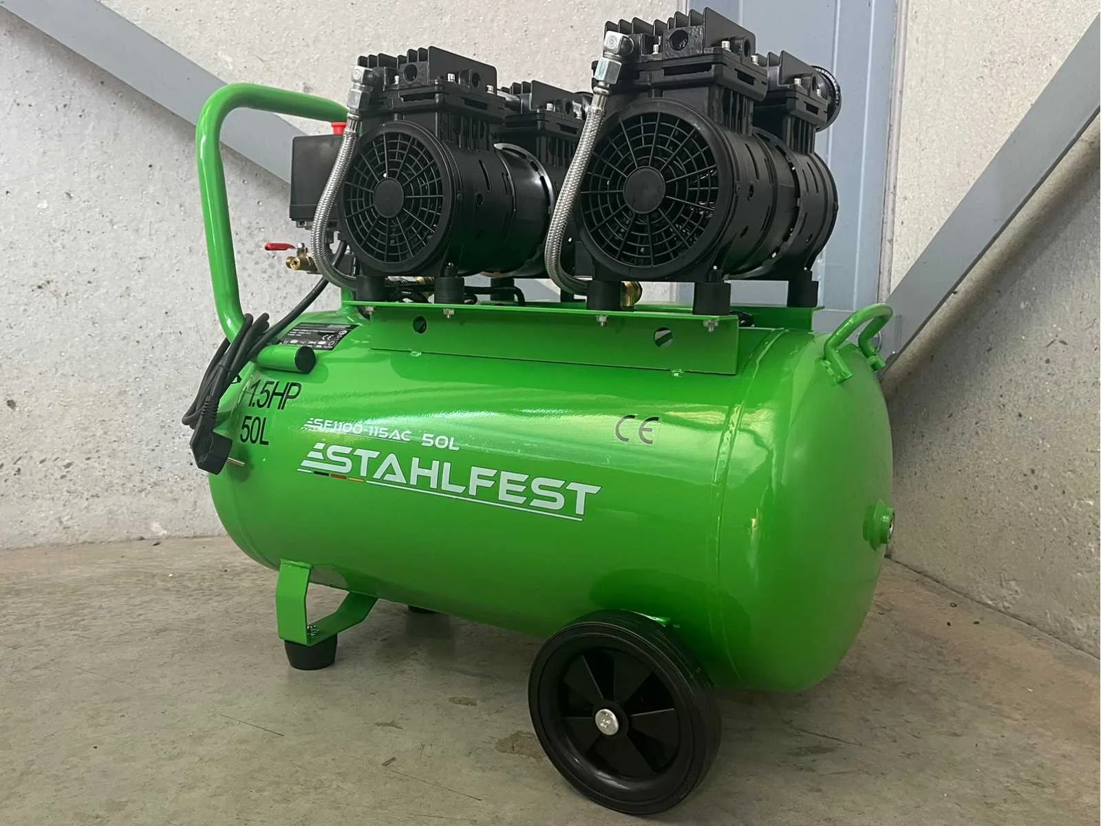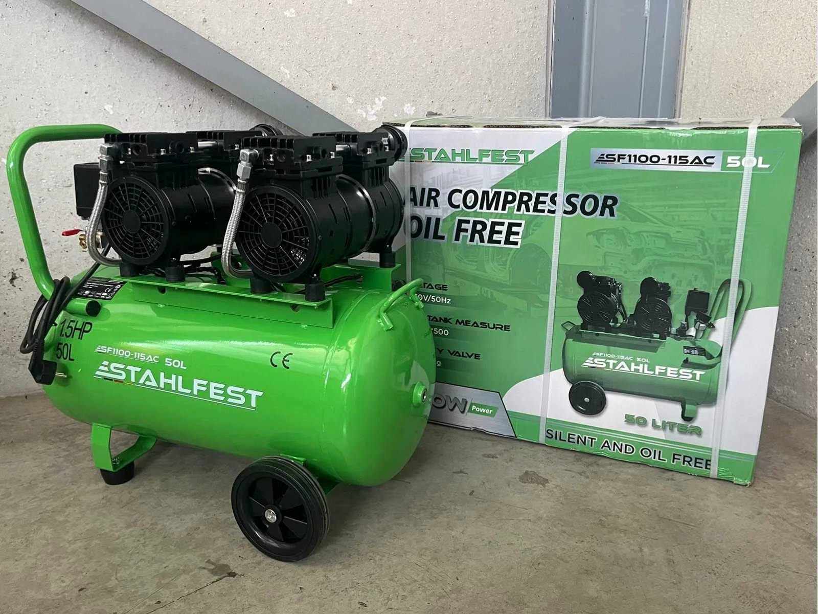<li><b>olievrije luchtcompressor</b></li> <li><b>eigenschap:</b> super stil</li> <li><b>buffertank:</b> 50 liter buffertank</li> <li><b>luchtstroom:</b> 204 liter per minuut</li> <li><b>uitgangen:</b> 2 uitgangen</li> <li><b>capaciteit:</b> 8 bar / 115 psi</li> <li><b>motorvermogen:</b> 1100 watt</li> <li><b>aansluiting:</b> 230 volt</li> <li><b>handleiding:</b> inclusief handleiding</li> <li><b>staat:</b> ongebruikt, in de originele verpakking</li> Nee Merk: Stahlfest Type: 50 liter