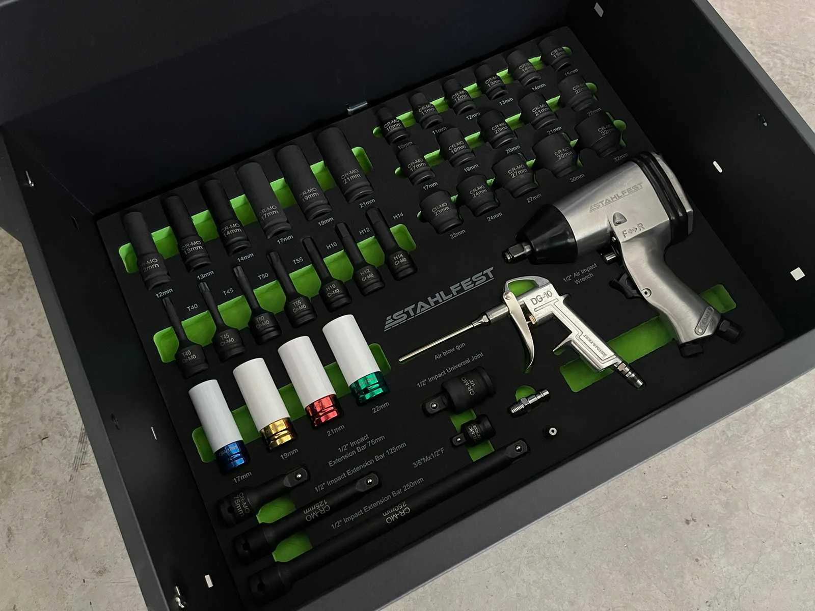 <li><b>pneumatische slagmoersleutel set</b></li> <li><b>Bestaande uit:</b> <ul> <li>pneumatische slagmoersleutel</li> <li>16 stuks Cr-Mo 6-kant doppen (10-32 mm)</li> <li>6 stuks Cr-Mo 6-kant doppen extra lang(12-21 mm)</li> <li>4 stuks Torx Cr-Mo doppen (T40-T45-T50-T55)</li> <li>3 stuks inbus Cr-Mo doppen (H10-H12-H14)</li> <li>4 stuks Cr-V 6-kant doppen (17-19-21-22)</li> <li>3 stuks Cr-Mo verlengstukken (75-125-250 mm)</li> <li> Cr-Mo kniestuk</li> <li> Cr-Mo verloopstuk (3/8”Mx1/2”F)</li> <li>persluchtpistool met accessoires</li> </ul> </li> <li><b>Goed om te weten:</b> foam inlay voor de laden van een gereedschapswagen</li> <li><b>Afmeting:</b> 52,5 x 39 cm</li> <li><b>Staat:</b> Ongebruikt, in de originele verpakking</li> Nee Accu lader: true Accuspanning: 20V Aantal accu's: 2
