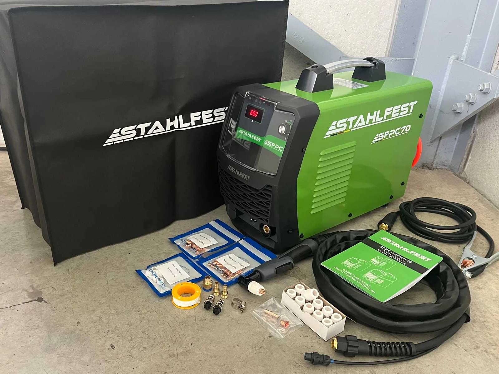 <p><strong>perslucht plasmasnijmachine</strong></p> <li><strong>merk:</strong> Stahlfest</li> <li><strong>type:</strong> SFPC70</li> <li><strong>maximale snijdikte:</strong> max. snijdikte 20 mm</li> <li><strong>aansluiting:</strong> 380 volt</li> <li><strong>regelbare stroomsterkte:</strong> 20A - 60A</li> <li><strong>starten:</strong>scratch-start</li> <li><strong>inschakelduur:</strong> 60% inschakelduur (60A)</li> <li><strong>technologie:</strong> IGBT-technologie</li> <li><strong>beveiliging:</strong> zekeringautomaat</li> <li><strong>inclusief:</strong> plasmatoorts, toebehoren en beschermhoes</li> <li><strong>niet inbegrepen:</strong> 380 volt stekker</li> <li><strong>staat:</strong> ongebruikt en in de originele verpakking</li> Nee Merk: Stahlfest Type: SFPC70