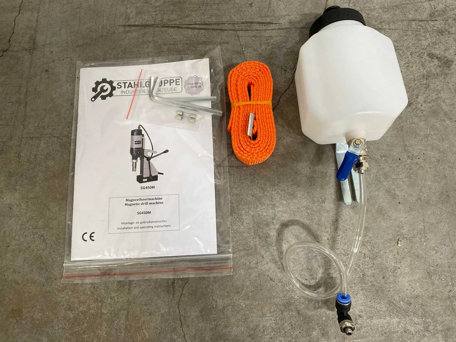 <ul> <li><b>magneetboormachine</b></li> <li><b>Merk:</b> Stahlgruppe</li> <li><b>Type:</b> SG450M</li> <li><b>max. boordiameter:</b> 35 mm boordiameter</li> <li><b>vermogen:</b> 1600 watt</li> <li><b>aansluiting:</b> 230 volt</li> <li><b>magneetsterkte:</b> 16000 newton</li> <li><b>toerental:</b> 810 toeren</li> <li><b>boordiepte:</b> 145 mm boordiepte</li> <li><b>inclusief:</b> oliereservoir voor koelen en smeren</li> <li><b>beveiliging:</b> riem voor valbeveiliging</li> <li><b>staat:</b> ongebruikt, in de originele verpakking</li> </ul> Nee Merk: Stahlgruppe Type: SG450M