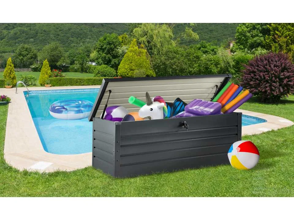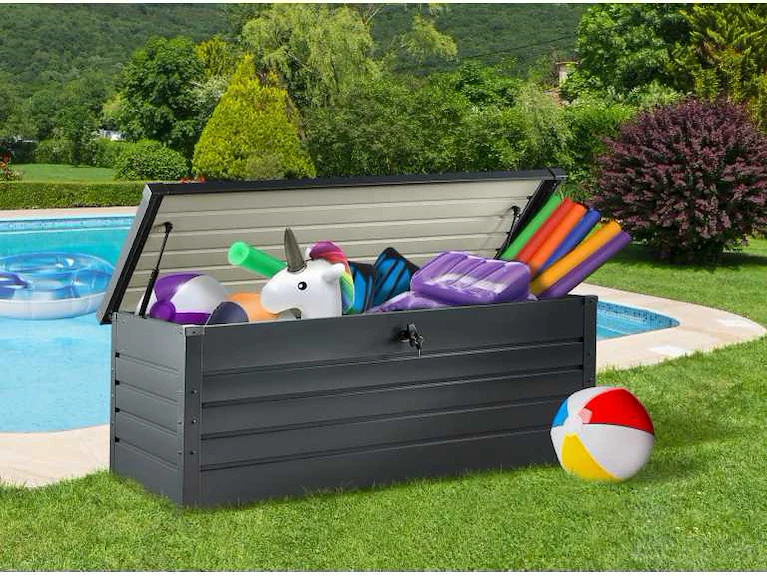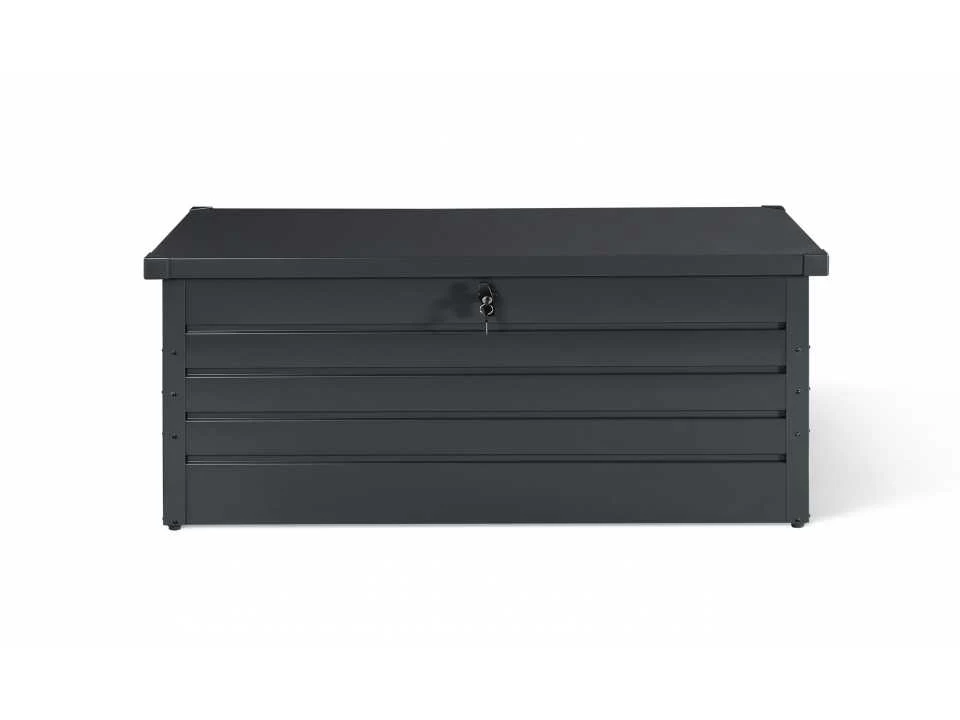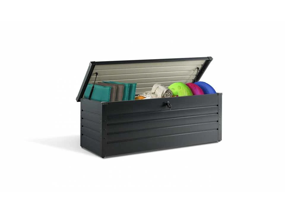 Standaard afmetingen: (L) 165 x (B) 70 x (H) 63 cm Interne afmetingen: (L) 160 x (B) 63 x (H) 57 cm Materialen: Gegalvaniseerd staal Kleur: Antracietgrijs Capaciteit: 600 L Slot (2 sleutels inbegrepen) Gasveren voor eenvoudig openen/sluiten Gewicht: 26.00 kg Non