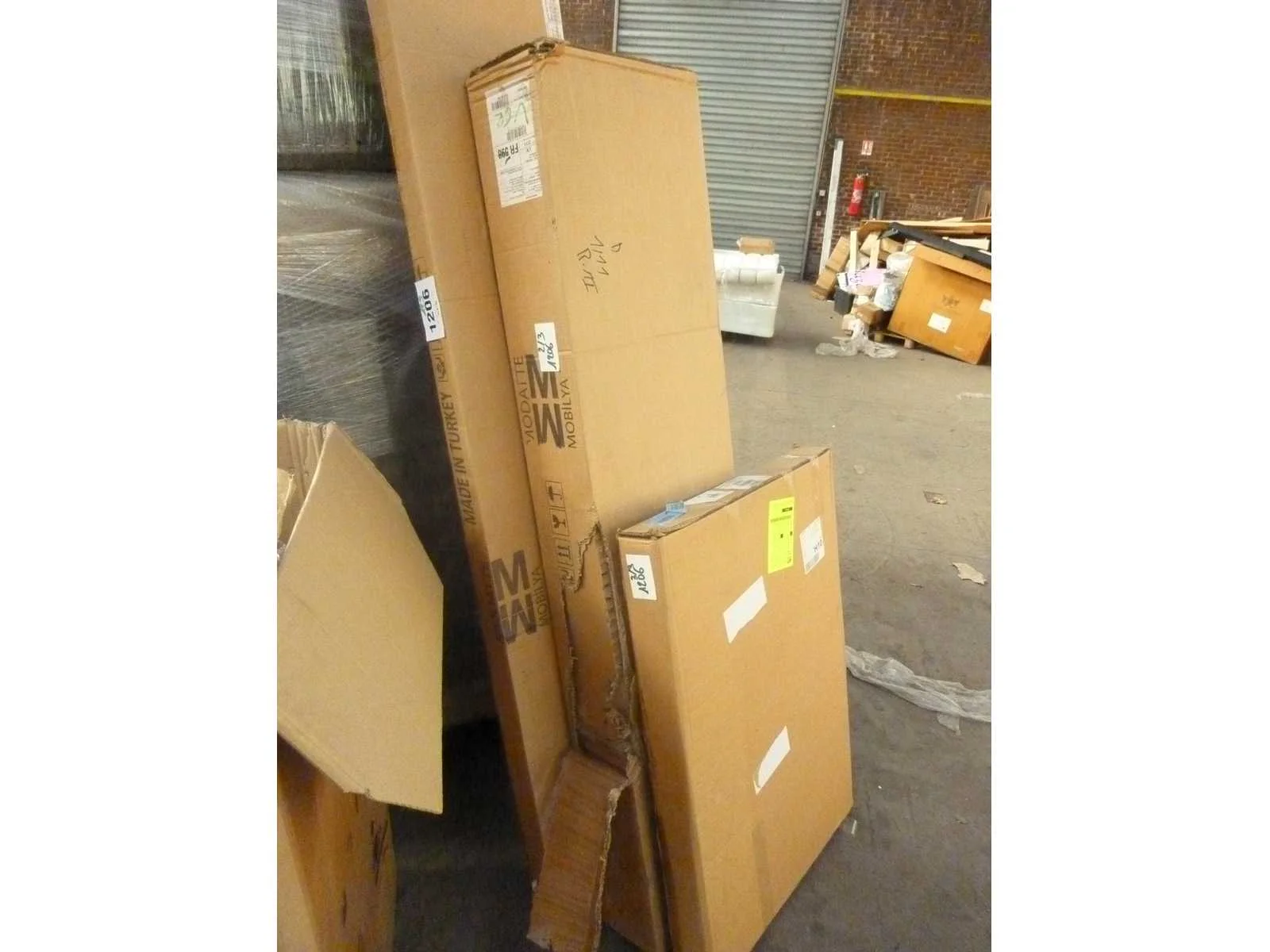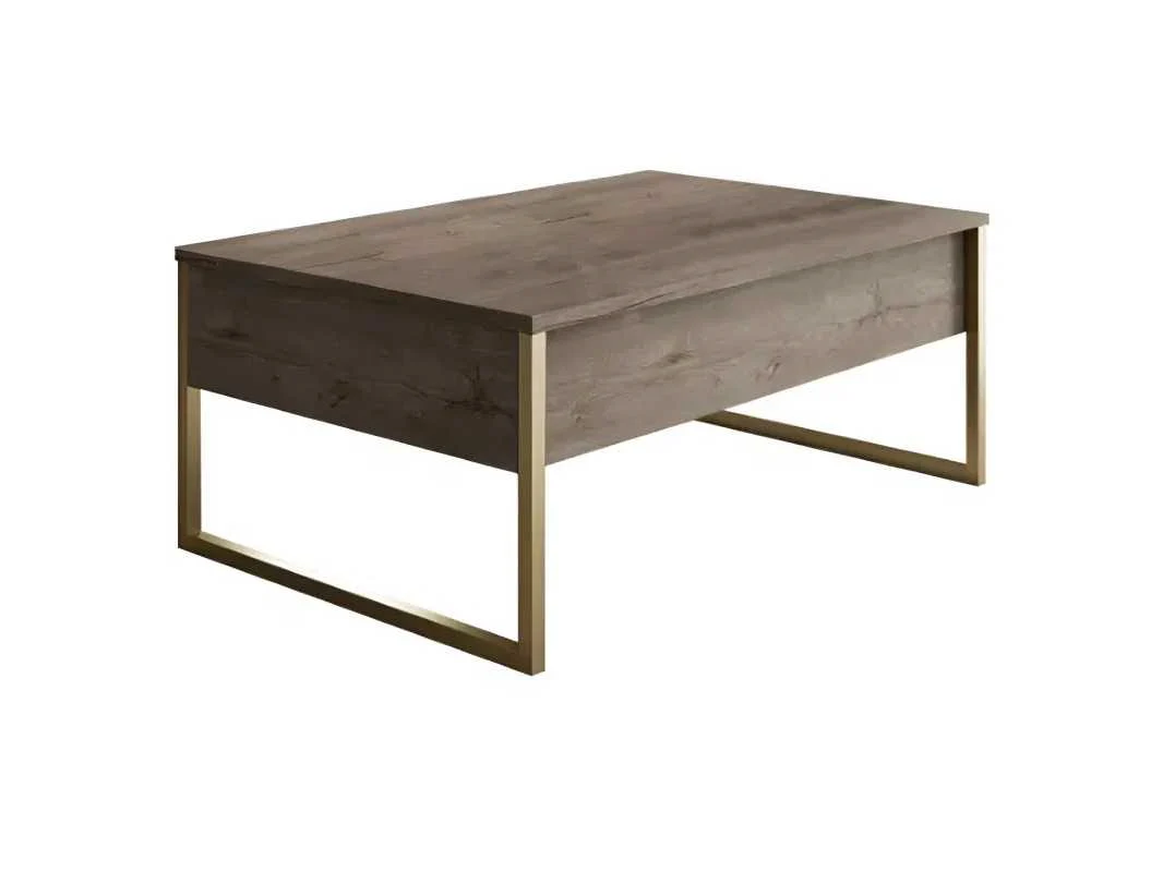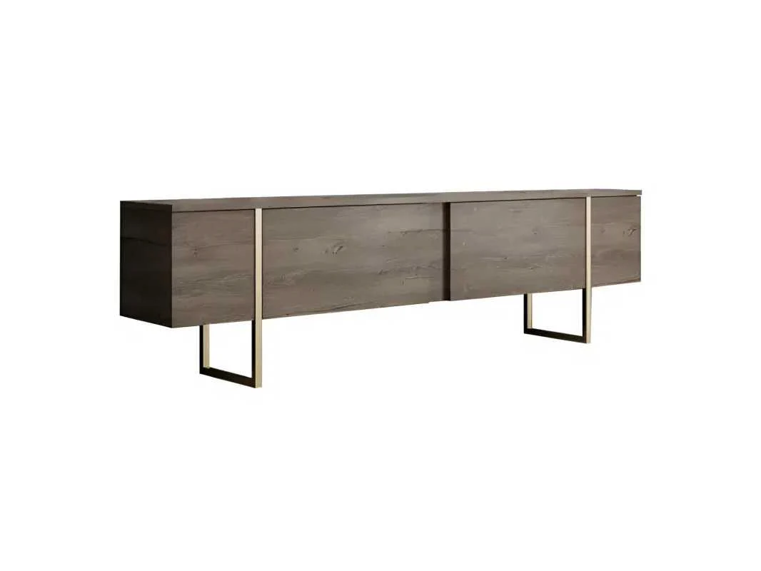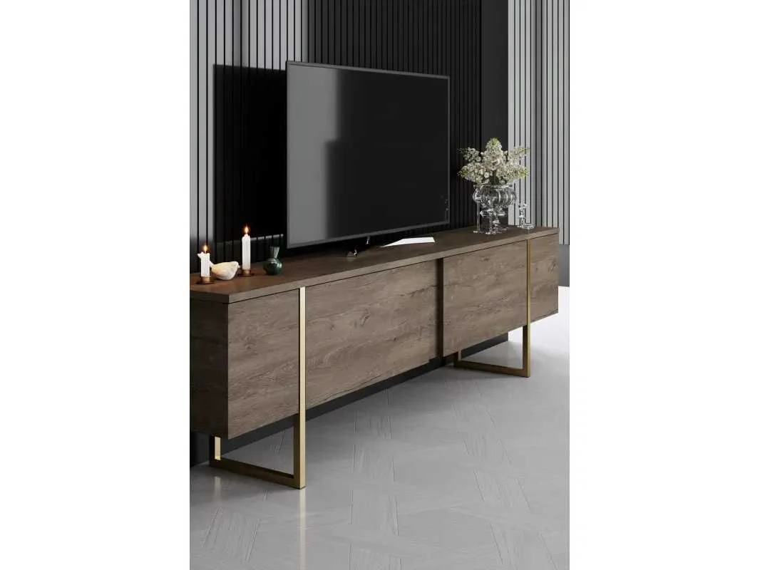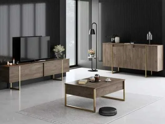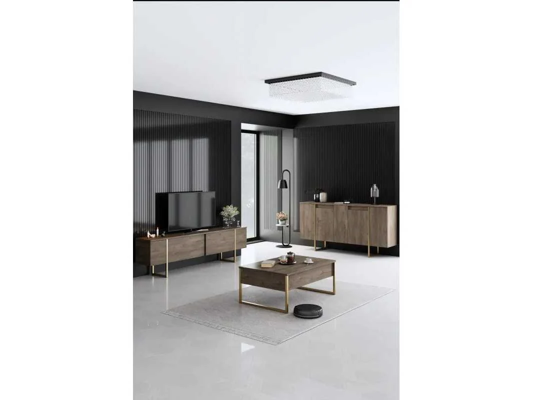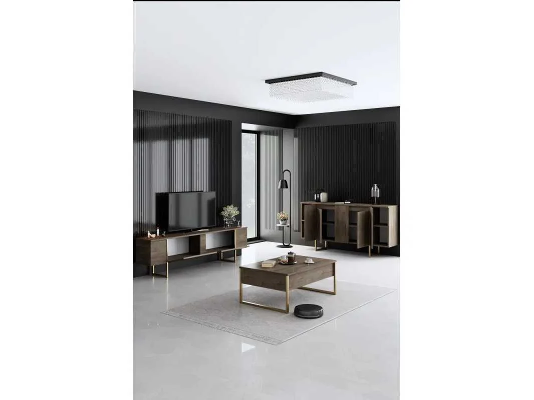 Woonkamer meubelset bestaande uit: een tv-meubel, een salontafel en een consoletafel. Materiaal: 1,8 cm dik spaanplaat, bekleed met melamine. Walnoot en goudkleurig. Drie meubelstukken in de set met metalen poten. Afmetingen van de tv-standaard: 180 cm lang x 50 cm hoog x 30 cm breed. Afmetingen salontafel: 90 cm lang x 40 cm hoog x 60 cm breed. Afmetingen console: 160 cm lang x 80 cm hoog x 35 cm breed. Non