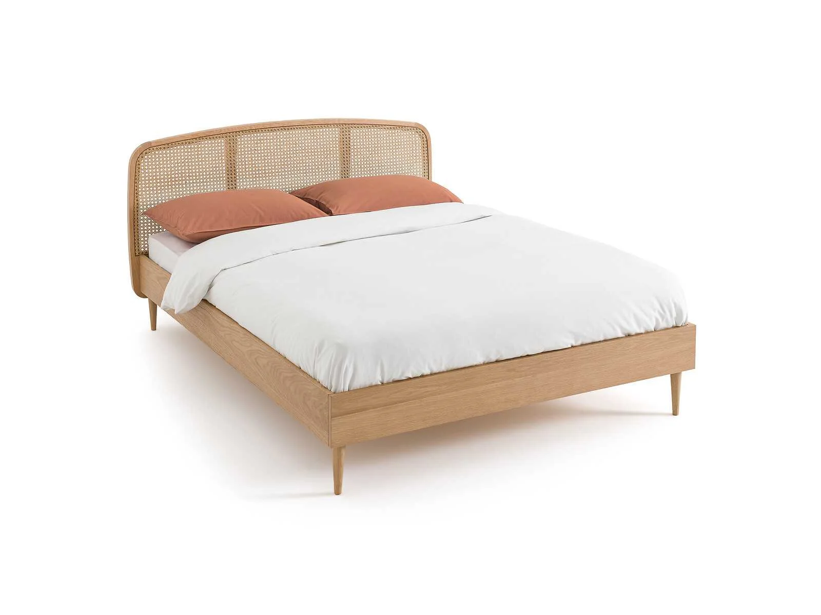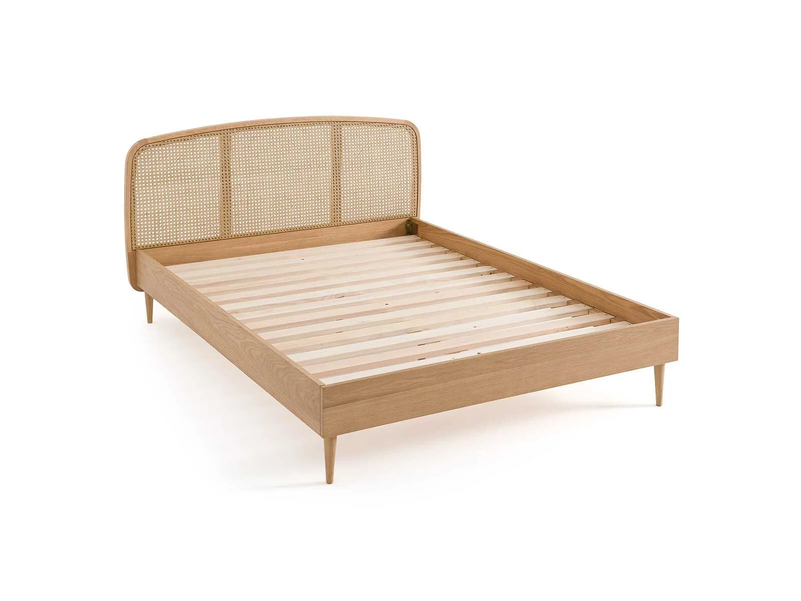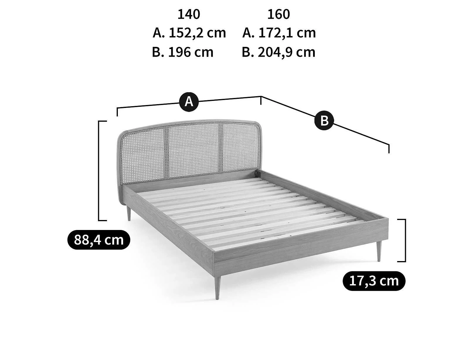 Beschrijving • Eiken en MDF structuur gefineerd met nitrocellulose vernis afwerking • Hoofdeinde van rotan en massief eiken rieten werk met nitrocellulosevernis afwerking • Taps toelopende poten in massief eiken met nitrocellulose vernis afwerking • Geleverd met massief grenen lattenbodem Grootte In slaapmaat 160 x 200 cm • Breedte: 172,1 cm • Hoogte: 88,4 cm • Lengte: 204,9 cm • Hoogte hoofdbord: 88,4 cm • Hoogte voet: 17,3 cm • Gewicht: 43 kg Non