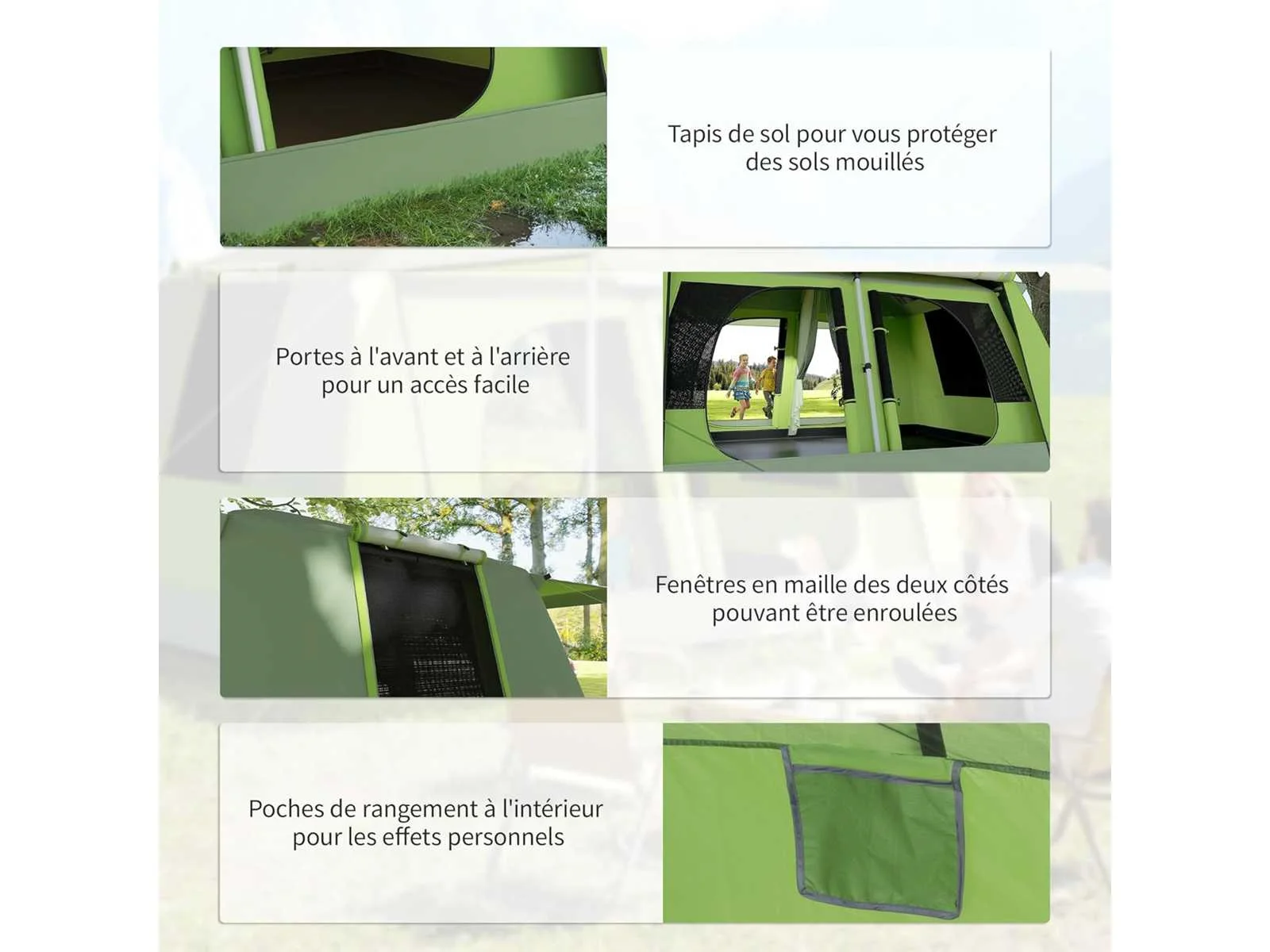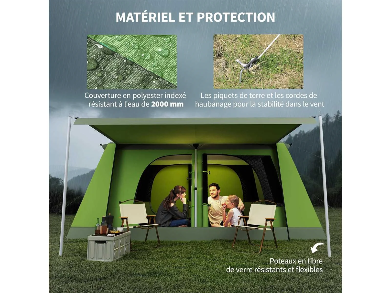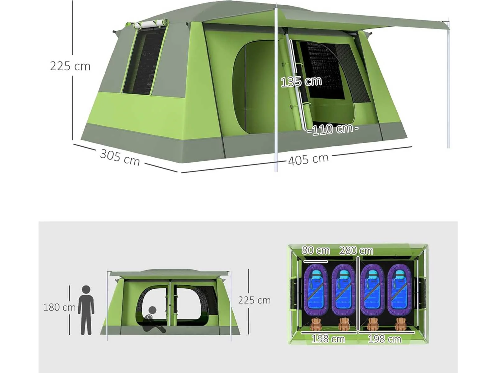 Kleur: groen Materialen polyester, glasvezel, metaal Totale afmetingen 405L x 305B x 225H cm Afmetingen eenpersoonskamer 198L x 280B x 220H cm Afmeting deur 110b x 135H cm Afmetingen raam 93b x 104H cm, 163L x 73l cm Afmeting: opbergtas 26B x 22H cm Non