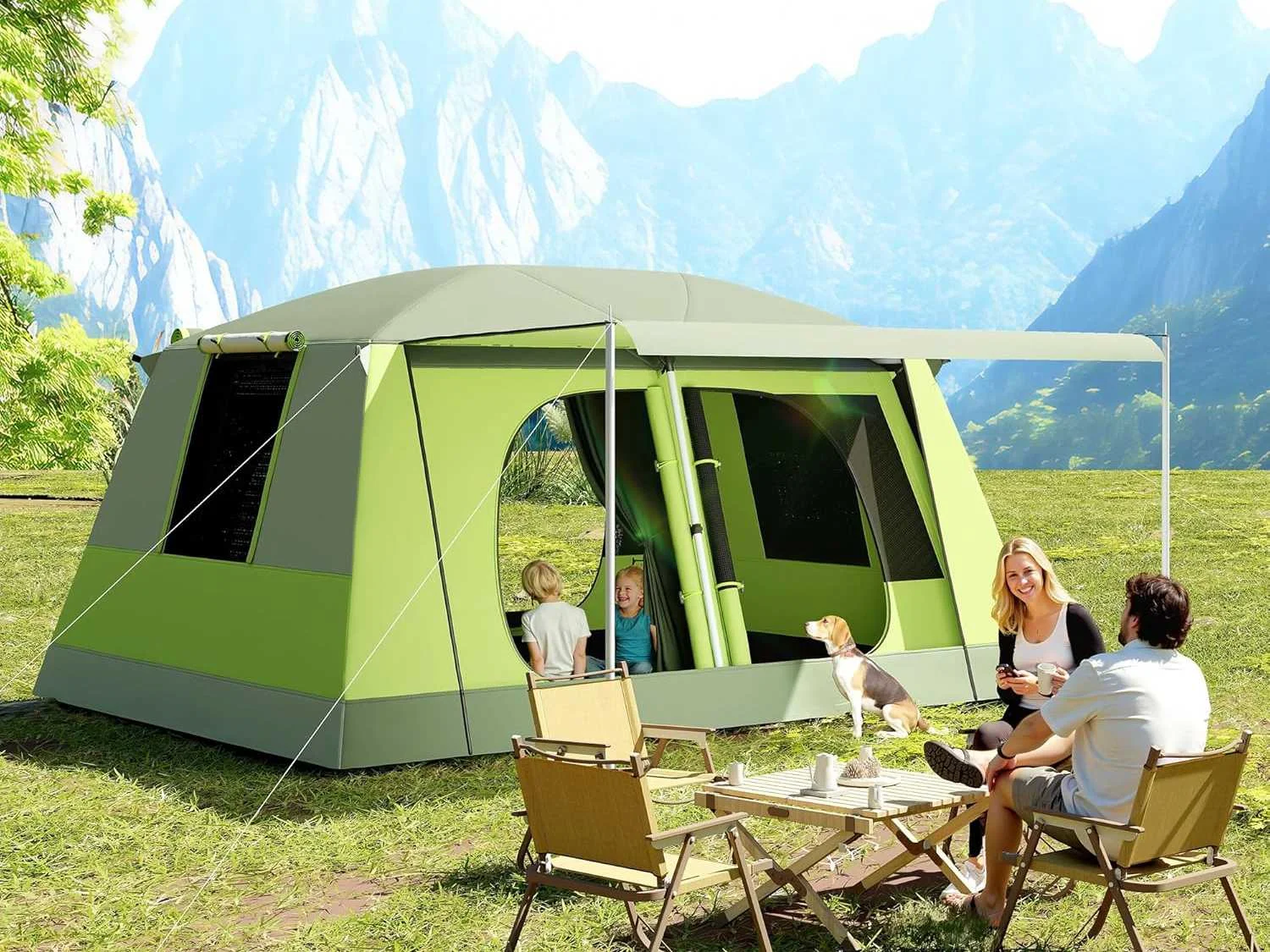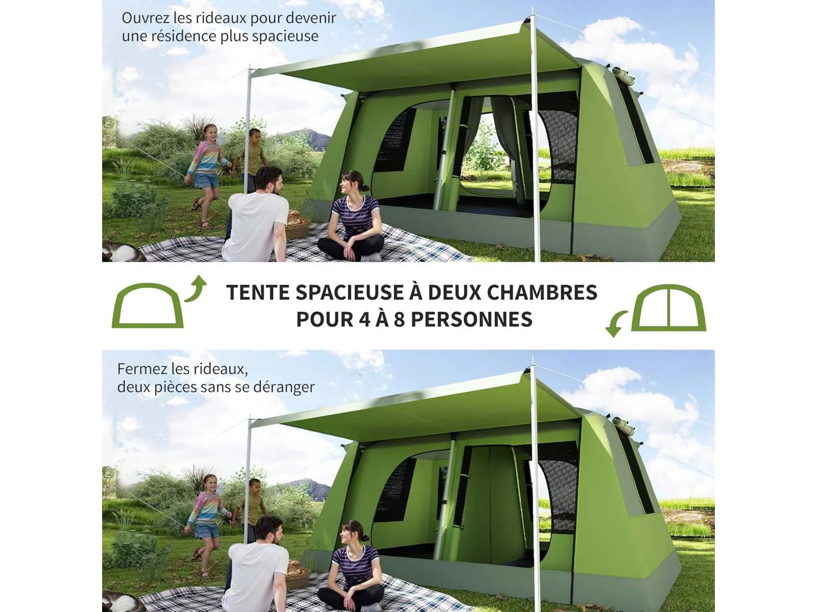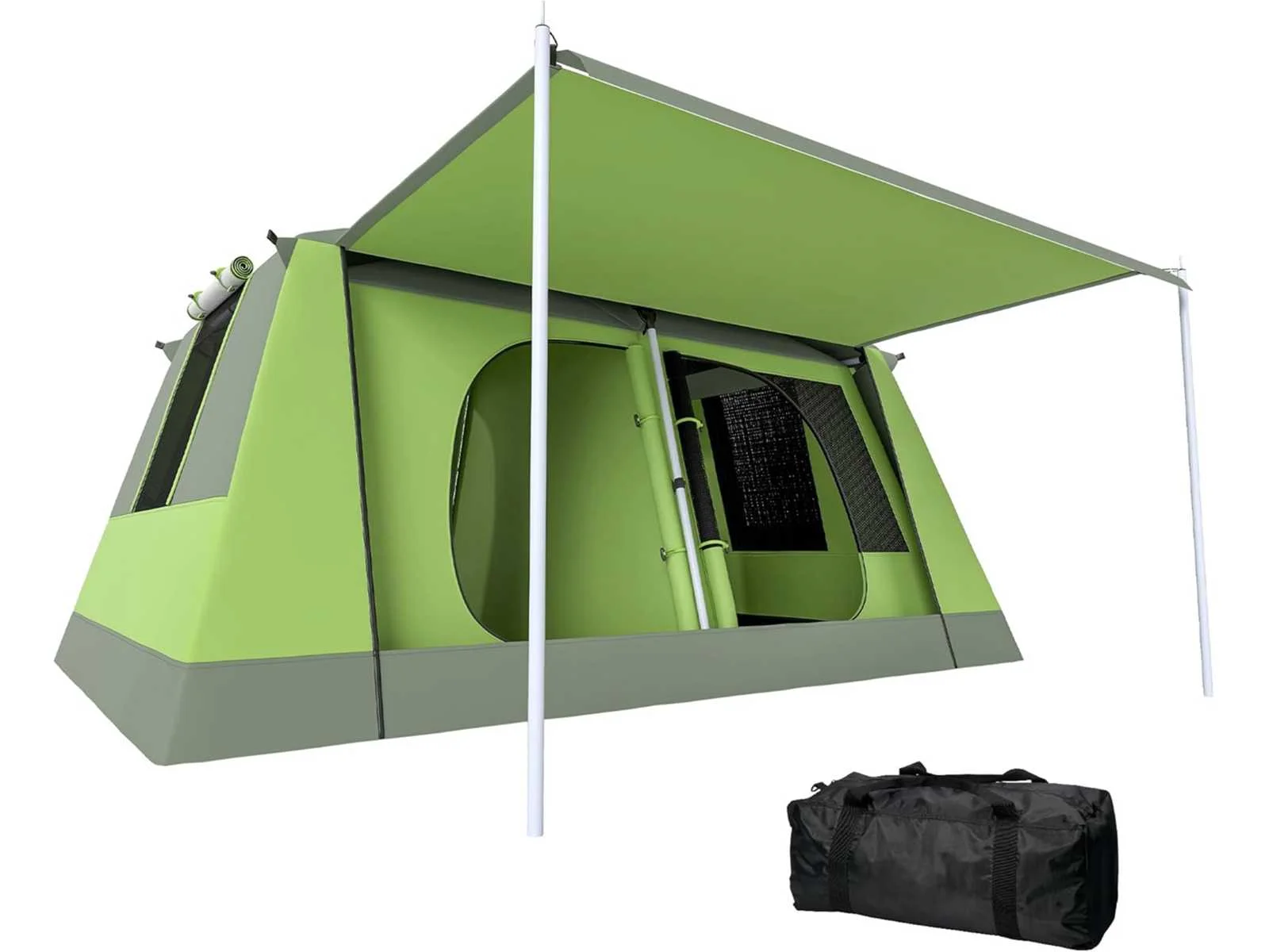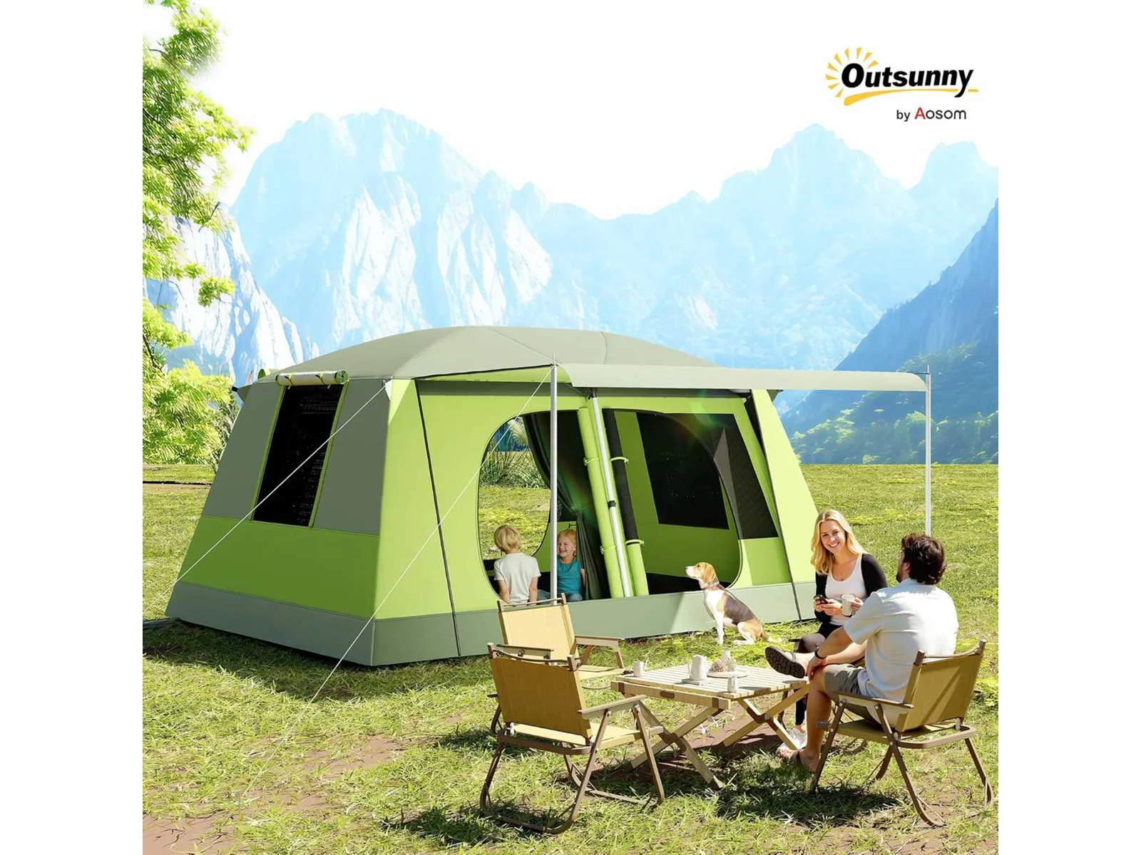 Kleur: groen Materialen polyester, glasvezel, metaal Totale afmetingen 405L x 305B x 225H cm Afmetingen eenpersoonskamer 198L x 280B x 220H cm Afmeting deur 110b x 135H cm Afmetingen raam 93b x 104H cm, 163L x 73l cm Afmeting: opbergtas 26B x 22H cm Non