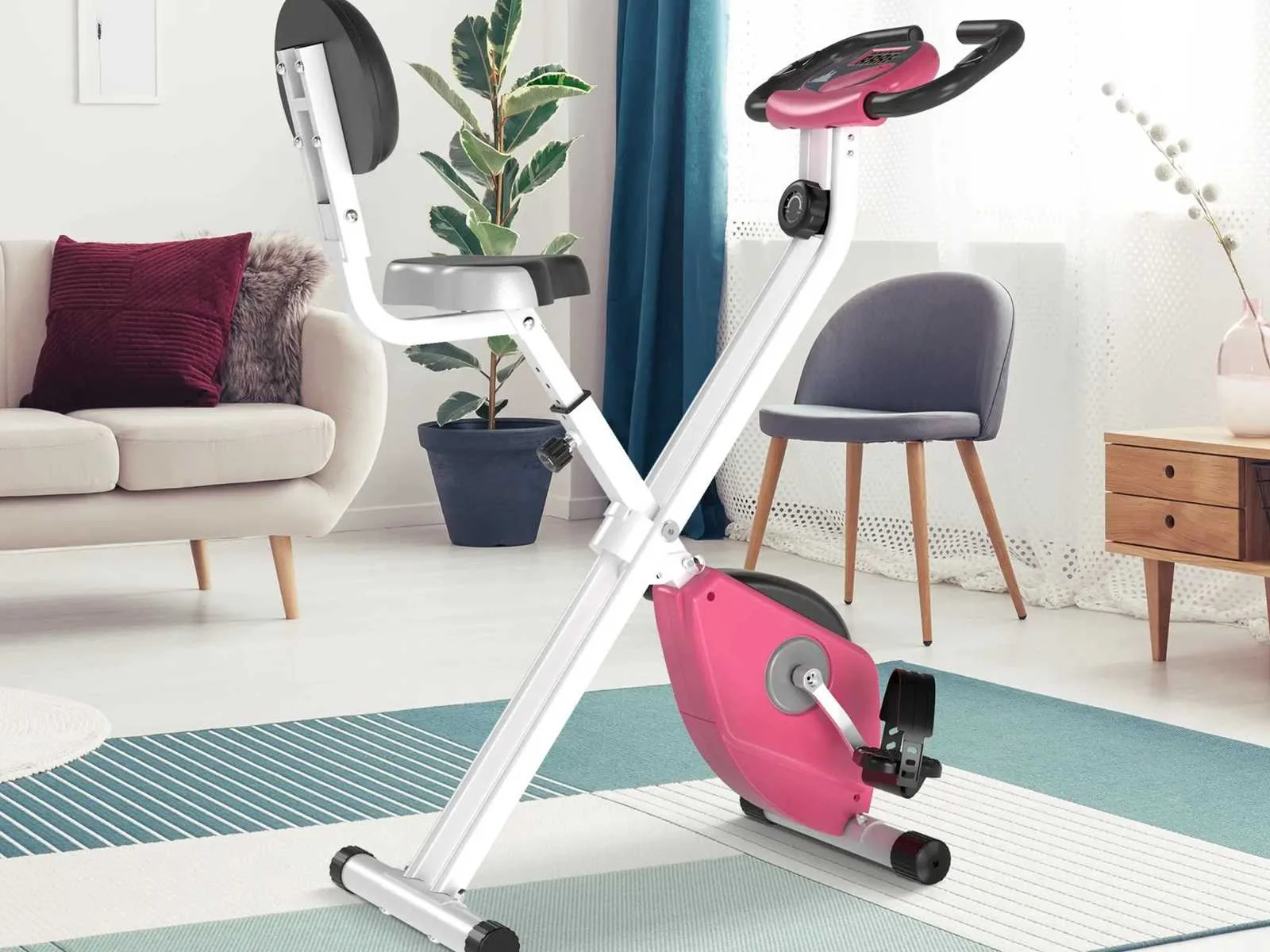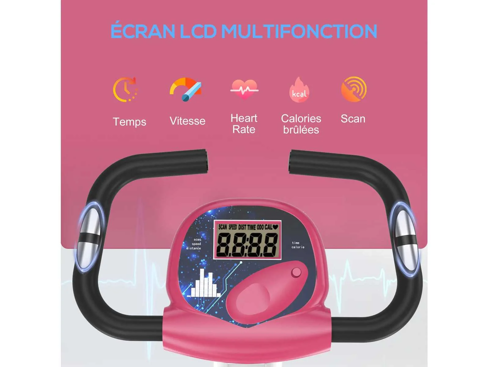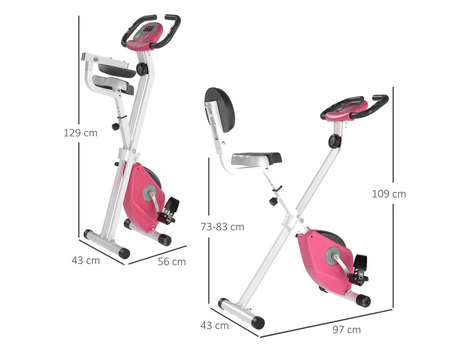 Specificaties: - Hoofdkleuren: roze, wit - Belangrijkste materialen: staal, ABS, PVC -Zon. uitgevouwen: 43L x 97B x 109H cm -Zon. opgevouwen: 43L x 56B x 129H cm -Zon. Zadel: 27L x 22I cm -Zon. Rugleuning: 24L x 20W cm - Verstelbare zadelhoogte: 73-83 cm -Zon. pedalen: 12L x 10I cm - Gewicht vliegwiel: 1,3 Kg - Aanbevolen maximale belasting: 110 Kg - LCD-, EMC- en RoHS-certificeringen Non