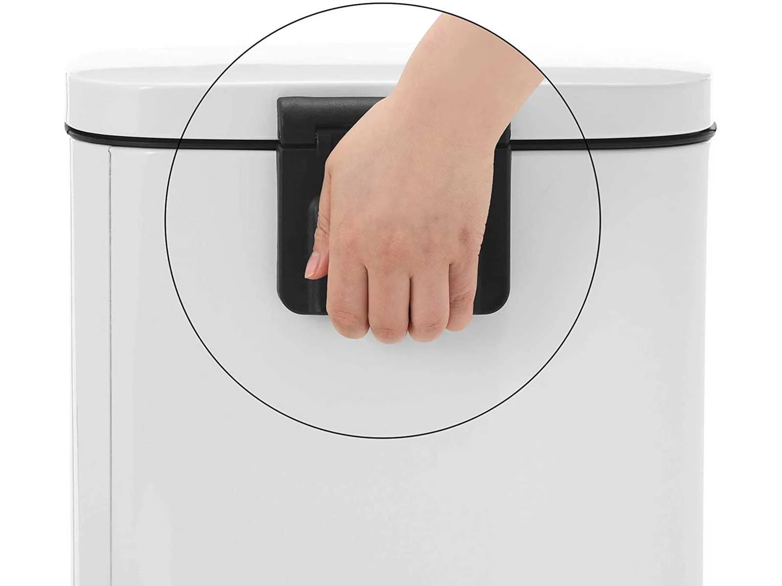 Karakteristiek: Kleur: Wit Materialen: Stalen vuilnisbak met poedercoating, kunststof binnenemmer Afmetingen van de afvalbak: 35 x 23,8 x 63 cm (L x B x H) Afmetingen interne emmer: 35 x 23,5 x 57,5 cm (L x B x H) Totale hoogte met open deksel: 85,5 cm Gewicht: 3,8 kg Non