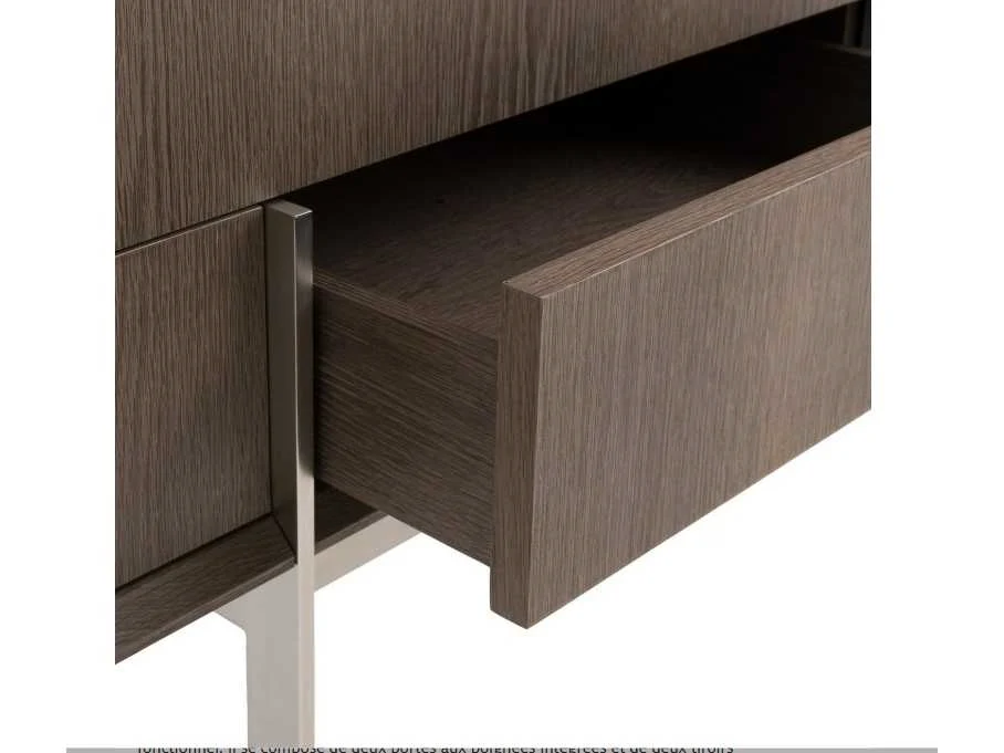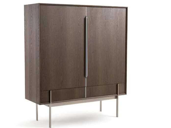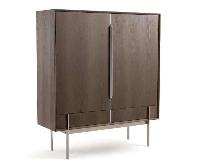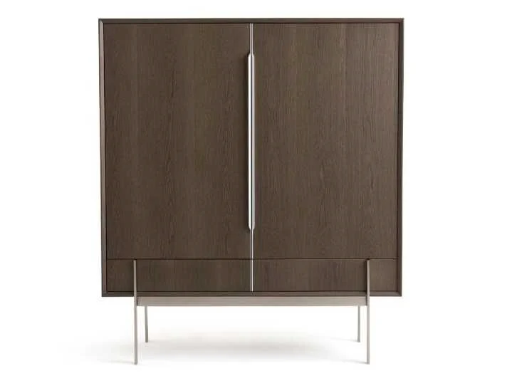 Beschrijving Kast, deuren en planken in FSC® gerookt eiken gefineerd MDF, nitrocellulose afwerking Voet en handgrepen in ijzeren metaal met satijnnikkel afwerking 8 nissen gevormd door 2 vaste legplanken en 4 uitneembare en verstelbare legplanken 2 kleine lades met push-pull openings-/sluitsysteem Kwaliteit Hardware van het Duitse merk: betrouwbaar, discreet en functioneel. Deze accessoires maken het gebruik van uw product gemakkelijker en zorgen voor een lange levensduur. Push/pull-openingssysteem: lichte druk op de lades maakt het mogelijk om ze te openen of te sluiten. Grootte Totaal Breedte: 130 cm Hoogte: 150 cm Diepte: 45 cm Nuttig Lade: B45 x H9 x D33 cm Nis: B62 x D40 cm Hoogte poot: 30 cm Dit product wordt kant-en-klaar verkocht. Non