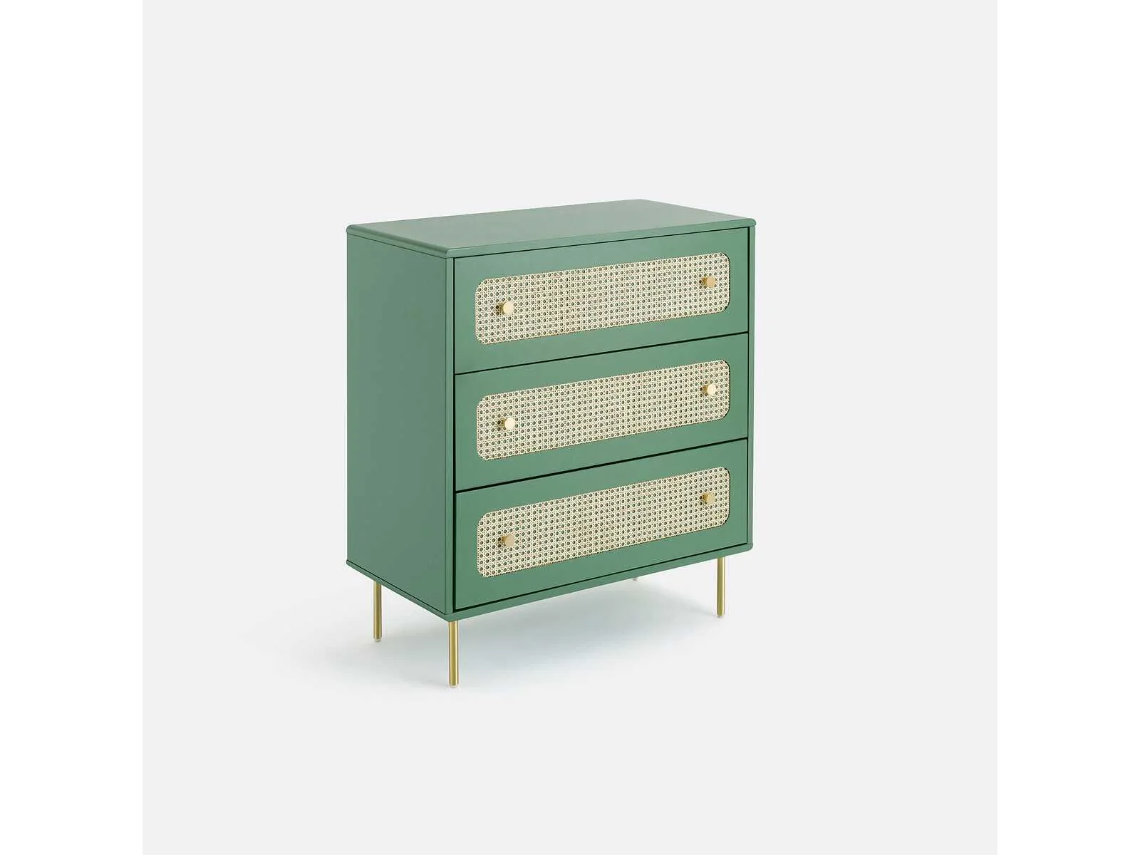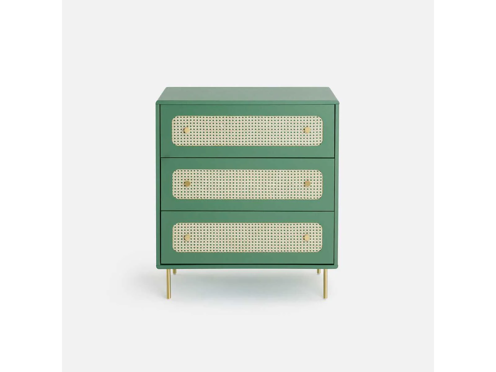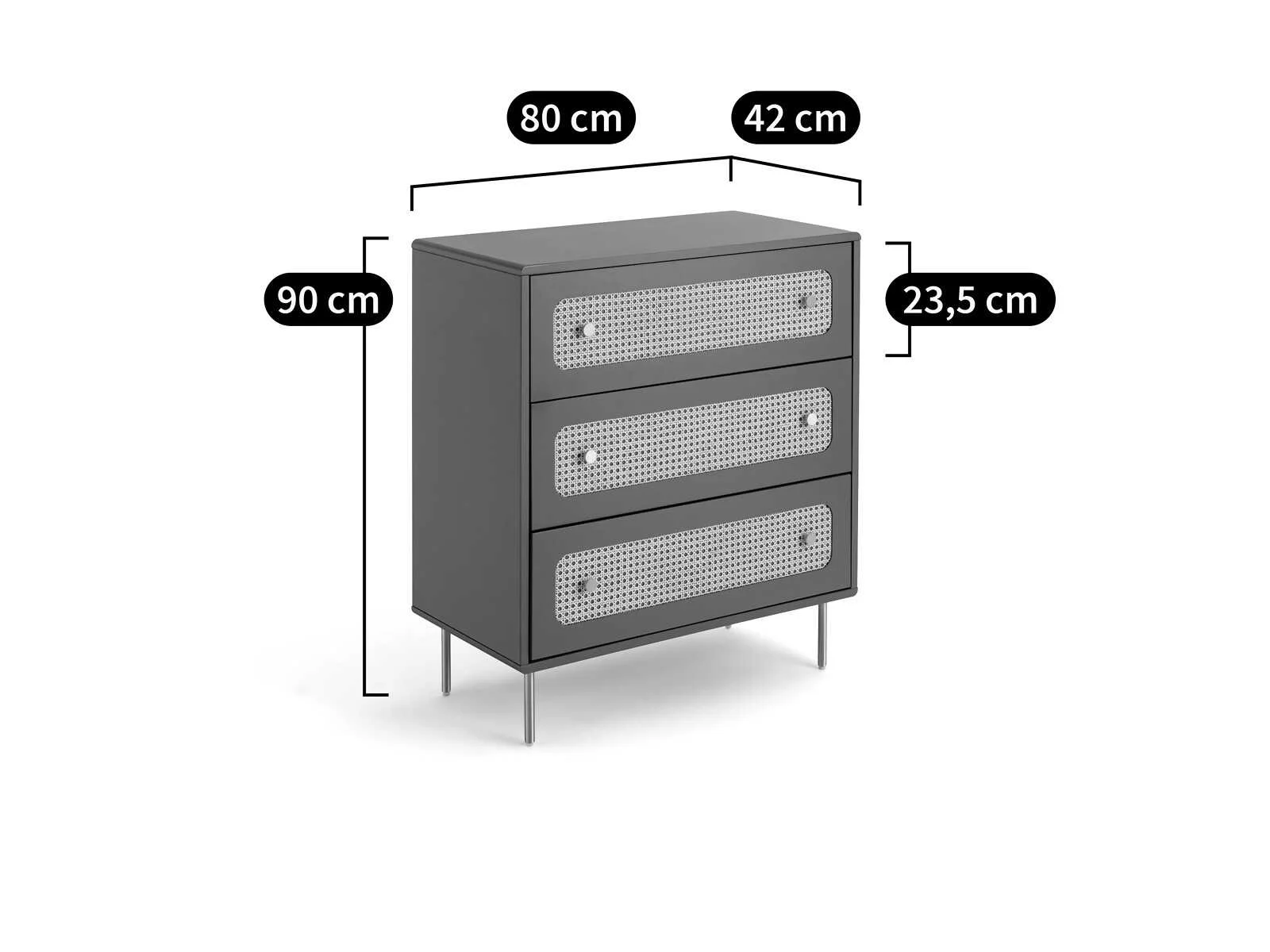 Beschrijving • MDF-structuur met acrylafwerking op waterbasis • Ladefronten met rieten detail • 3 lades • Mat geborsteld metalen onderstel en handgrepen Grootte Totaal • Breedte: 80 cm • Hoogte: 90 cm • Diepte: 42 cm Nuttig • Hoogte lade: 16 cm Non